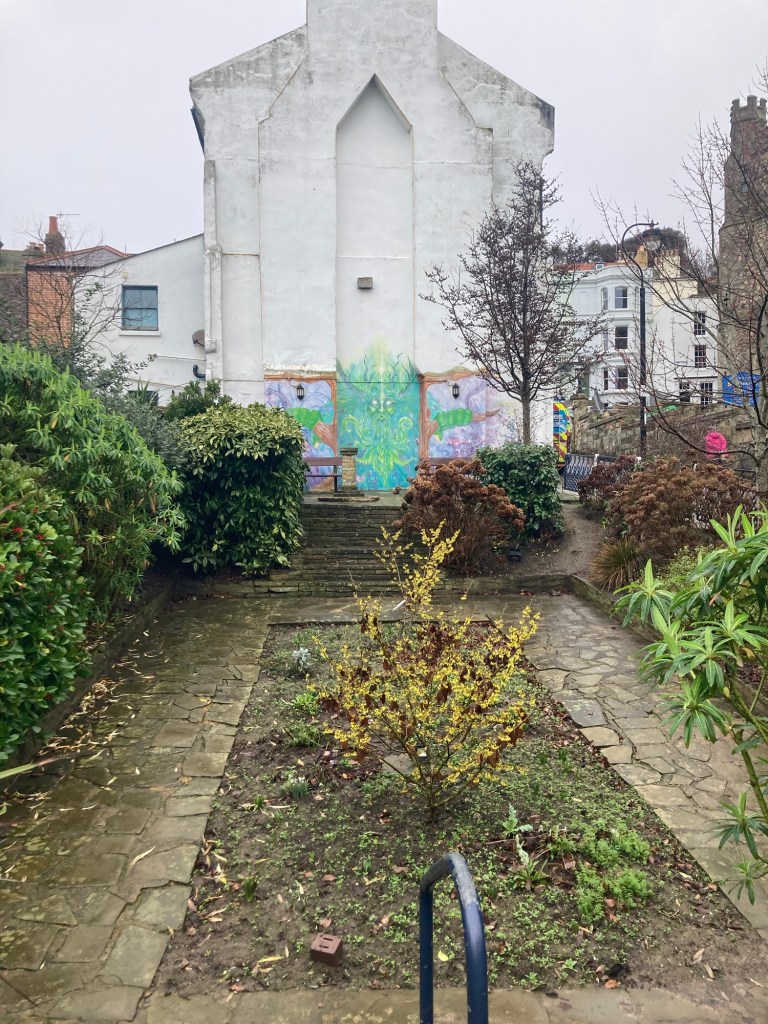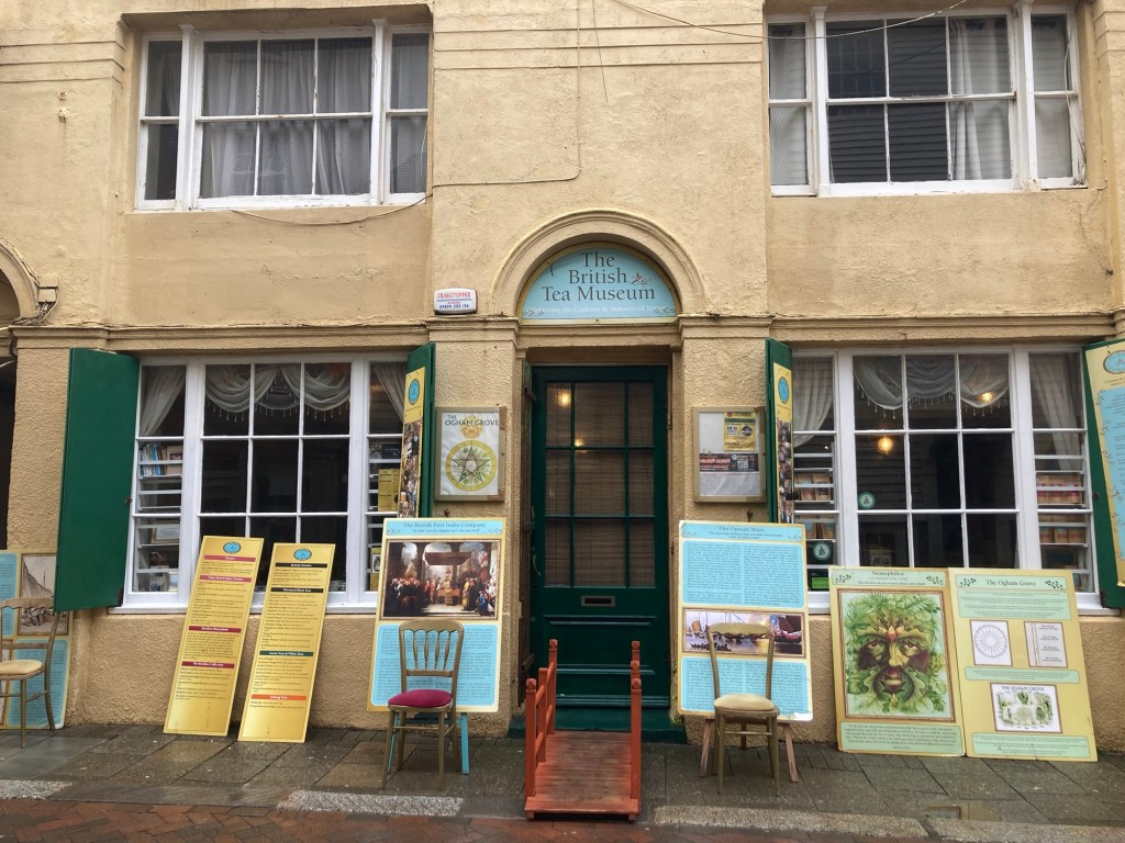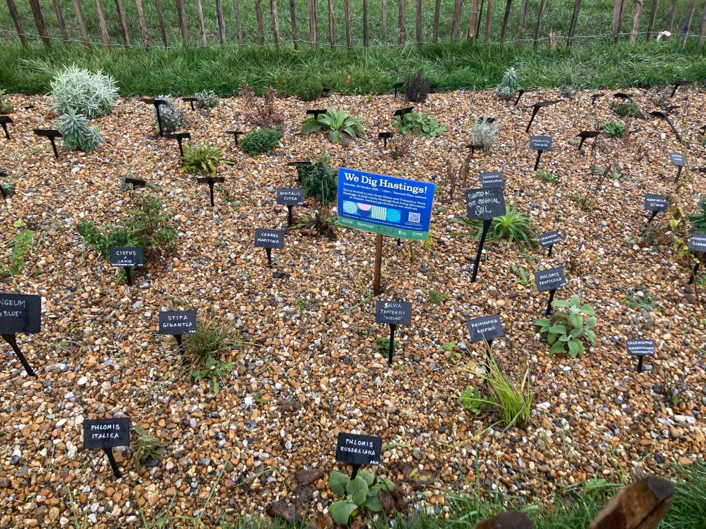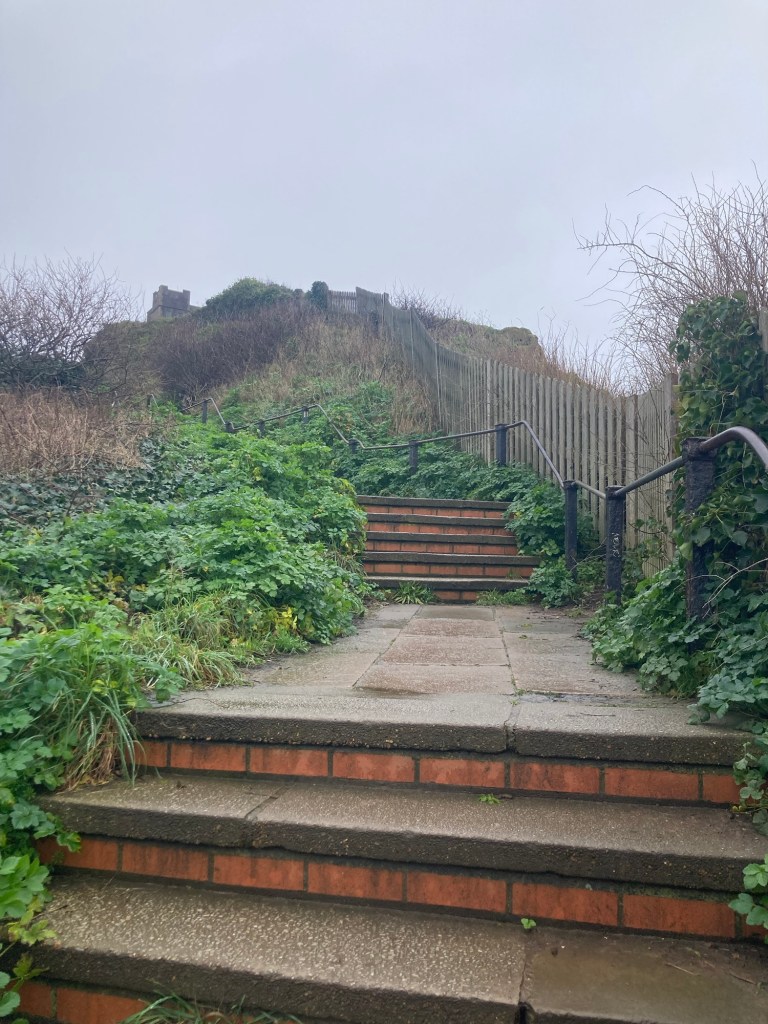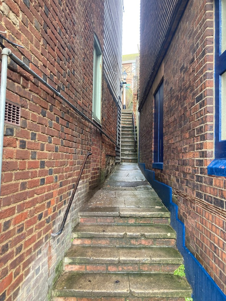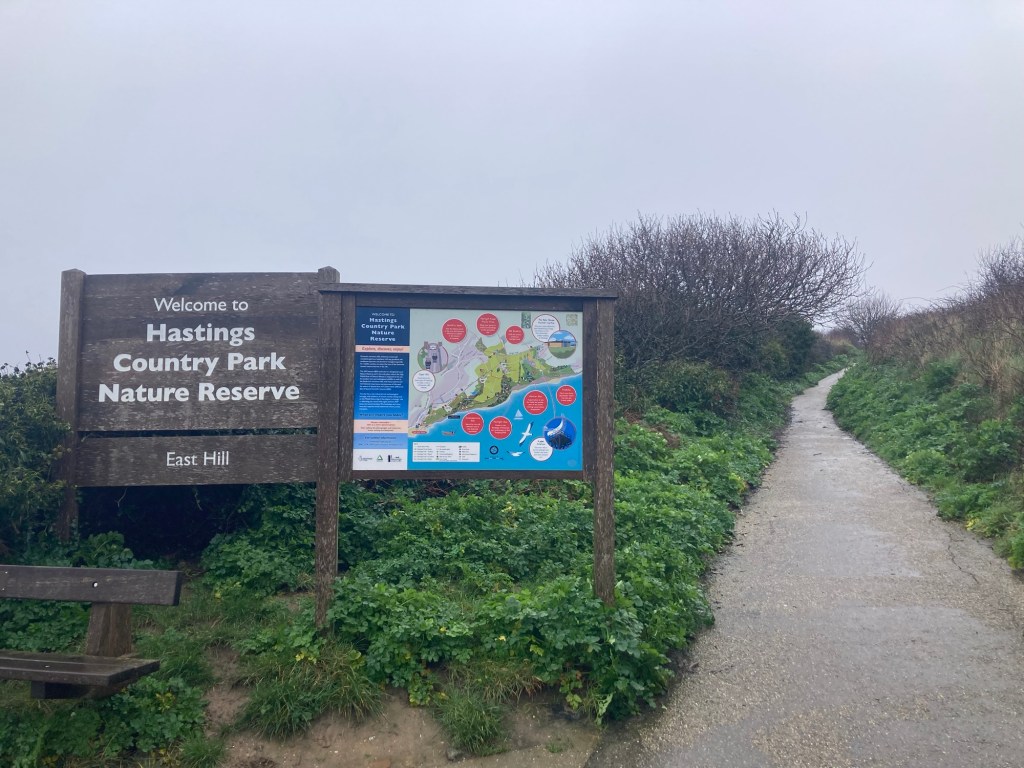 Hastings first living laboratory for climate-resilient gardening, right along the seafront The British Tea Museum, only open for tours to groups of 20 or moreEntering into the Old Town section of Hastings One of many pubs along the waterfront A plaque states that this statue was erected on Winkle Island by members of the Hastings Winkle Society. Winkles are a small mollusks with a spiral shell.The Hastings Contemporary, an arts charity located on the historic fishing beachOne of a number of passageways in Hastings. At the top of the stairs, I saw a sign for East Hill, so I went up.More stairs up to the funicular building at the topA view on the way up over the town to the West HillThe entrance to the Country Park at the top of the stairs. The paved path led to a large green space which I didn’t opt to walk on due to the wetness.A view of the beach, town, and West Hill from the top