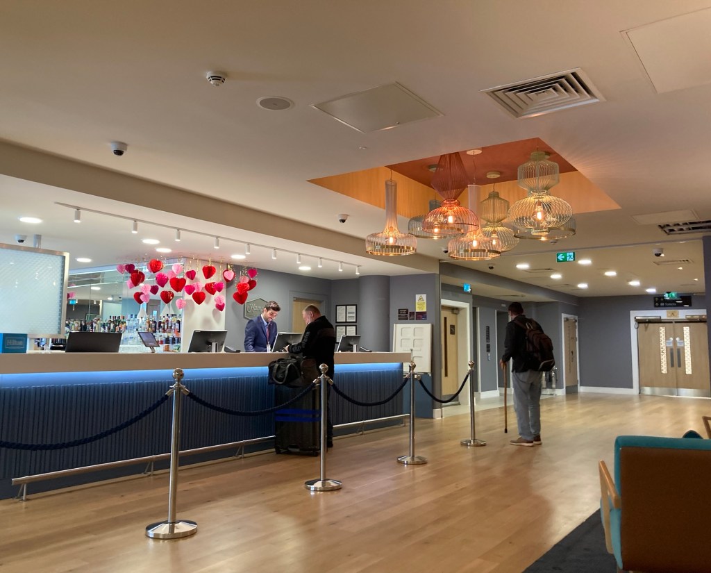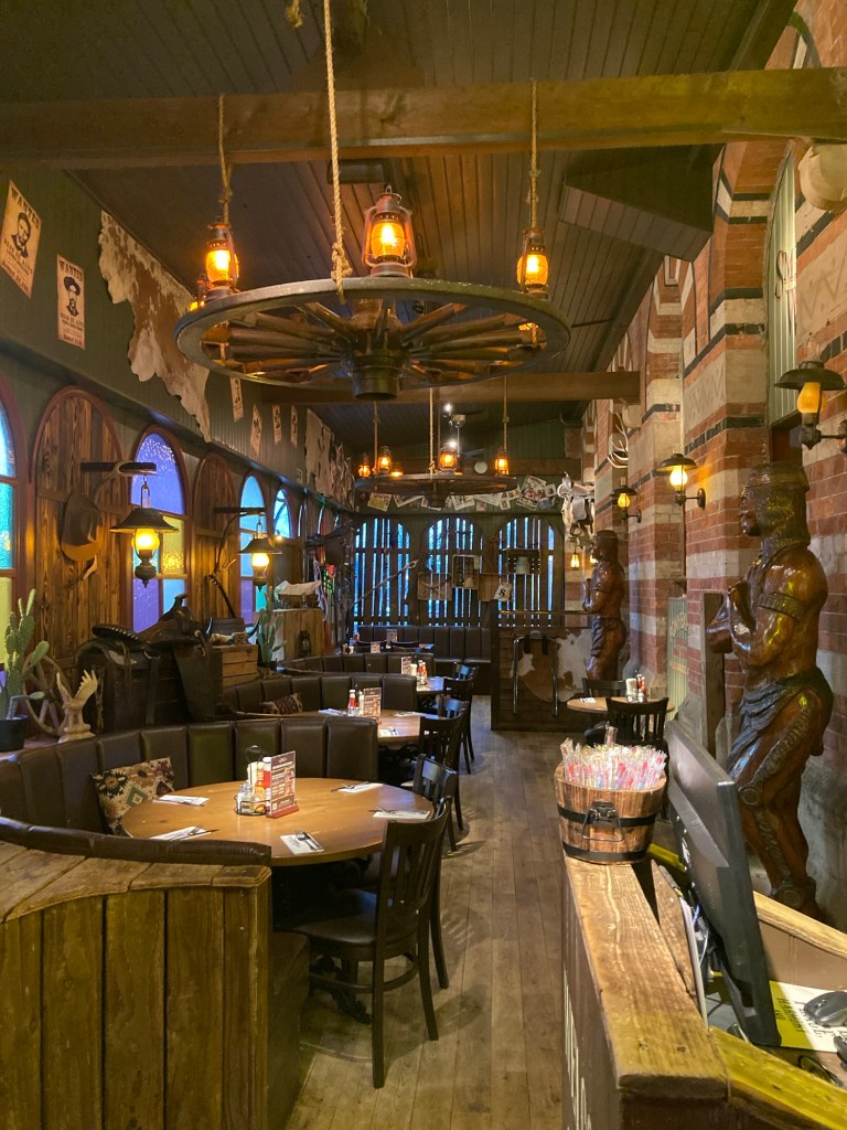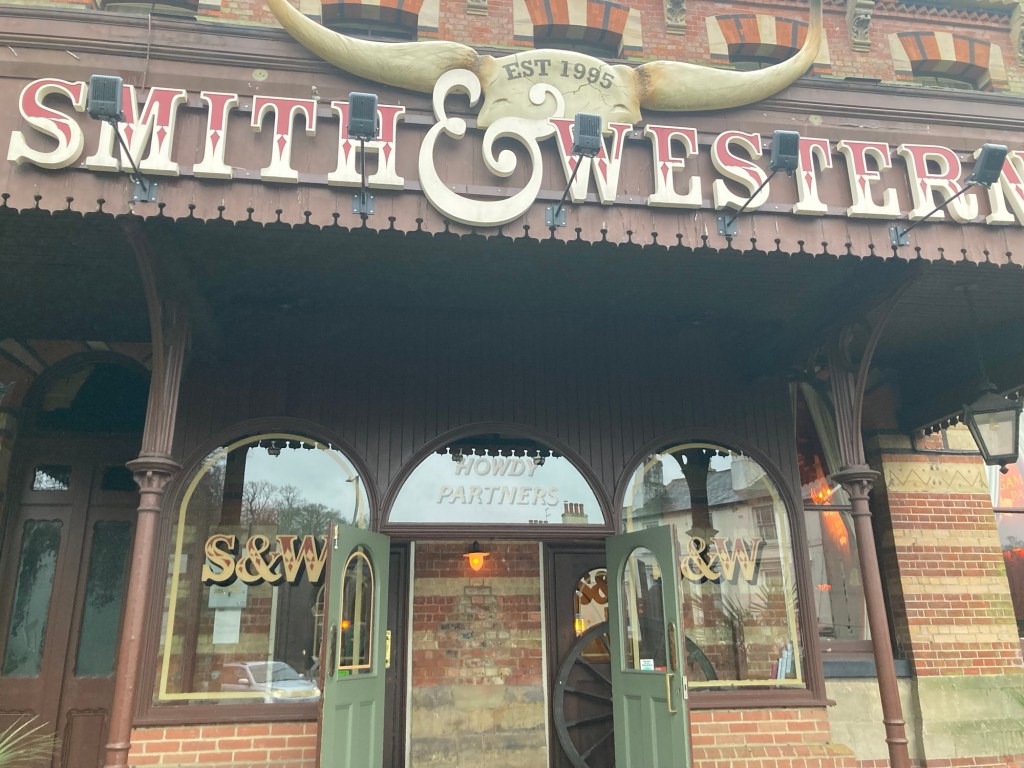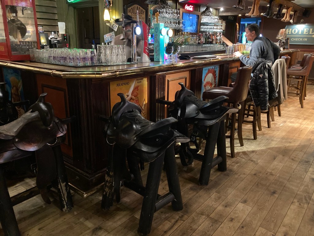 Sweet NellieA rare moment of sun in Tunbridge WellsOn the last maid’s day, Bob and I took the bus to the Sainsbury’s grocery store and then walked across the way to the Smith and Western Hotel/bar.A chuckwagon table The Cowboy themed restaurant Saddle bar seatsBob getting ready to check into the Hampton, North Terminal Gatwick