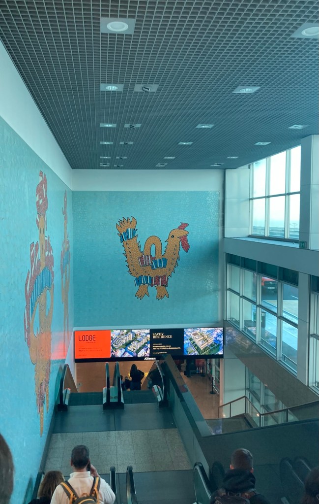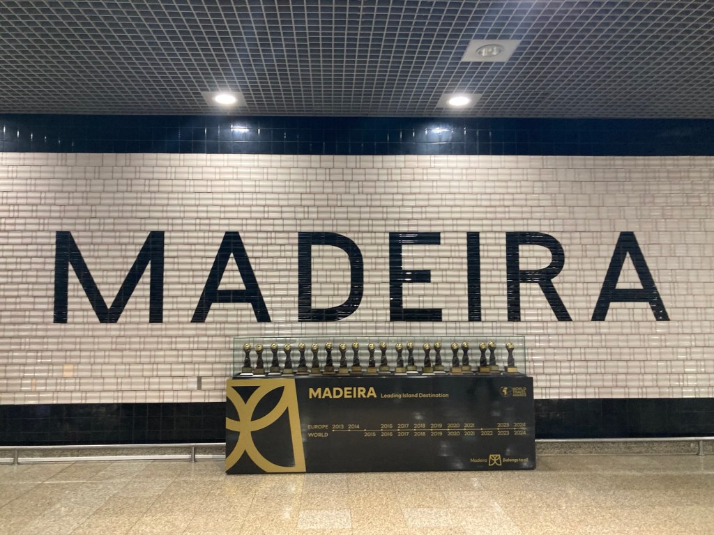 Coming down the escalator in the Madeira Airport to claim our luggageA sign to remind us where we are