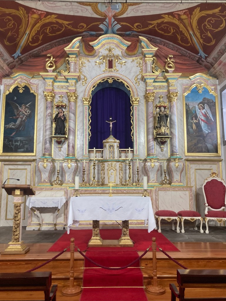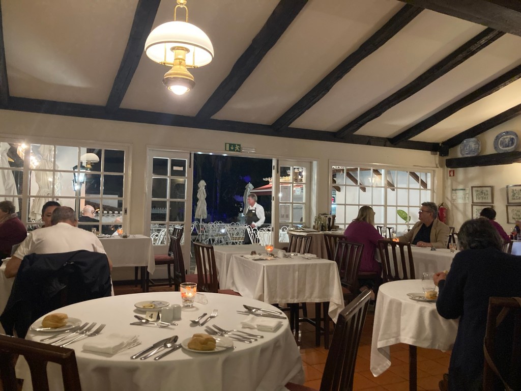 Last night we ate at the hotel restaurant. We had great seafood — clams and octopus — and a great local bread — bolo do caco (flat bread made with sweet potato and served warm with garlic butter).