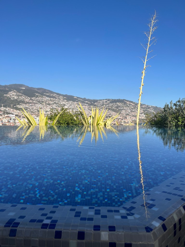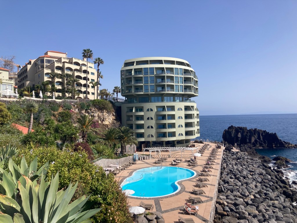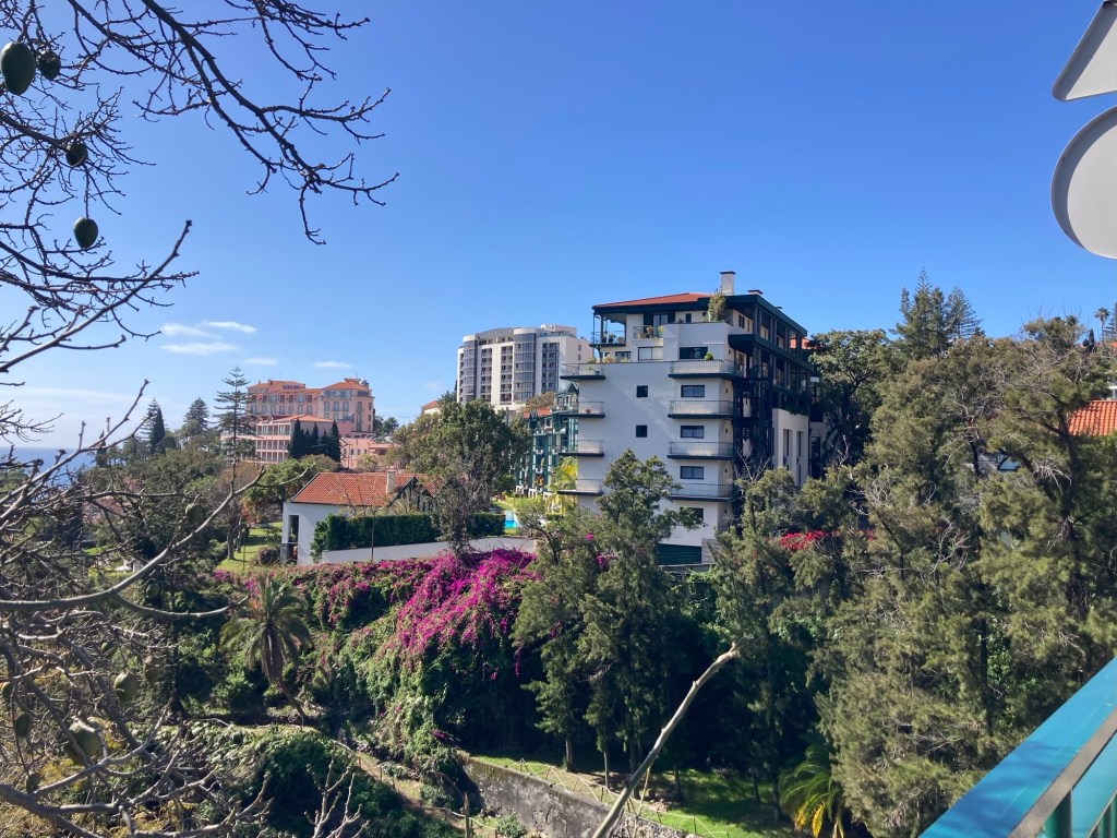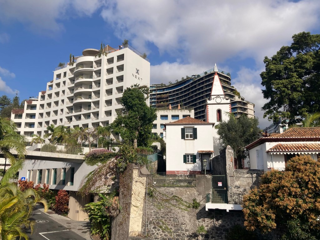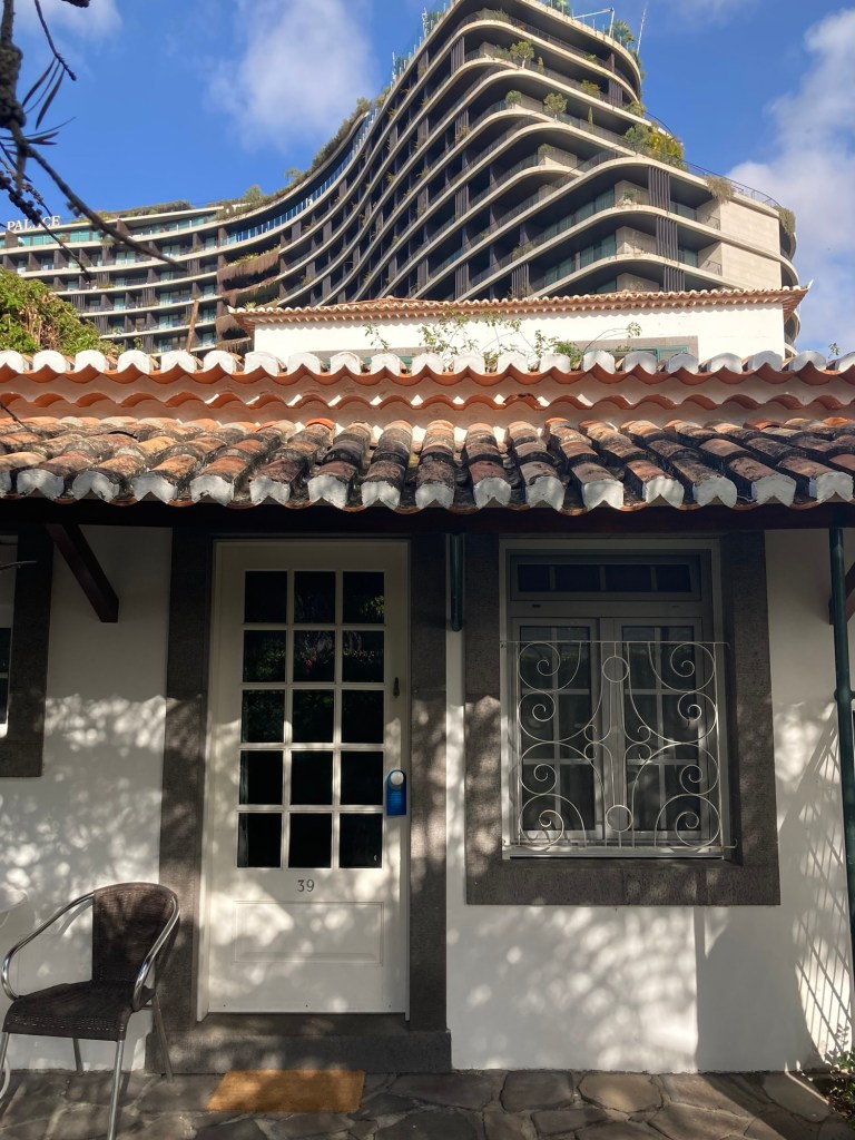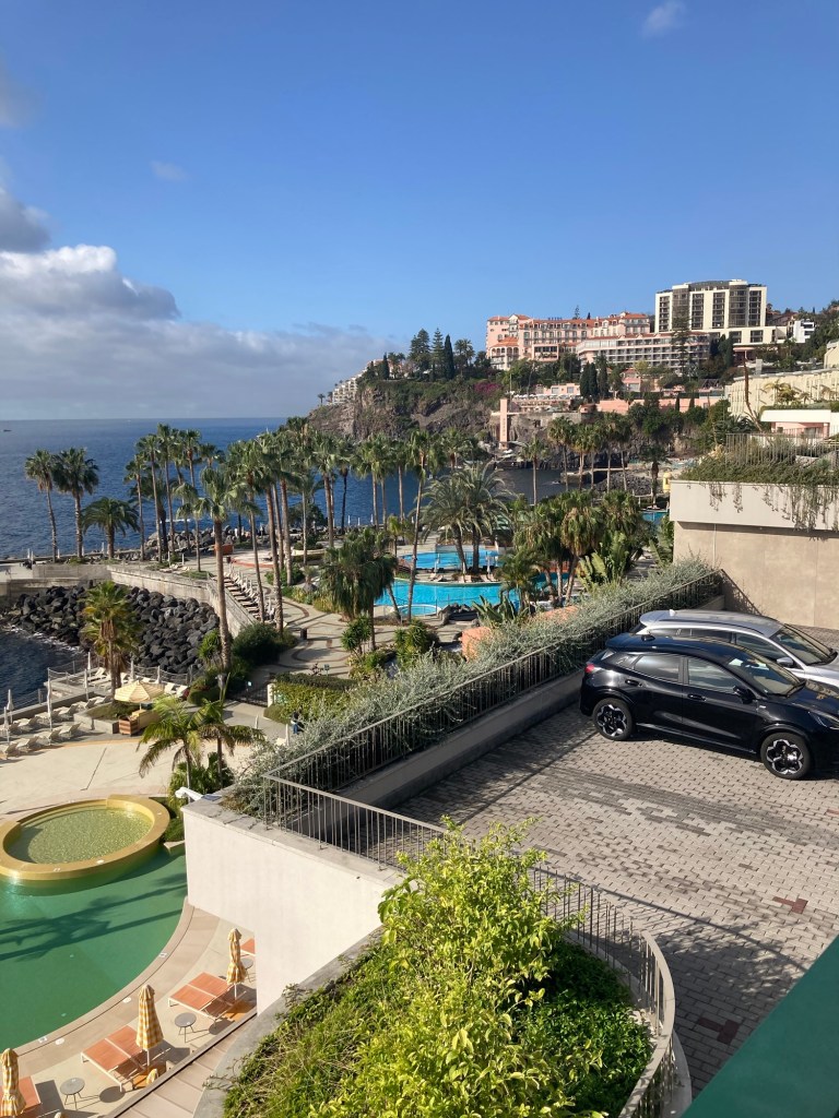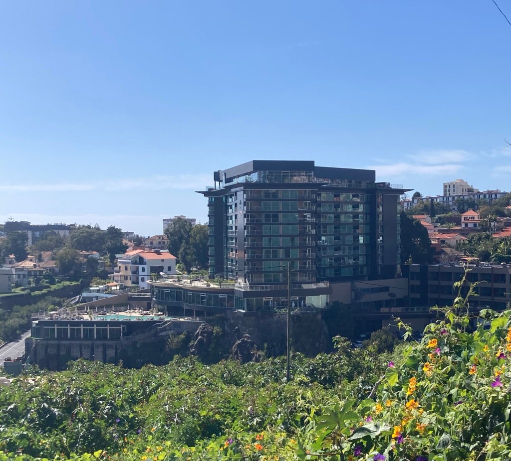 We grabbed a cab ( number three in line that would take credit cards) to take us from the town of Santa Cruz to our hotel in Funchal (about $50). Once in our room, we unpacked while enjoying a free bottle of sparkling wine from hotel.com through which we had made the hotel reservation,