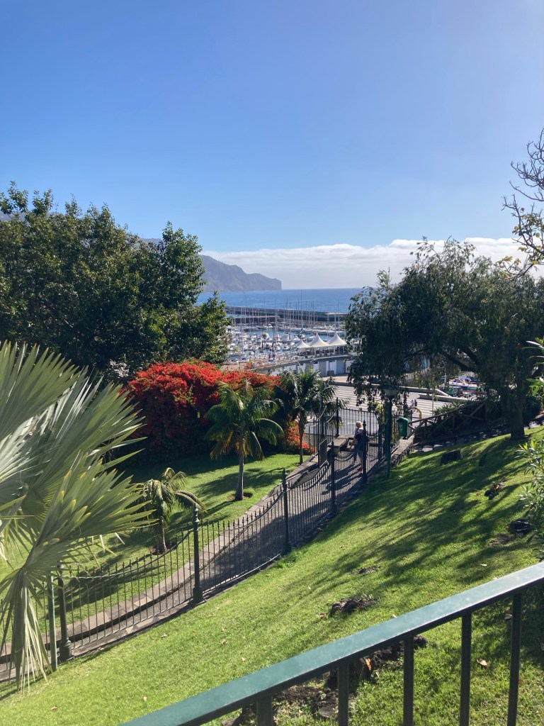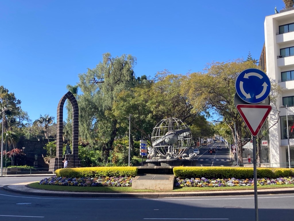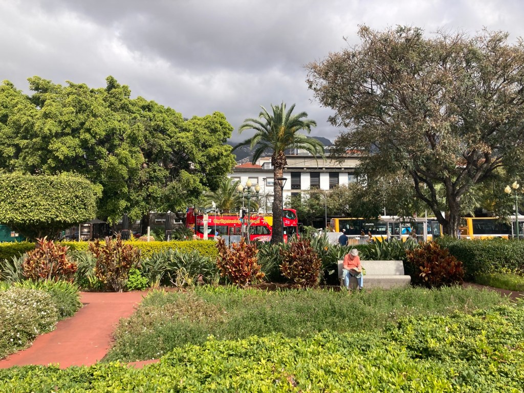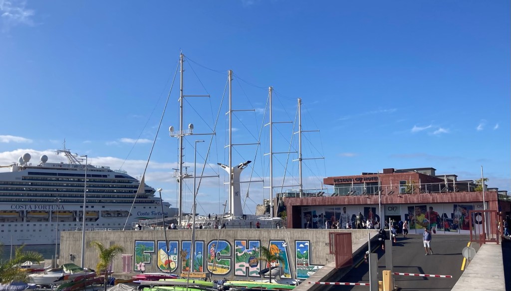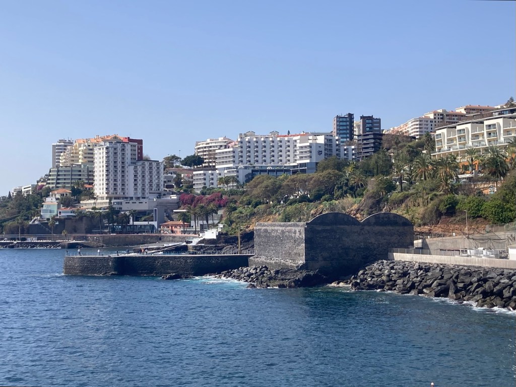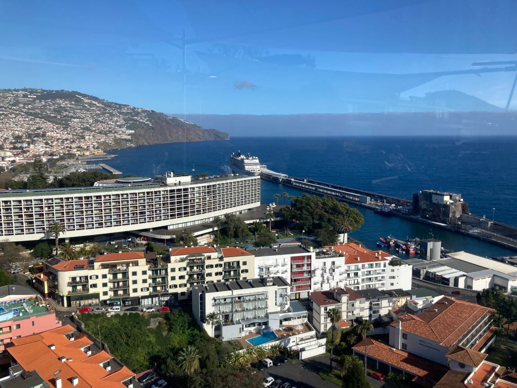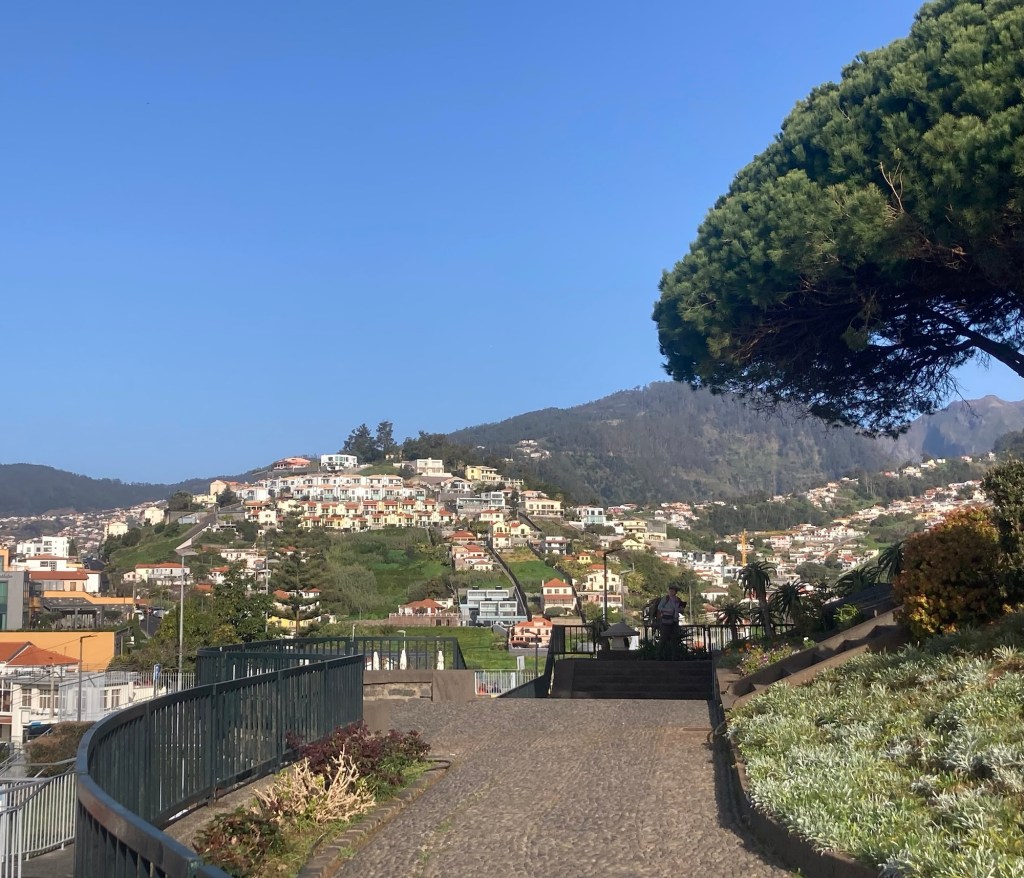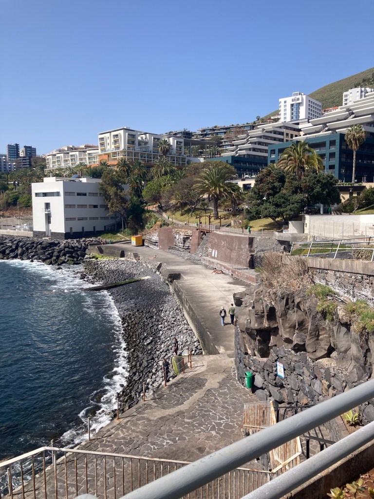 After returning to the room to collect some things, we returned the same way, took the elevator down from the bridge to the ground level, walked through the lobby of the sister property and out onto the street to reach the lovely and busy Avenida do Mar to see a bit more of Funchal. There were two cruise ships in, so it was hopping. Bob walked for about half of it, and then had to stop and took a Bolt (like Uber or Lyft) back to the hotel. I continued to the end of the pedestrian promenade along the water and then did my run.