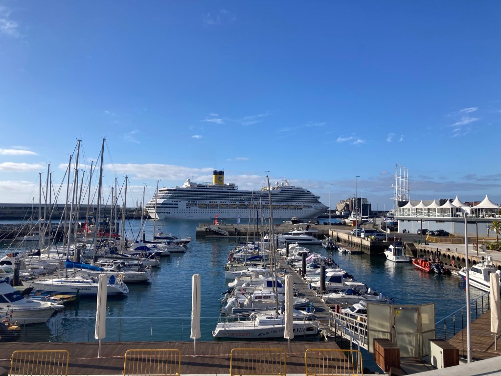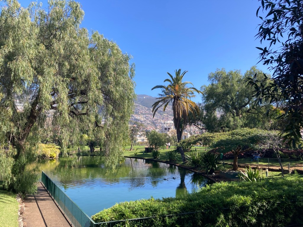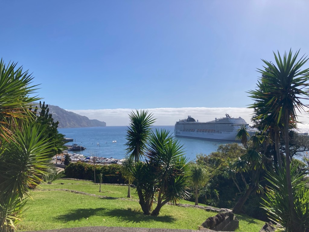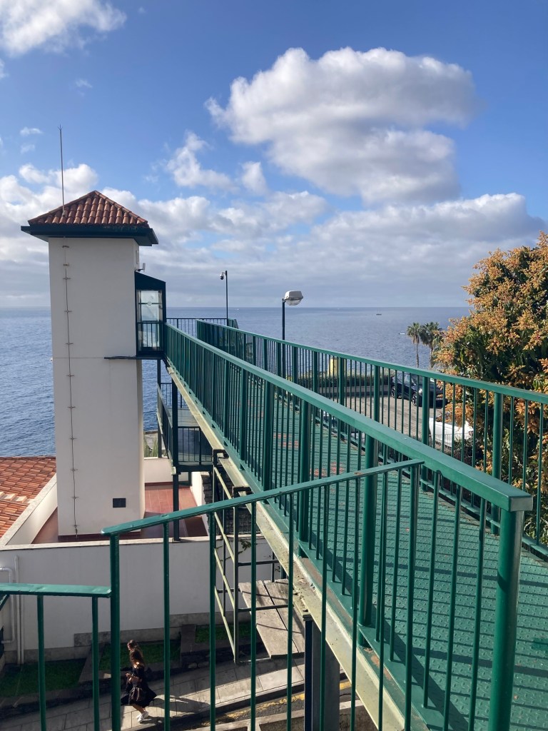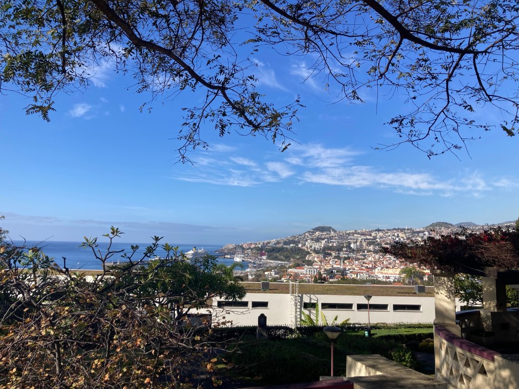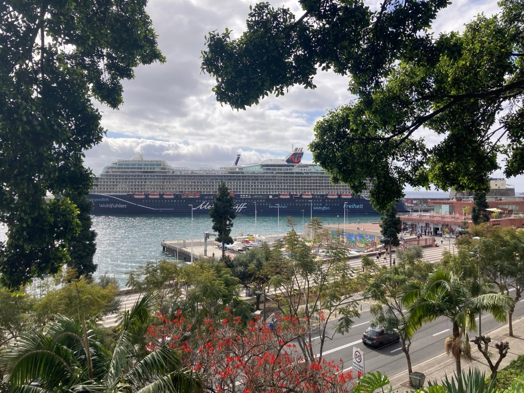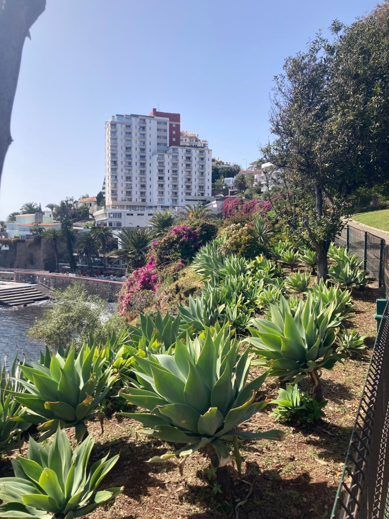 After returning to the room to collect some things, we returned the same way, took the elevator down from the bridge to the ground level, walked through the lobby of the sister property and out onto the street to reach the lovely and busy Avenida do Mar to see a bit more of Funchal. There were two cruise ships in, so it was hopping. Bob walked for about half of it, and then had to stop and took a Bolt (like Uber or Lyft) back to the hotel. I continued to the end of the pedestrian promenade along the water and then did my run.