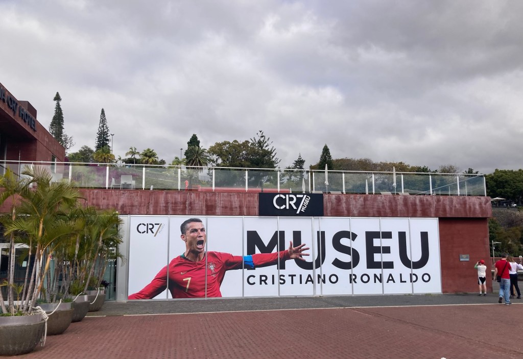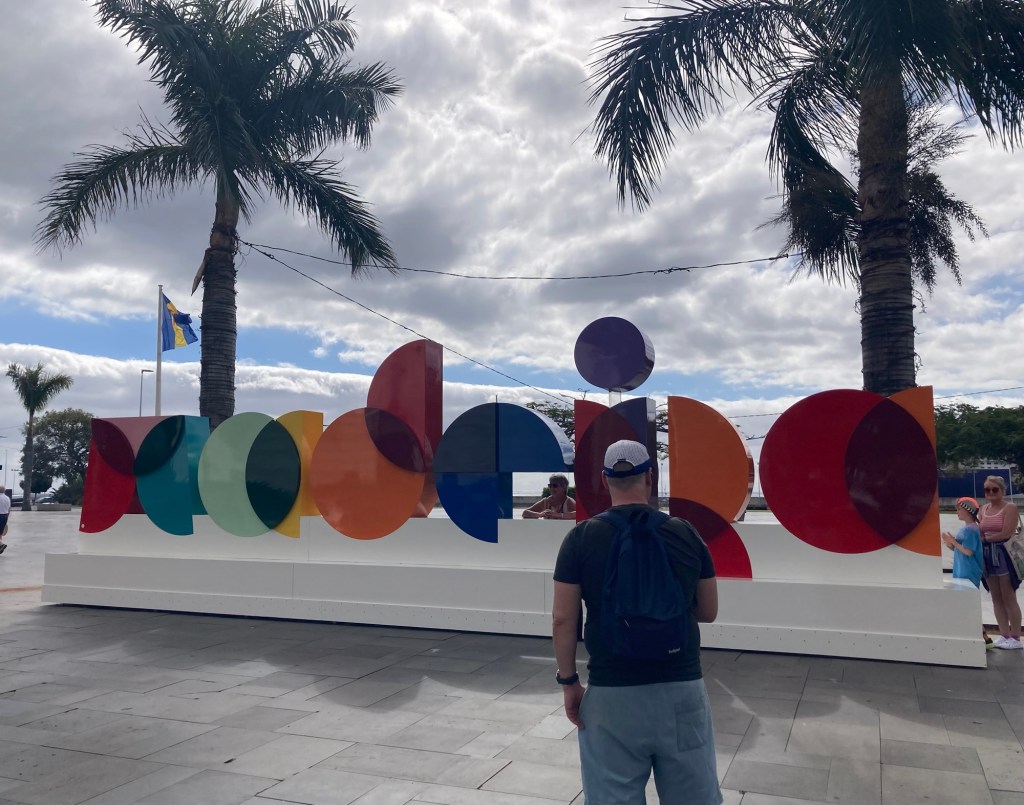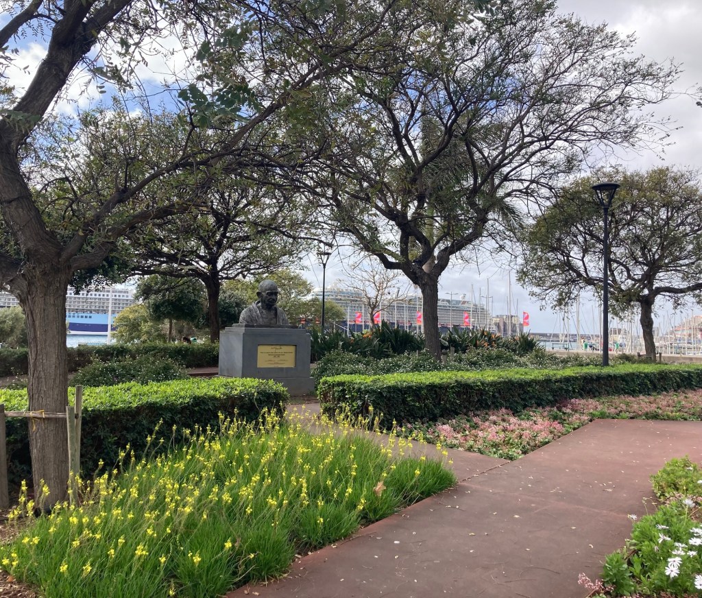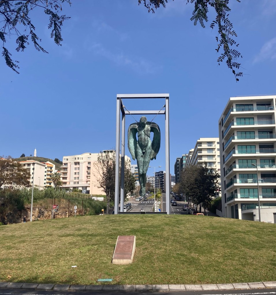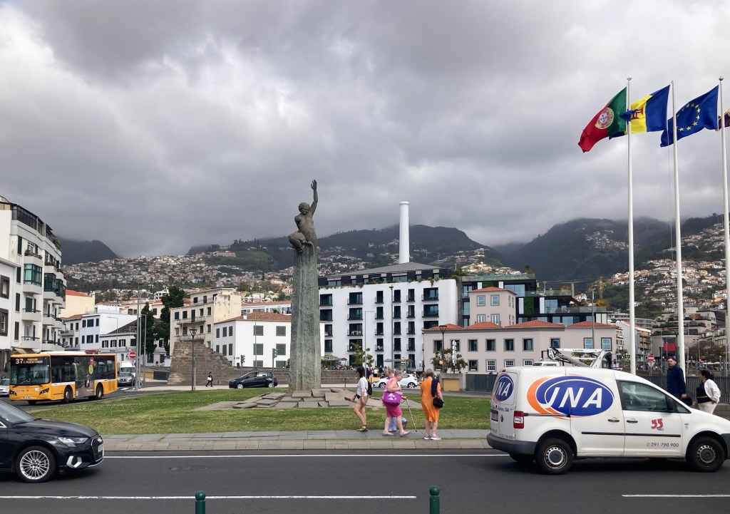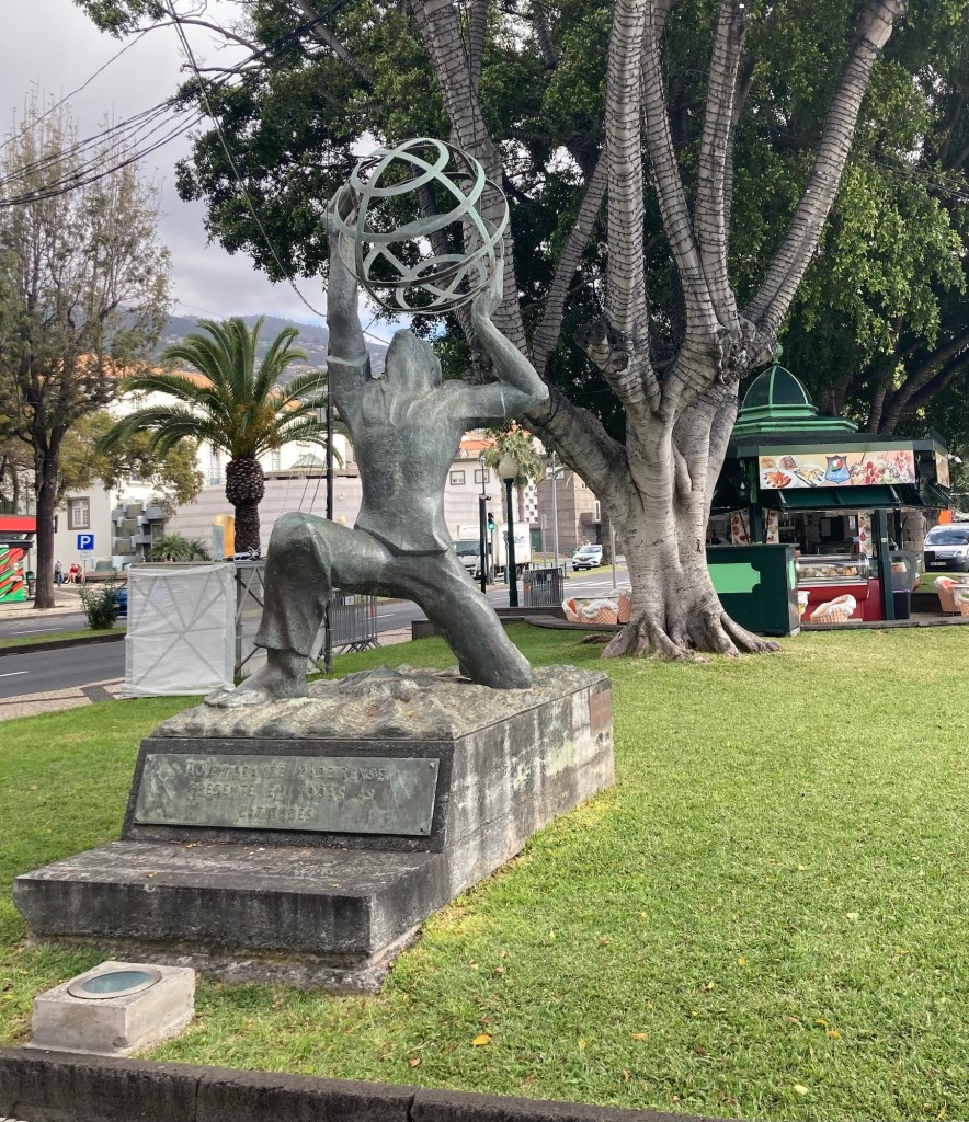A cool design building built atop what looks to be an old fortress A museum along the promenade in a hotel also named for the famous footballer I found a public bathroom in a pretty park up the hill from the promenade and got a nice shot of one of the cruise shipsOne of many cafes along the wayA cool sculpture to immigration There were a number of small gardens or parks along the promenade. This one has a bust of Gandhi.A colorful Madeira sign and popular photo opLooking across towards the townAnother pretty parkFood and drink trucksMonument to FreedomLots of stone barriers along the coast“Cabra Cega (blind goat or blind man’s bluff),” by Silvio Cro, 2000.