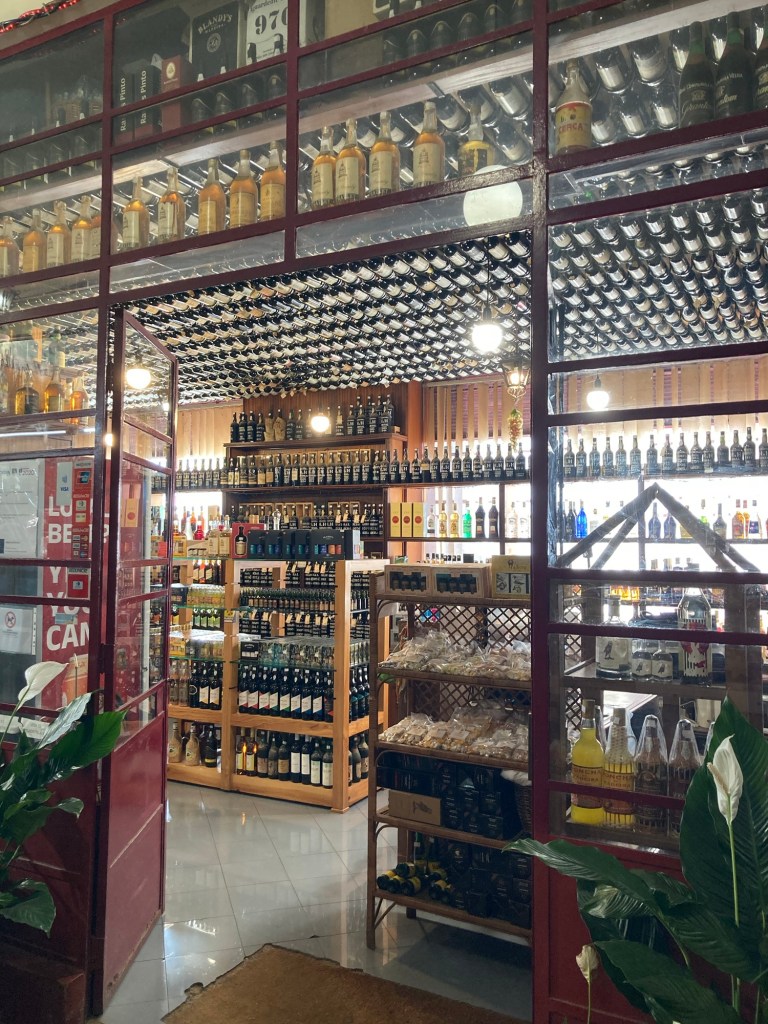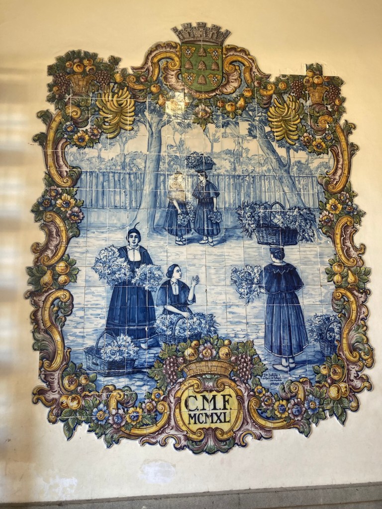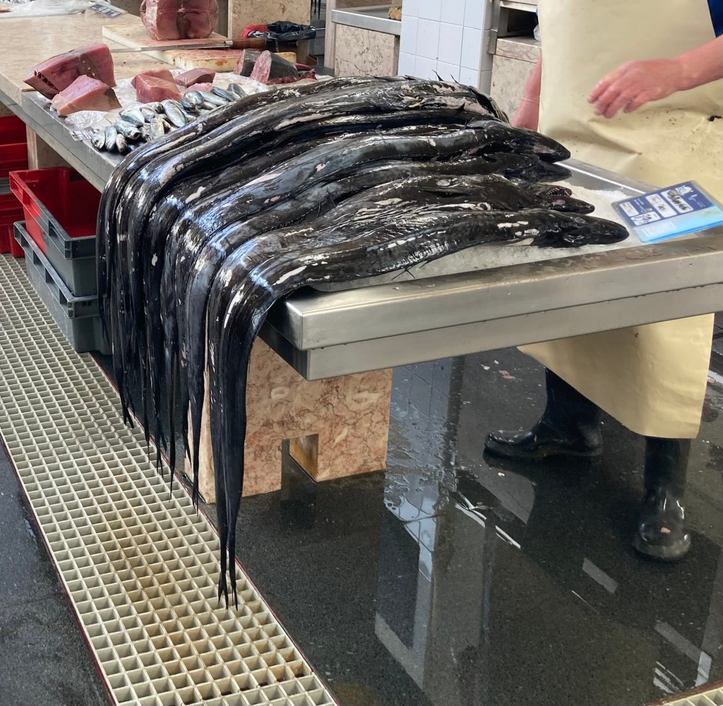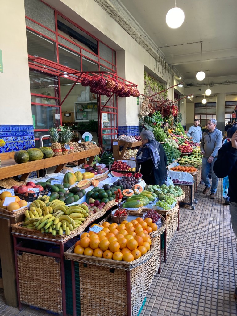 The market building, opened in 1940 and designed by Edmundo Tavares.We’re in Portugal, so of course there is beautiful tile work adorning the walls of the marketA liquor store where even the ceiling is covered in bottles Colorful produce. The fruit has been amazing here.The Black Scabbard or Espada fish, a typical fish in Madeira