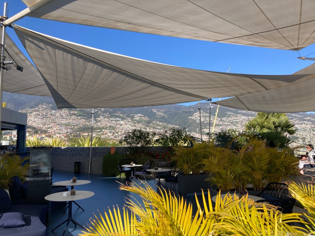 Bob and I decided last night to head to the large Savoy Palace (residences and hotel), which looms over our little hotel, as Bob had found that they had a rooftop bar. Upon entering, those of us who are not guests or residents of the multiple Savoy properties in Madeira are required to pay 30 euros up front for a card as a minimum charge. Any amount spent over that would be charged at the bar. Since we had seen that their cocktails cost about 15 euro anyway, we were okay with this. We paid the nice hostess, got the card, and were escorted to the elevator for the ride up to the 16th floor.