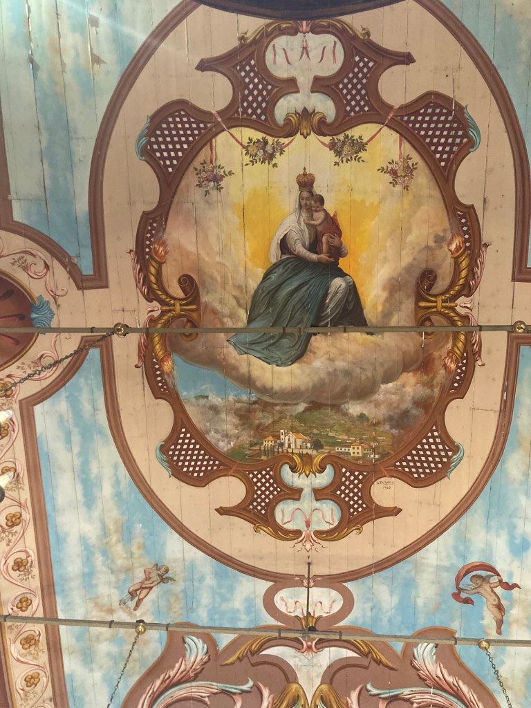 The local museum on the left overlooking the parking lot that we stopped at.A local bar/cafe in which Bob tried a local delicacy while I poked around townThe chestnut and cheese cake that’s a local delicacy. The staff described it as savory, but it tasted a bit sweet without a strong taste of cheese or chestnuts.Looking down the Main Street of townLooking up into the tiered townThe local church A view of the church from the naveThe ceiling over the naveThe ceiling over the alterThe alter of the church