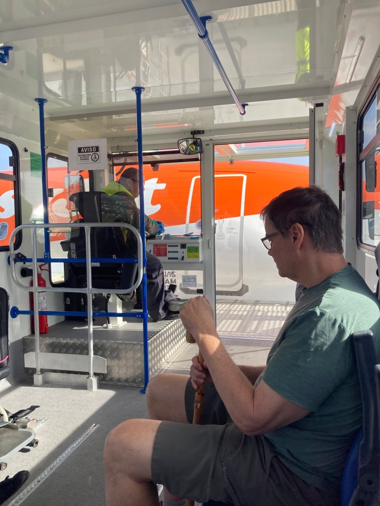 We were flying Easy Jet airlines and had requested Special Assistance due to the current state of Bob’s hip. This didn’t mean much on our arrival, but we got the full treatment this time. Bob had a wheel chair pickup at check-in that took us all the way to the gate and then to an impressive people mover transport onto the plane.