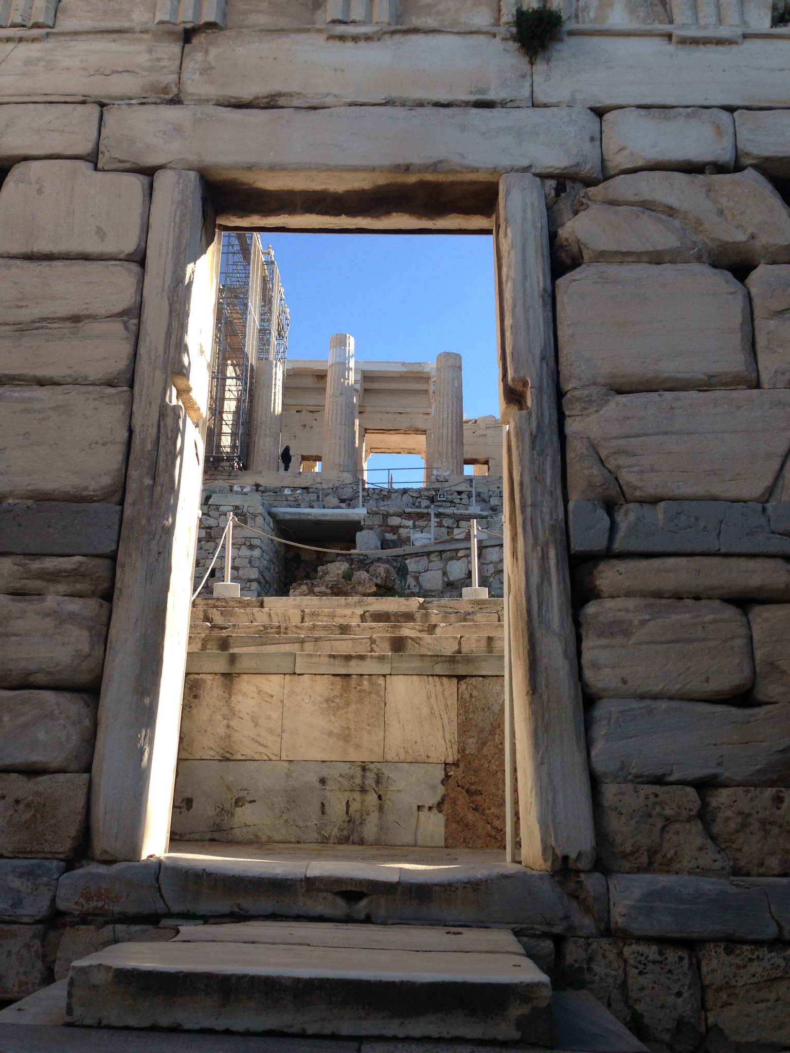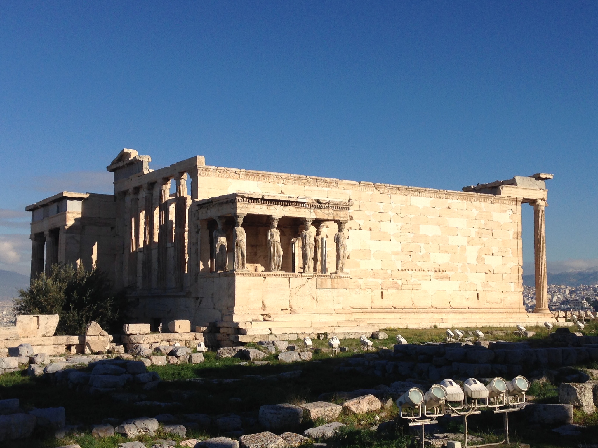 Looking in toward the Parthenon from initial entryway.A close-up view of some of the columns.The Erecchtheum with the porch of the caryatids (the female figures used as supporting columns).