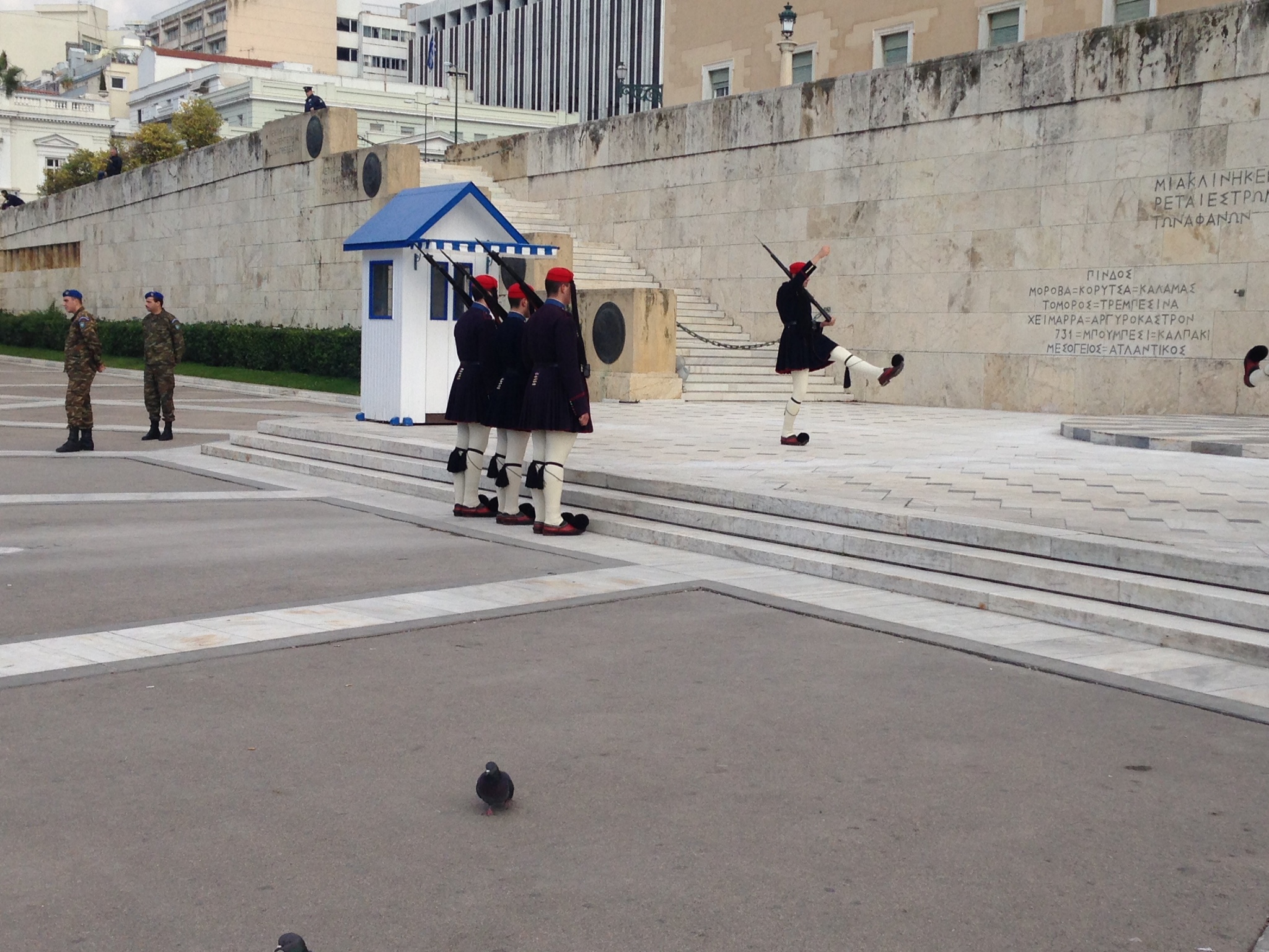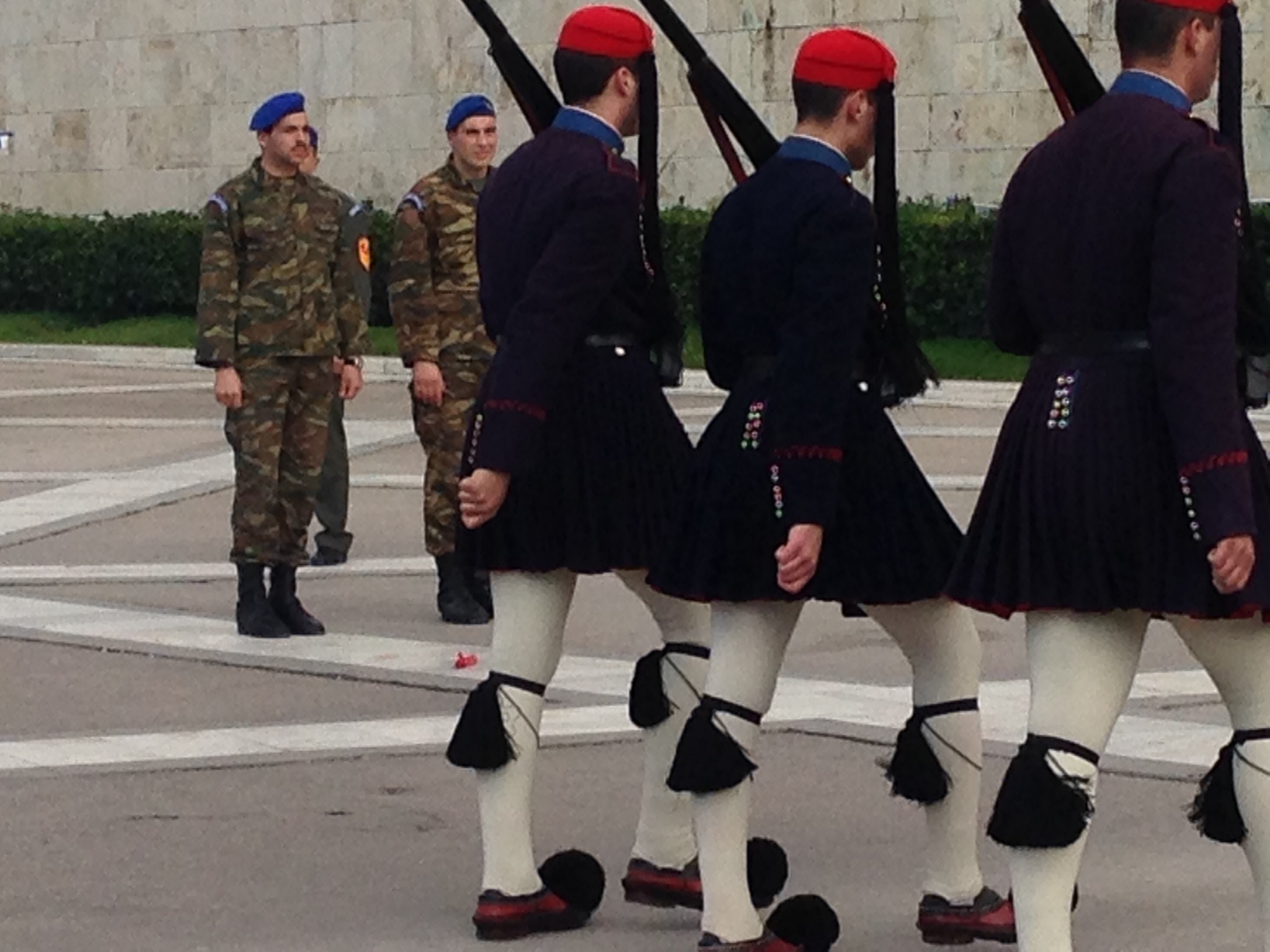 Probably the two of the most intriguing sites we saw on Thursday were a social protest (never did learn what exactly it was about) and the changing of the guard near the Tomb of the Unknown Soldier outside of Parliament House. We heard warnings about the protests, but it didn’t seem terribly large and was certainly completely non-violent from what we saw. The changing of the guard ceremony, however, was something like no other guard ceremony we have ever seen. Picture grown military men wearing what appears to be Catholic school girl uniforms with stockings, garters, a little beanie with a long tassel, and clog style shoes with fluffy balls on them doing some type of weird high kick ( front, back, side) march and then getting their outfits restyled by the head guy in camouflage. And then they have to stand at attention while tourists pose with them! I couldn’t do it, they had already sufficiently made my day. All military should be required to dress and act in this manner to limit actual fighting. See below.