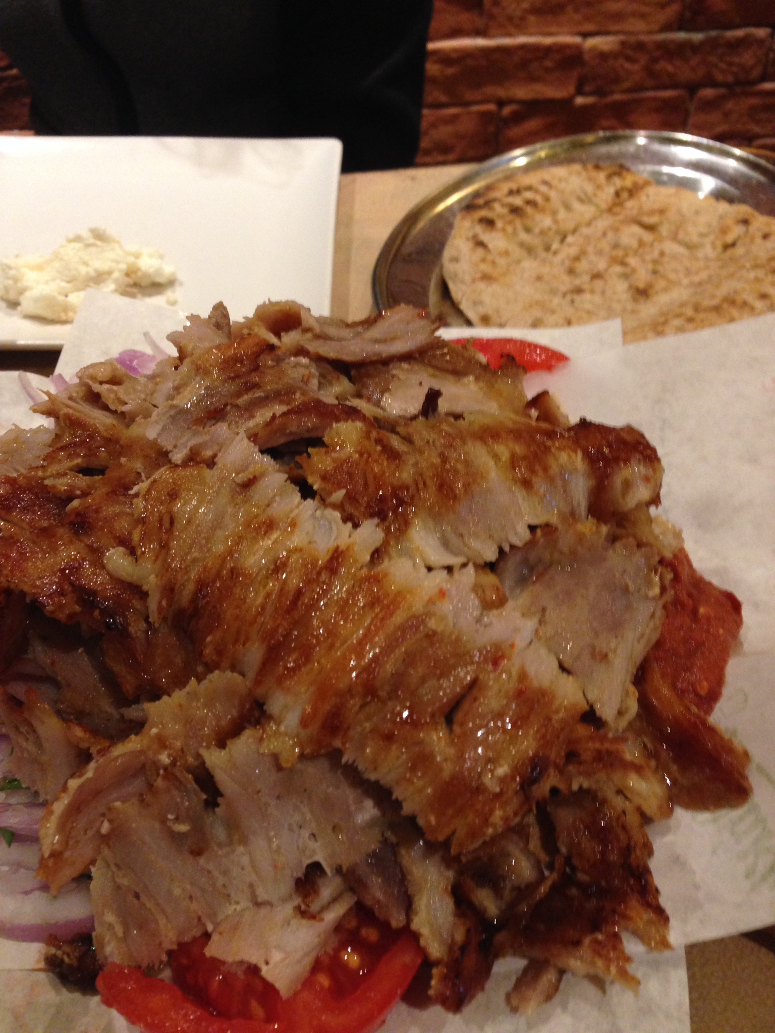 Grilled feta served in an interesting wooden u-shaped bowl.Gyro Greek style — served almost like nachos with the meet on top of the sliced onions, tomatoes, sauce, and pita breadSonia Salad