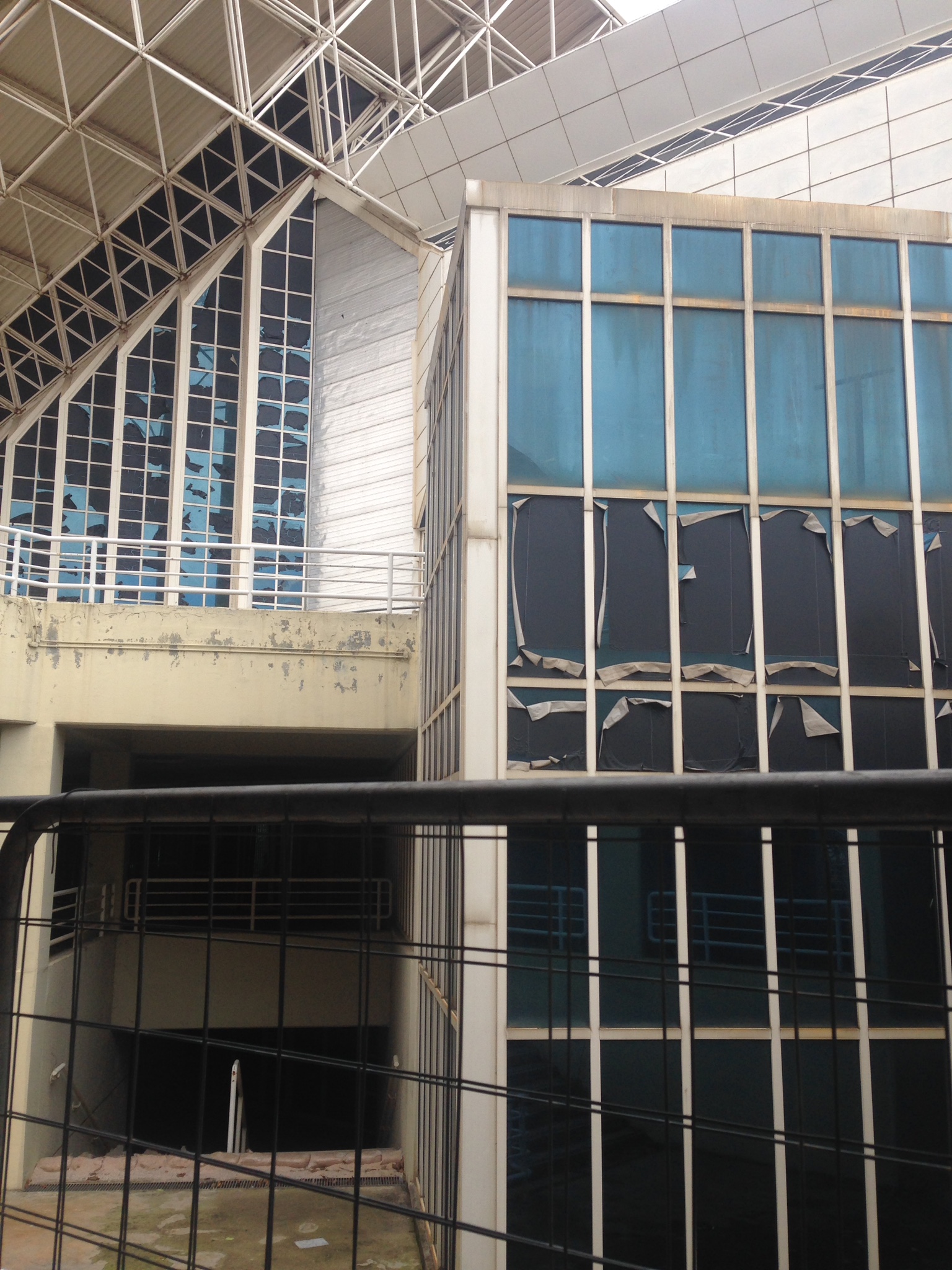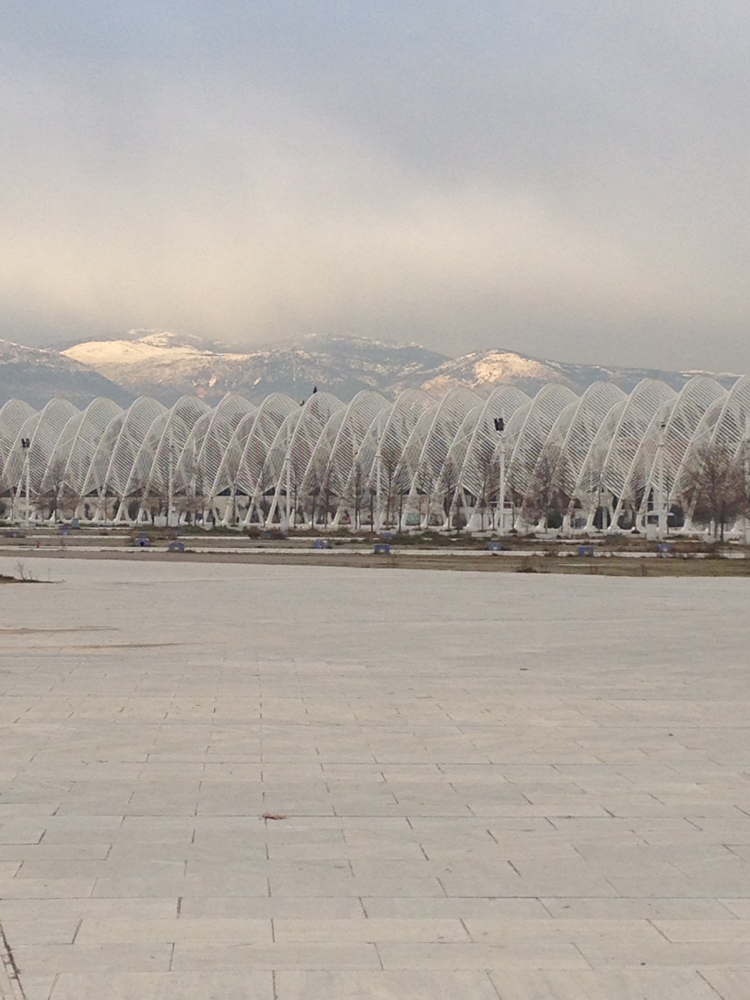 View of one of the entryway into the stadium grounds with mountains in backgroundThe main Olympic stadium with roof by Santiago Calatrava, one of our favorite architects. Note the neglected landscaping.The inside of the swim and diving center — in use!The outside of another building with its peeling facade. This building was closed up, so we aren’t sure what it was used for.Told you it was called The MallWith the store selection, we could have been in an American mall. But nice, natural lighting and top-floor restaurants have view of the Olympic Stadium.