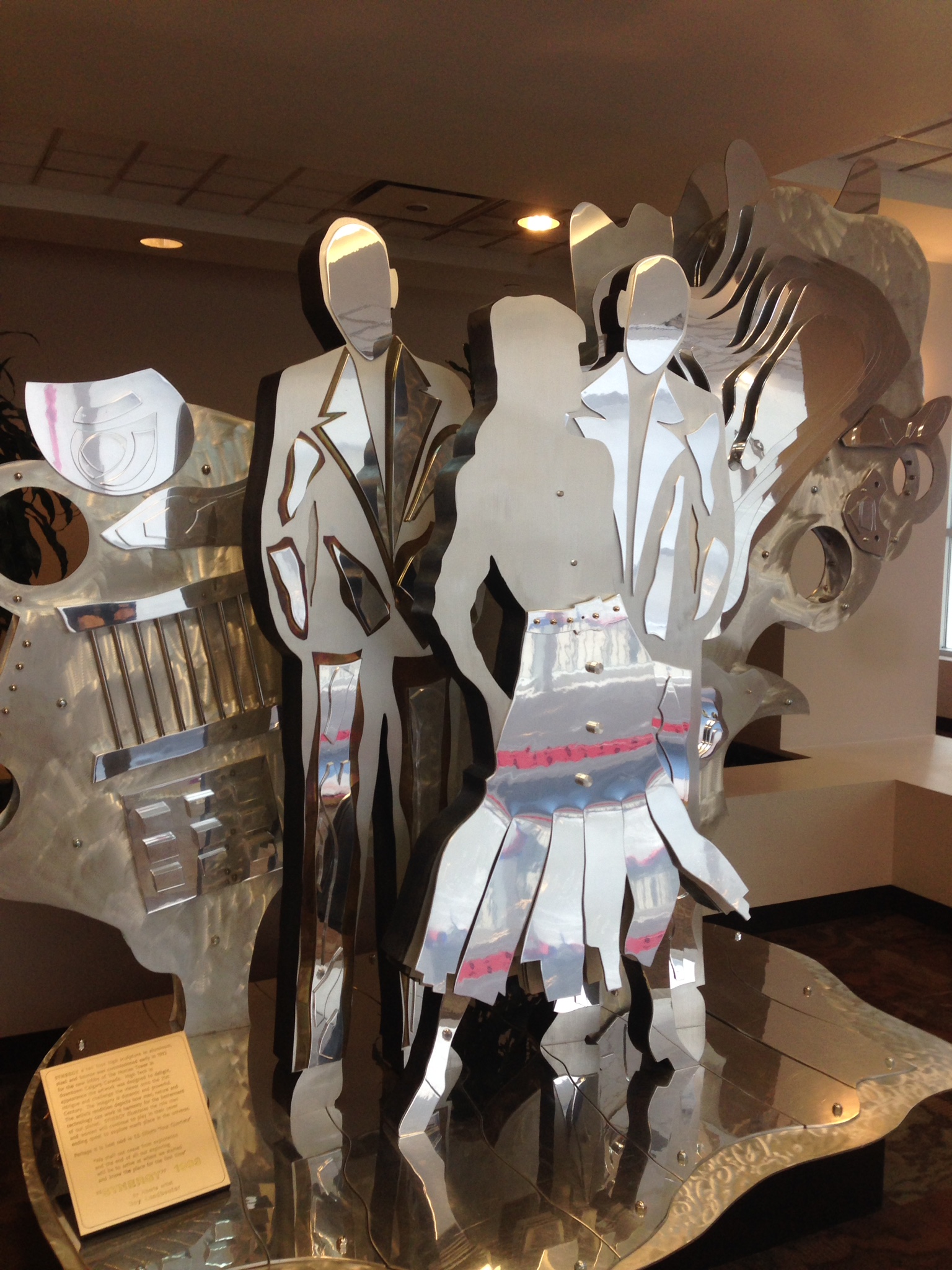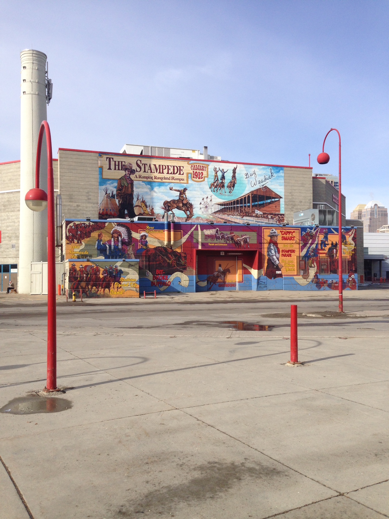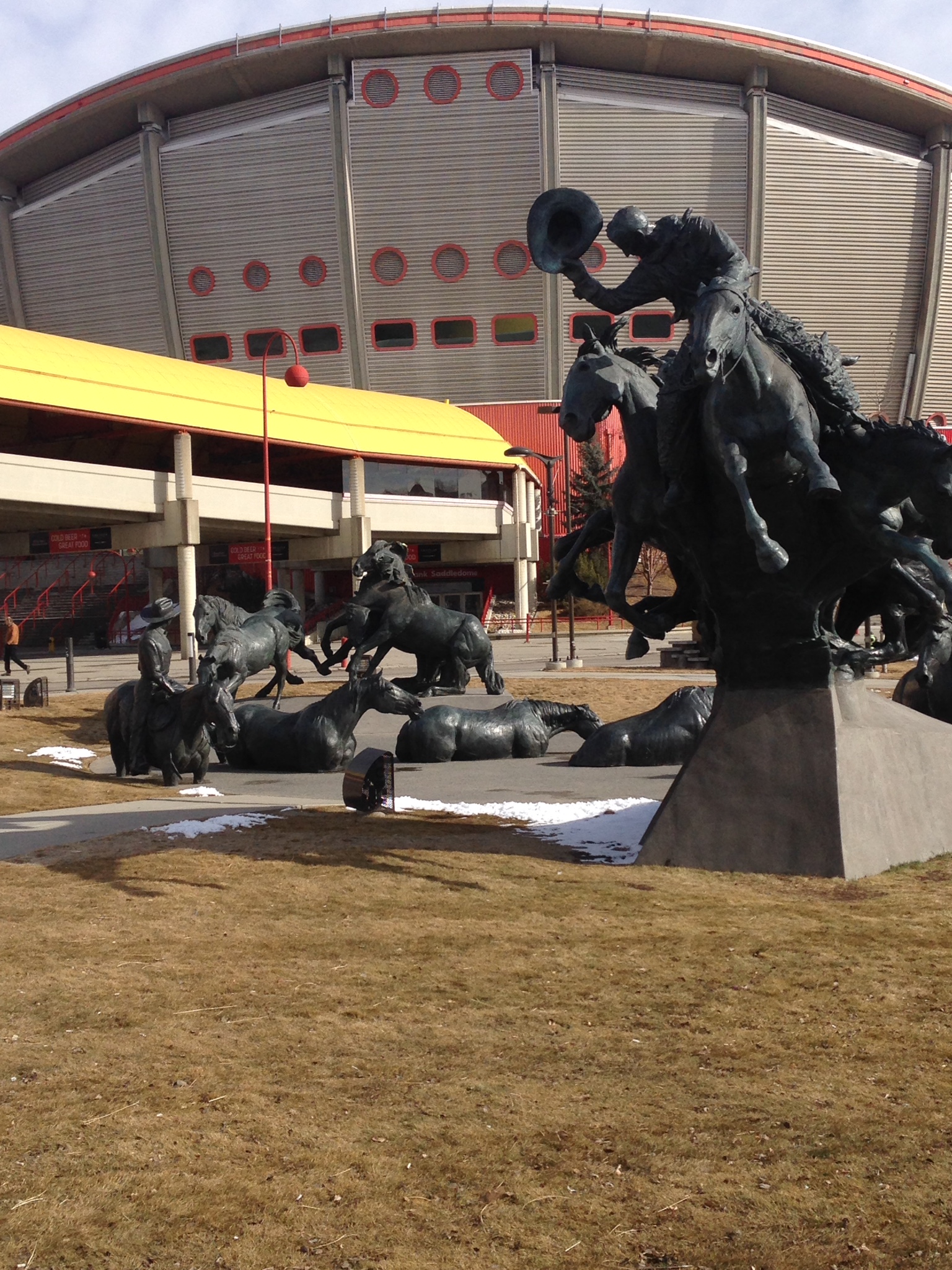 The Reader Rock garden lies just to the south of Stampede Park, home of the Calgary Stampede (For my fellow Texans I find Calgary quite reminiscent of Ft. Worth.). We explored the grounds, outside of the buildings, to view the artwork — everything from sculptures to murals to carved stone and metalwork. Each piece depicting some aspect of the Stampede and it’s history. I don’t know if we’ll ever get back for the Stampede, but the grounds are very close to the Saddledome where the Calgary Flames play, and we are hoping to get to one of their games before we leave.