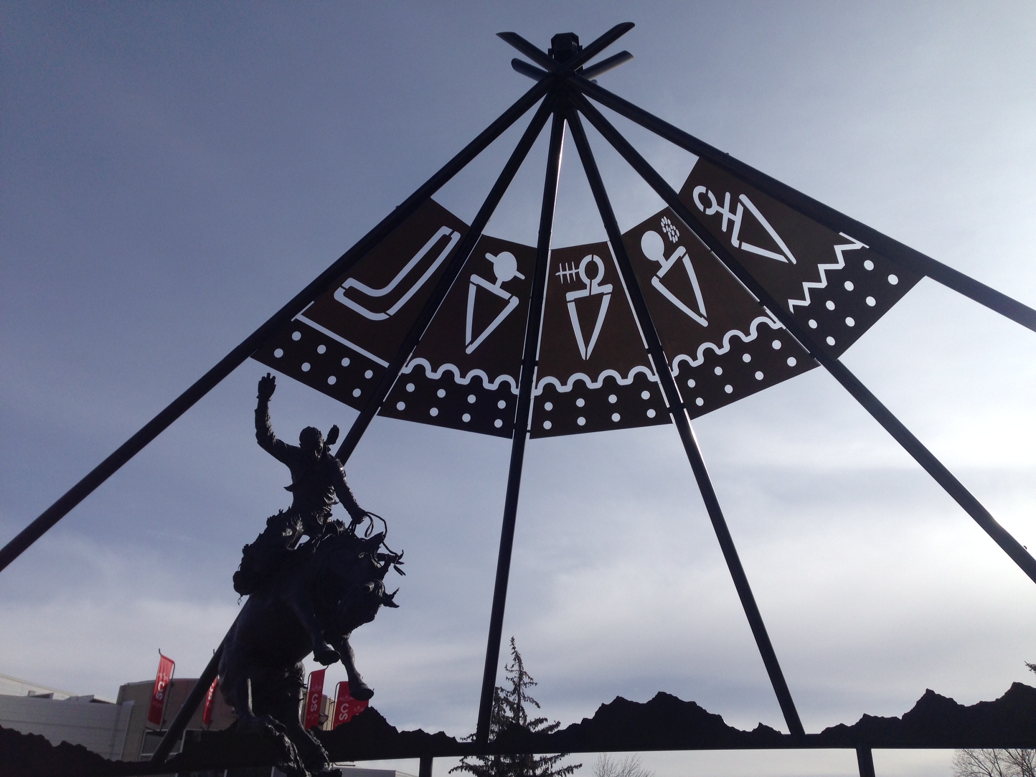 South entrance to Stampede Park.By the Banks of the Bow sculpture with the Saddledome in the background.Early Stampede muralBronc Twister sculpture with metal teepee in background with symbols of first people nations that participate in the stampede.