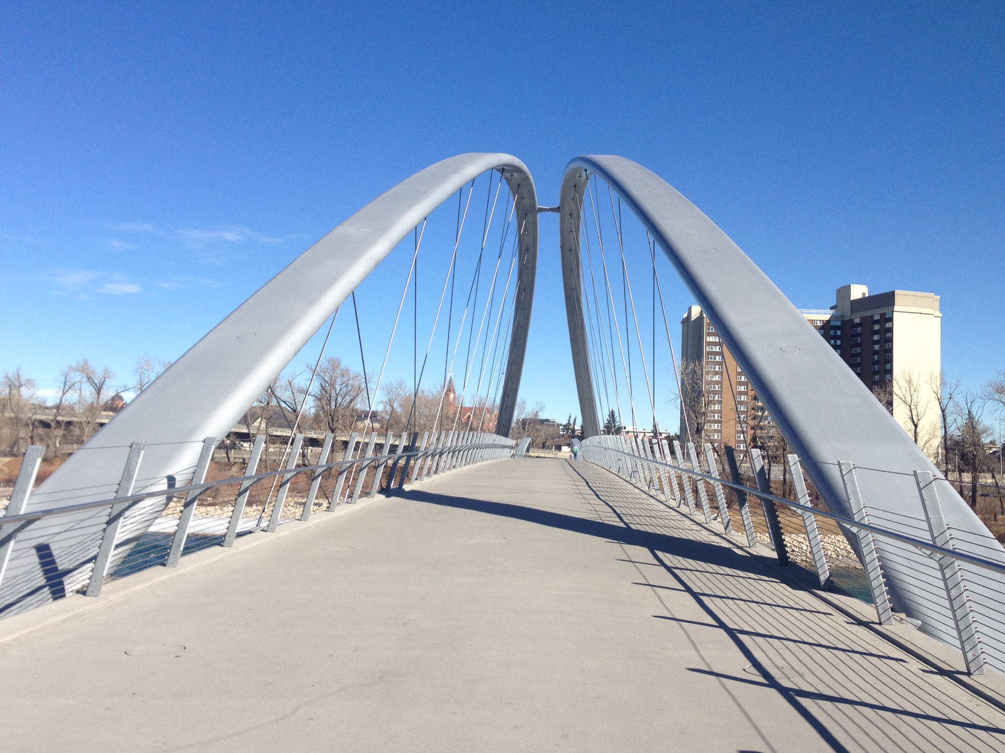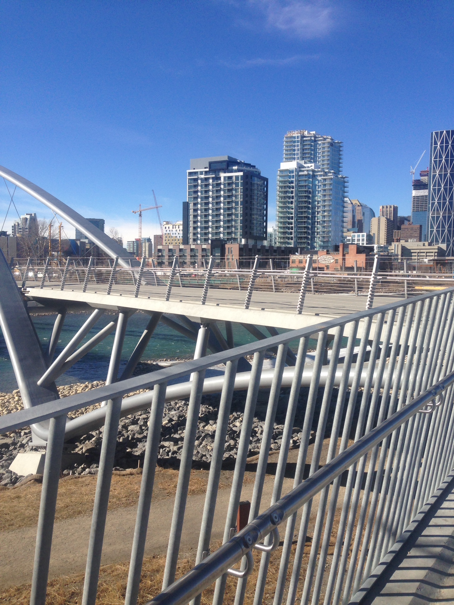 The Peace Bridge, designed by Santiago Calatrava, that crosses the Bow River just west of Prince’s Island Park.The River Cafe along the Bow River Trail.Looking back towards downtown from the Bow River Parkway.