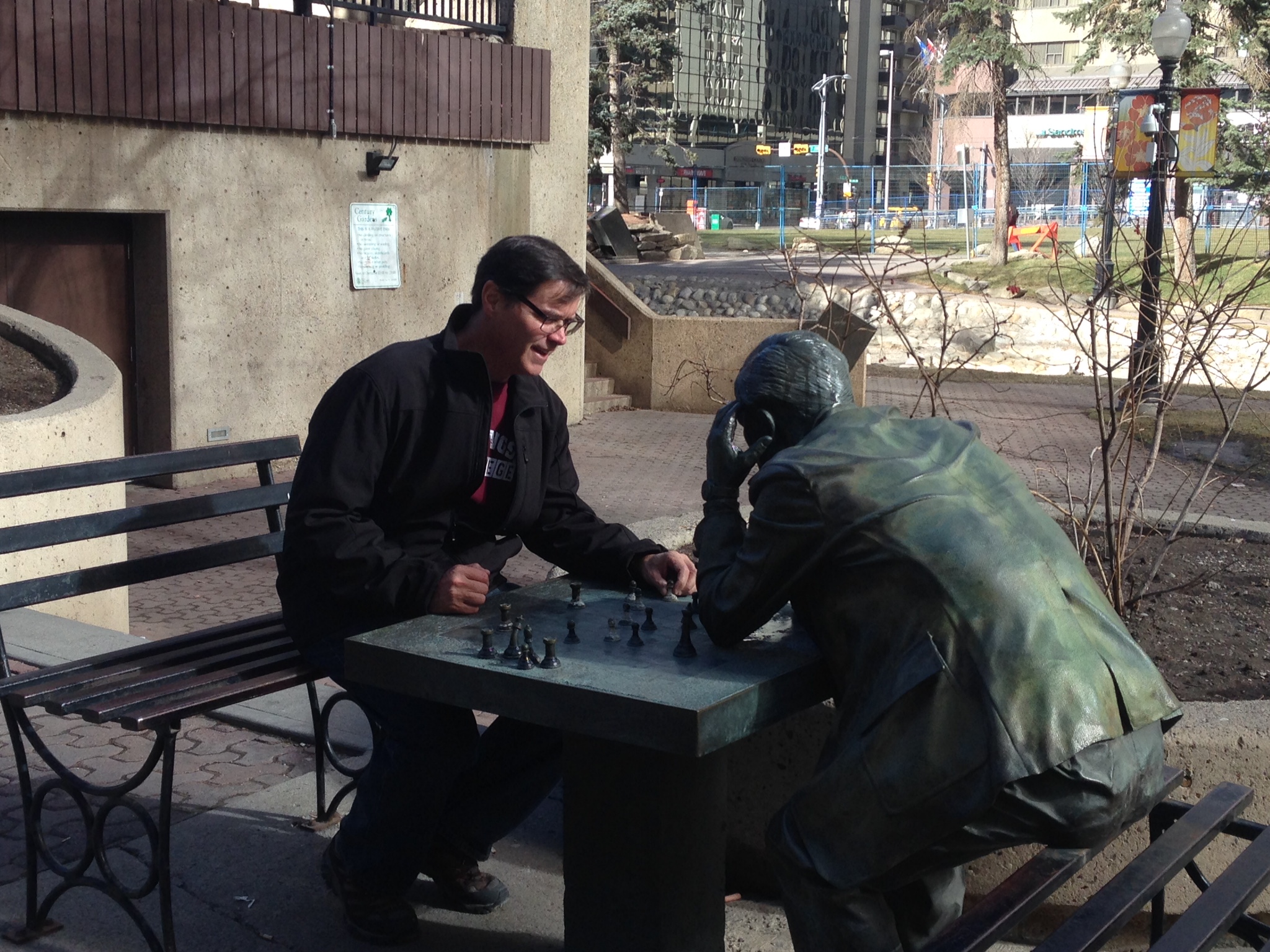 View of the Calgary Tower and partial downtown skyline from “our” condo.Calgary provided another big head photo op for Bob.