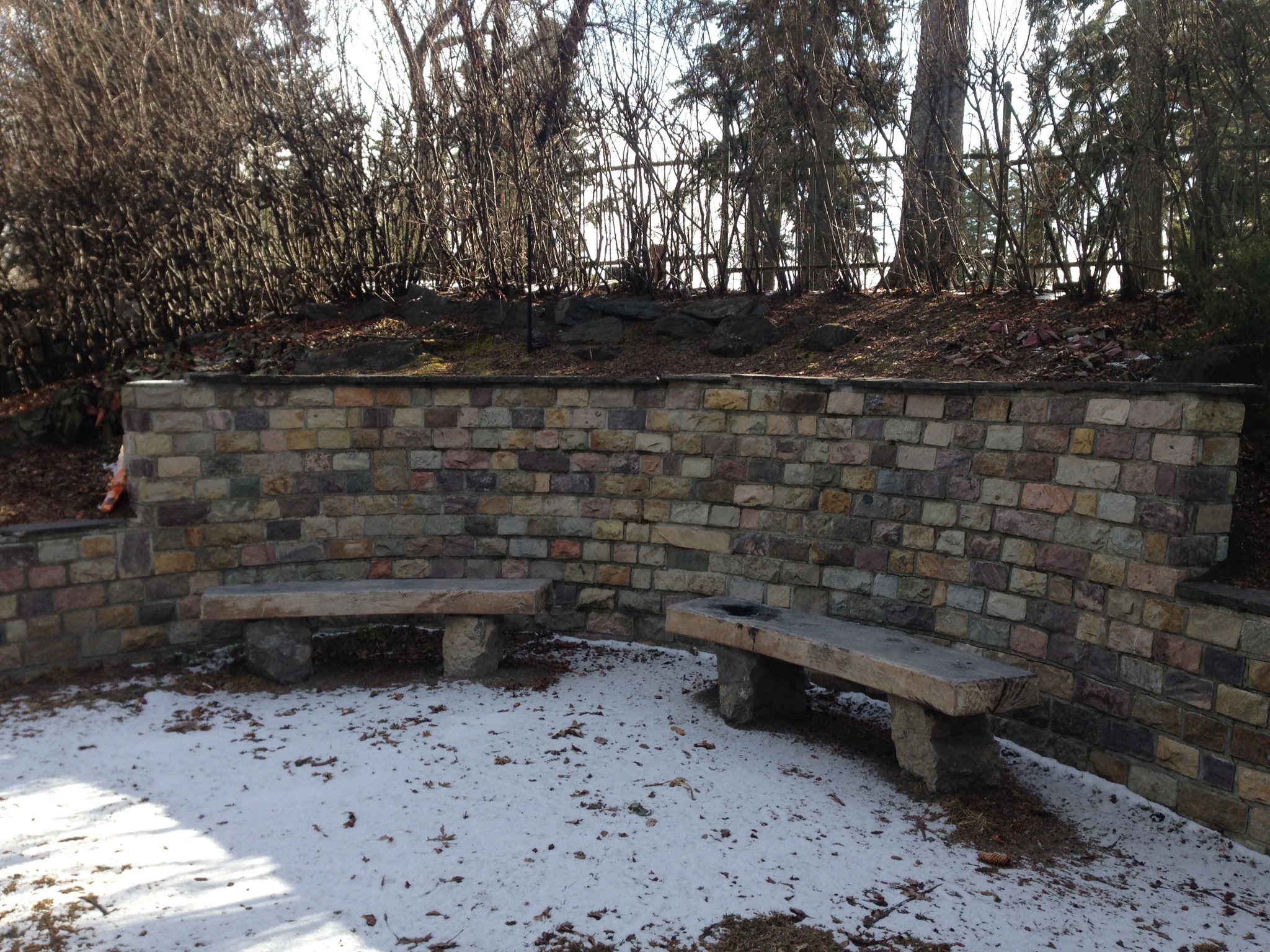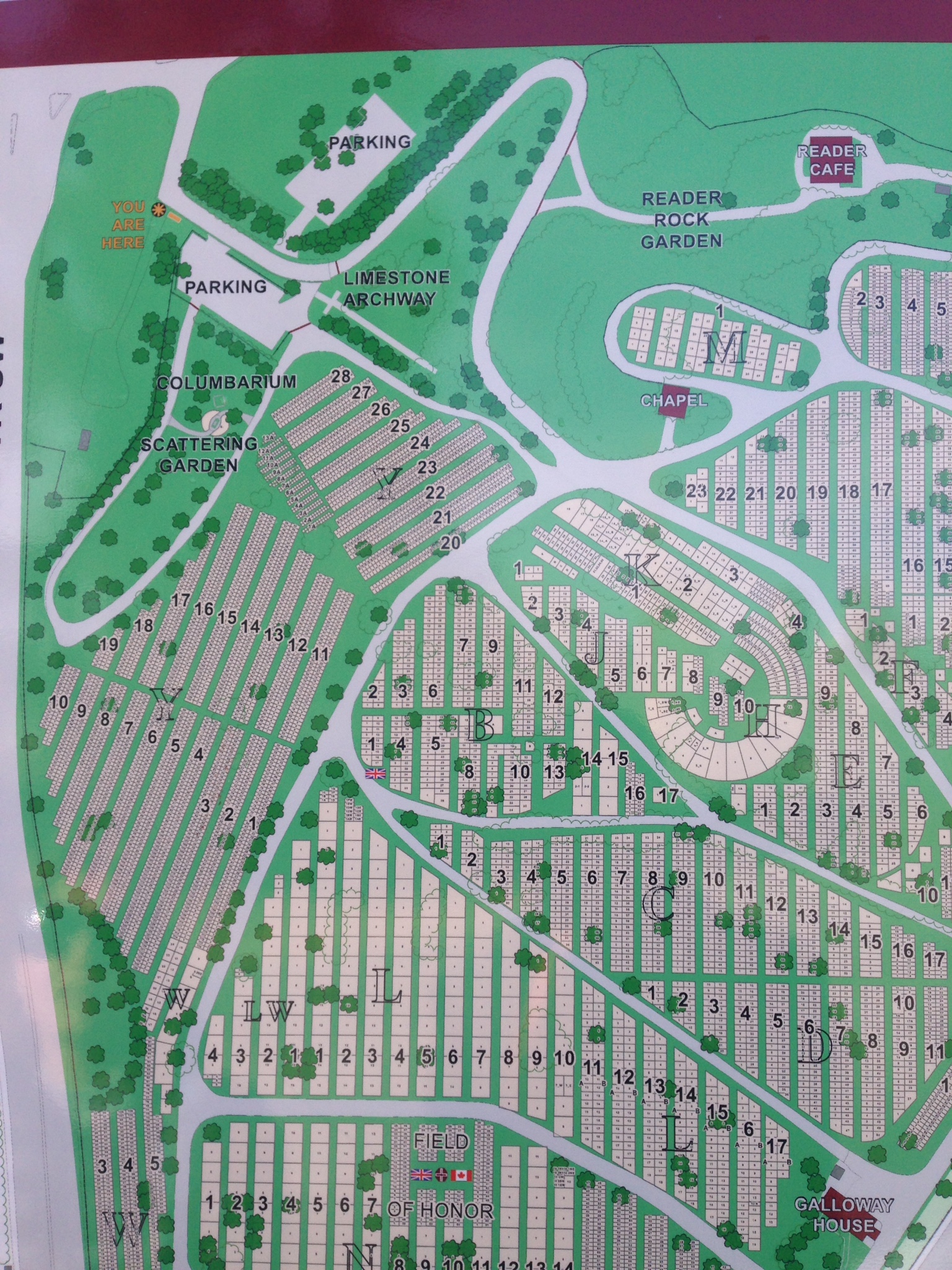 Map of the gardens and surrounding cemeteries.Former home of park director, now the park cafe (in season).Rock wall and benches inside garden.