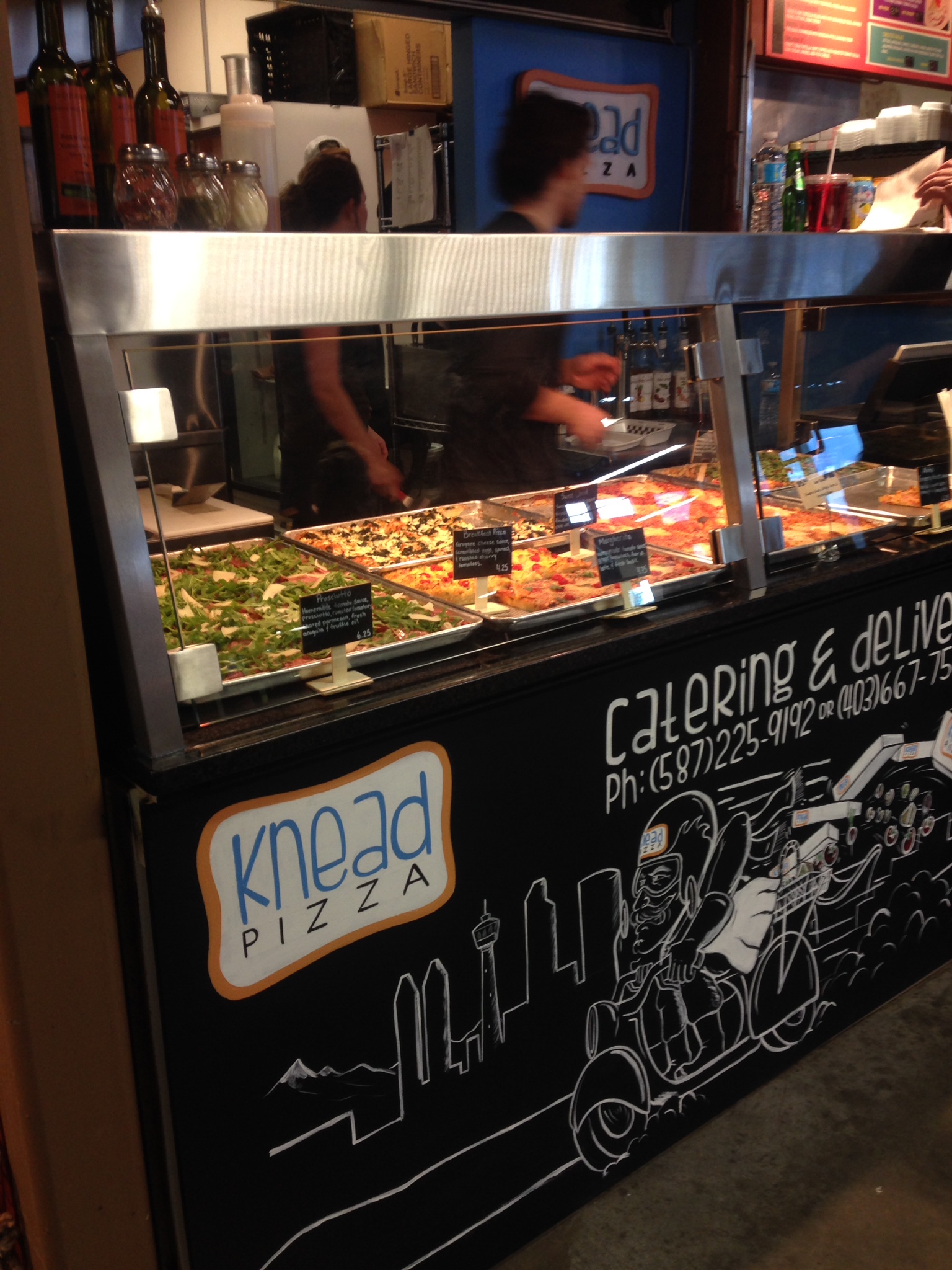 One of the outside entrances to the Calgary Farmer’s Market.Mural in CFMPhoto of some of the stallsPizza vendor serving those who “knead pizza”Just cuz we’re talking about food — the chocolate fountain from the Purdy’s chocolate shop in the mall