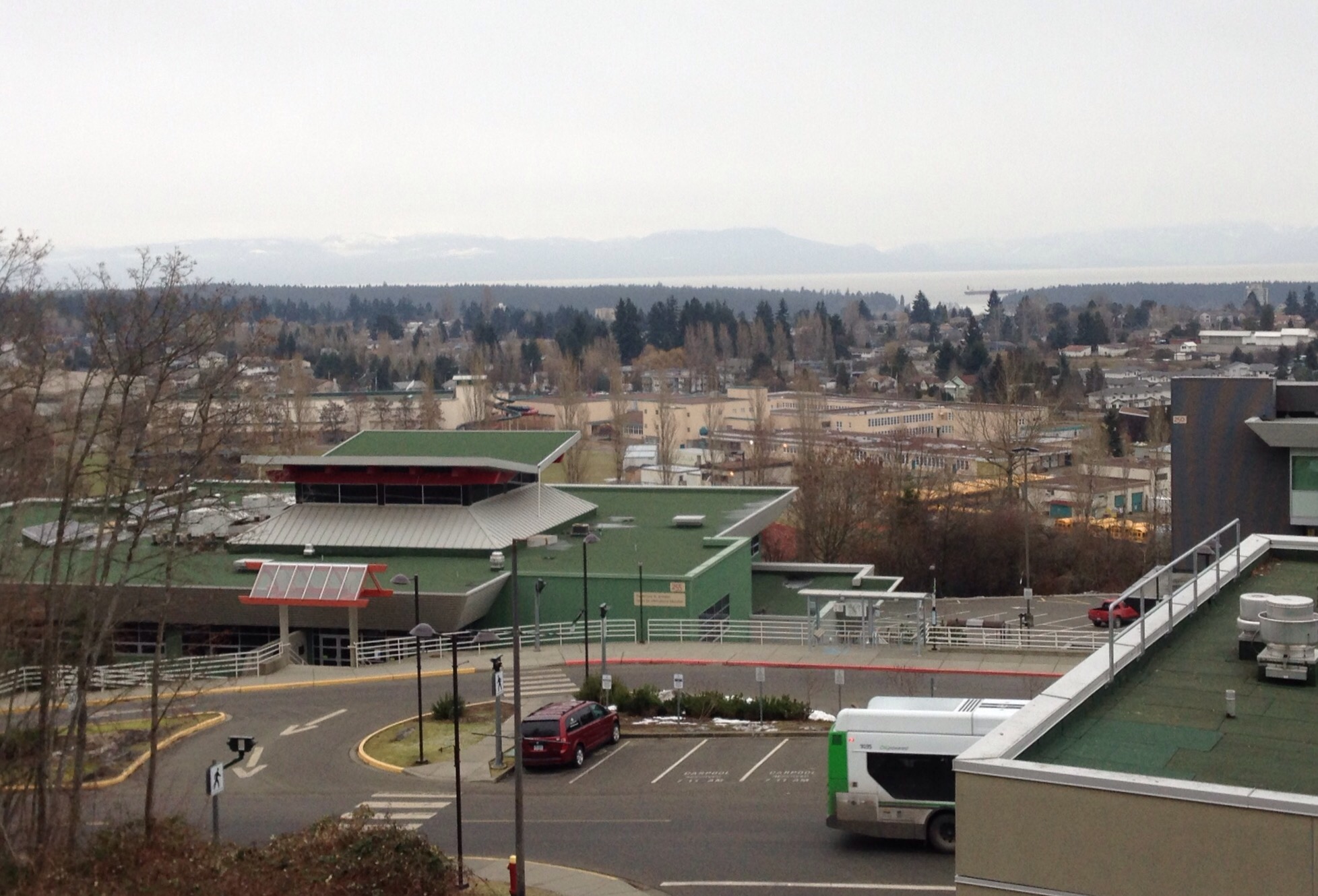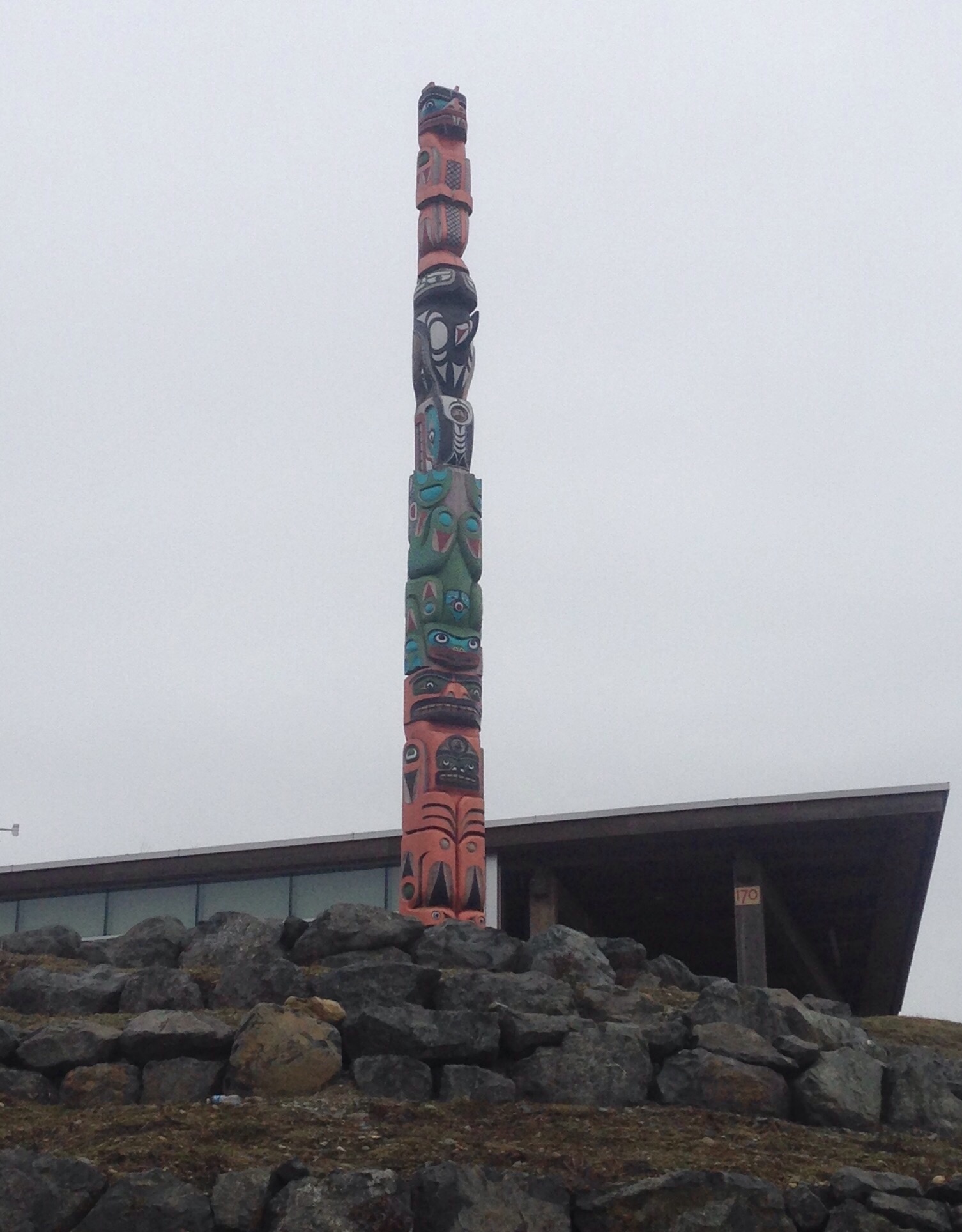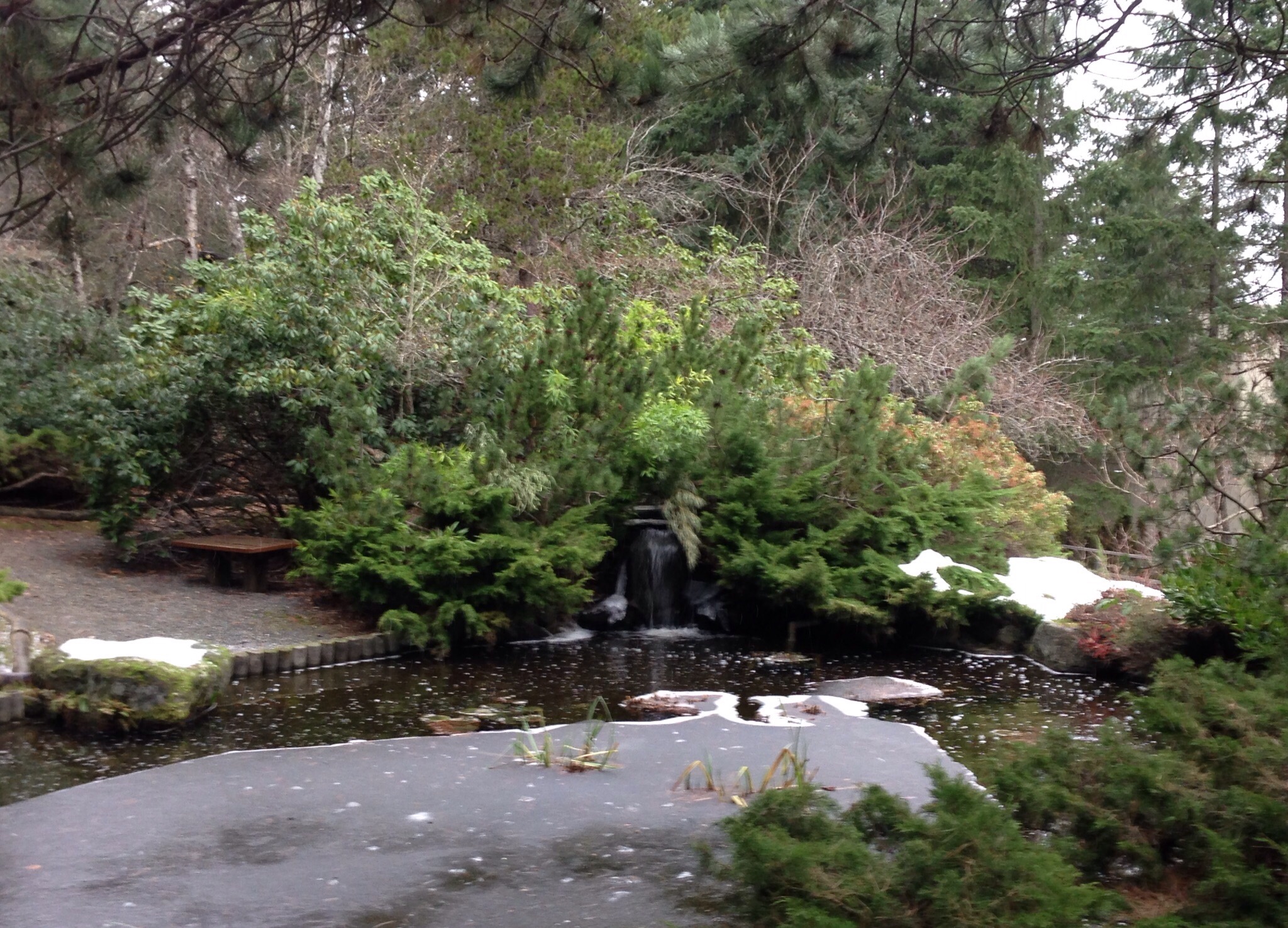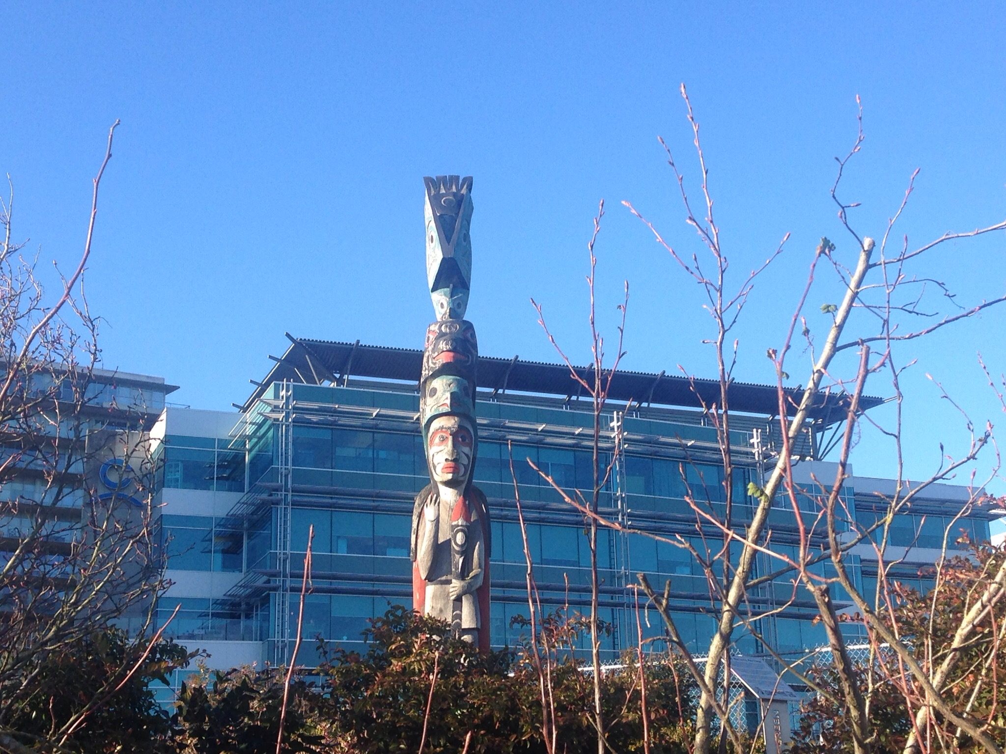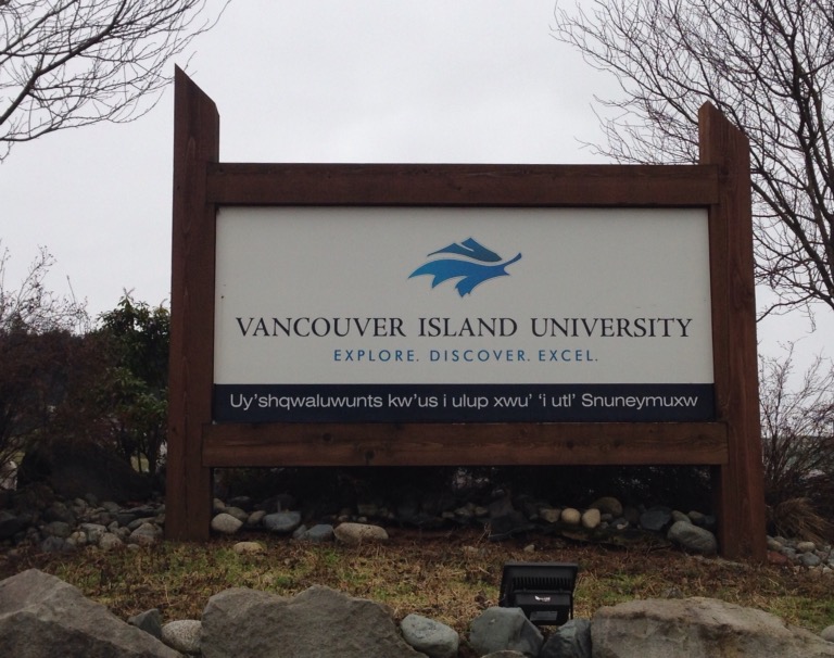 Vancouver Island University has about 16,000 full and part-time students across 4 campuses, with Nanaimo being its primary campus. It is located on a hill overlooking much of the city.The university sign — we keep wanting to find someone that can pronounce the indigenous language as it looks so complex!One of the totems at the First Nations gathering spot on campusLooking over some of campus and Nanaimo from the libraryThe Peace Garden, and it’s partially frozen pond, on campusAs if homework and exams weren’t enough to worry about!