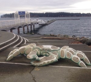 Boat Storage facilities at the start of the walk — near Departure Bay where we will take a ferry to VancouverMore boats in the harbour — go figureA view of the walking path as we head into downtown NanaimoPedestrian bridge along the walk in the downtown area“I believe I can fly. . .” — art along the walkThis crab seems desperate to get out of the seaThe Bastion, a defining symbol of Nanaimo that is even included in its coat of arms, was originally built in 1853 to assist in the protection of the new settlement