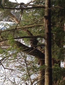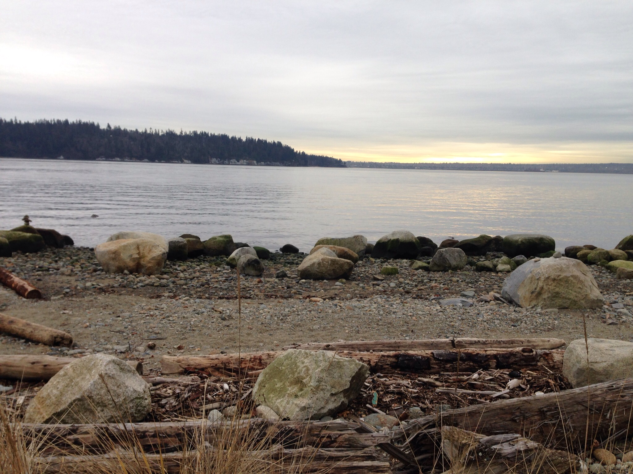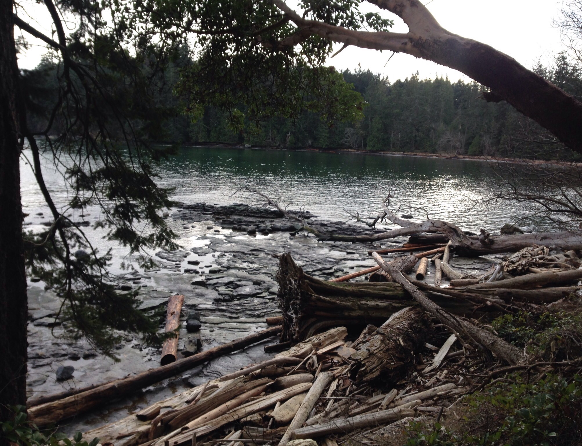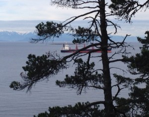 We were spotted by some masked creatures! We also saw a couple of beautiful bald eagles, but we didn’t get a good shot of either one.Looking back at Nanaimo from the island. I think we could almost swim across.One of the cargo ships anchored out in the Salish SeaThe shoreline of the island