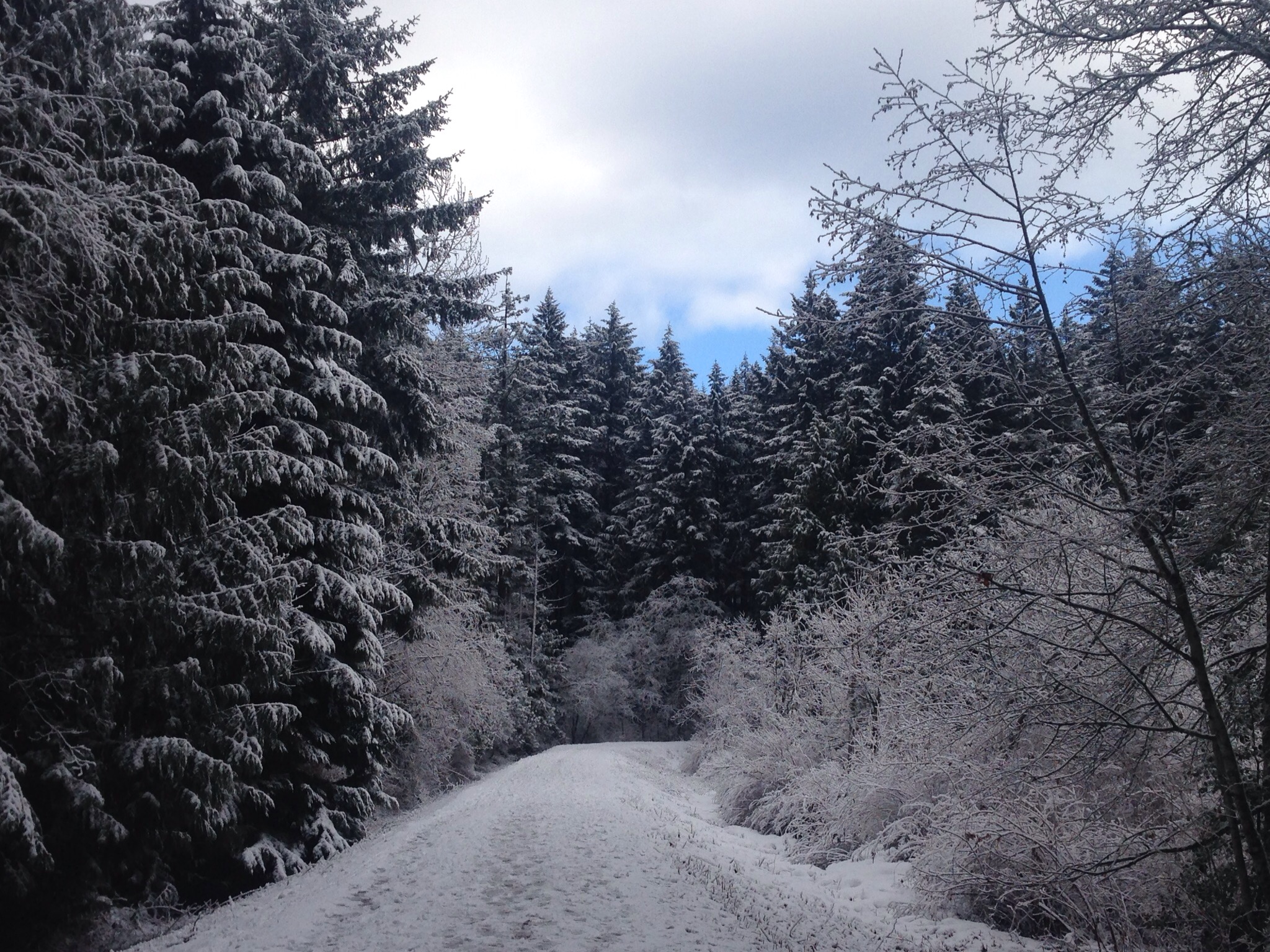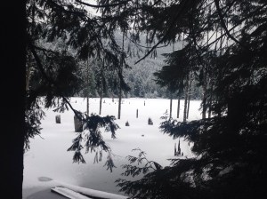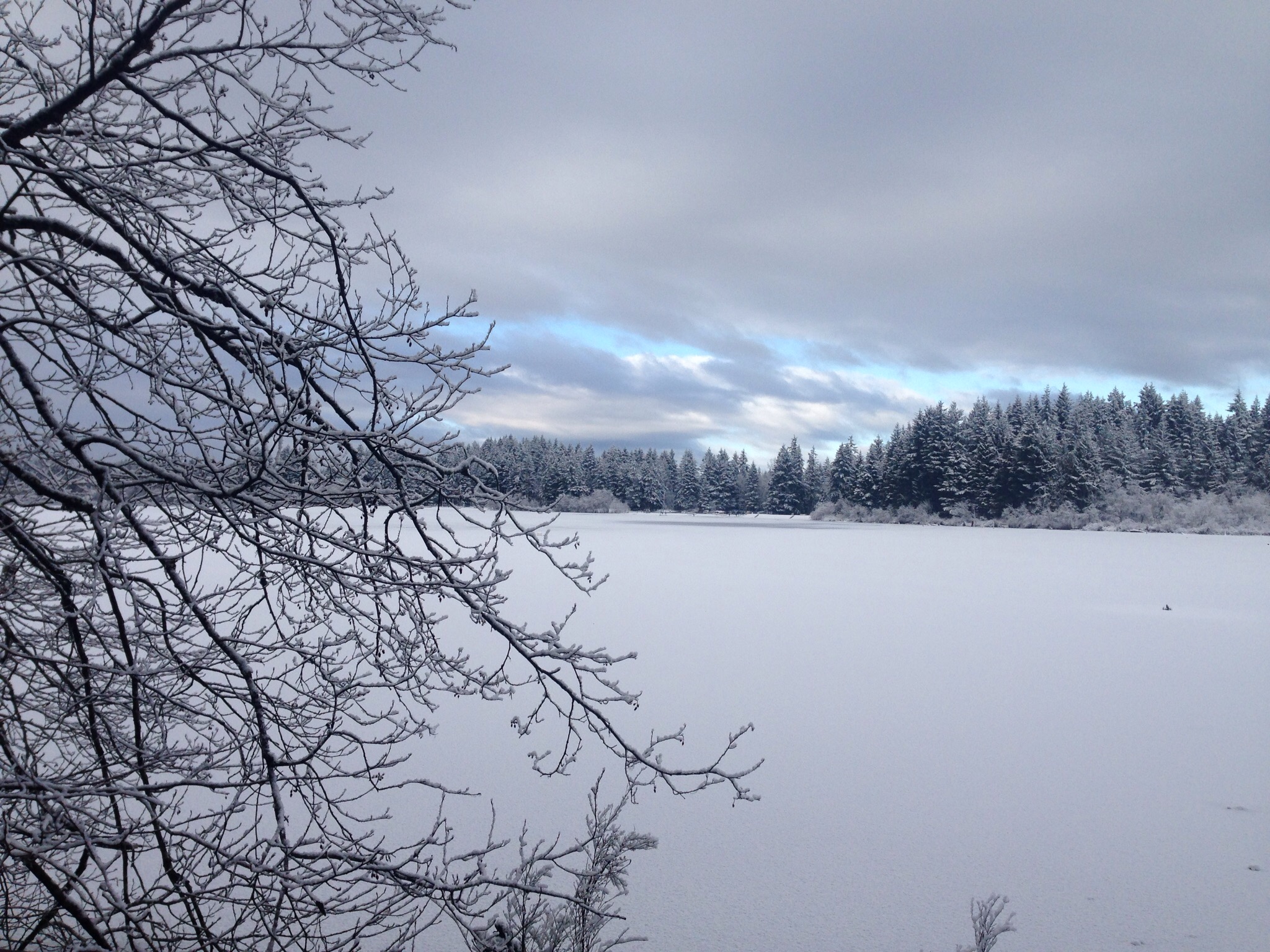 The park sign in front of the mostly iced over lakeThe iced over swimming area of the lakeOur path through the woods with the sun teasing us before we got snowed on againOne end of the lake with trees growing out of itMy favorite photo of the day