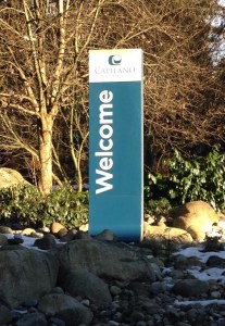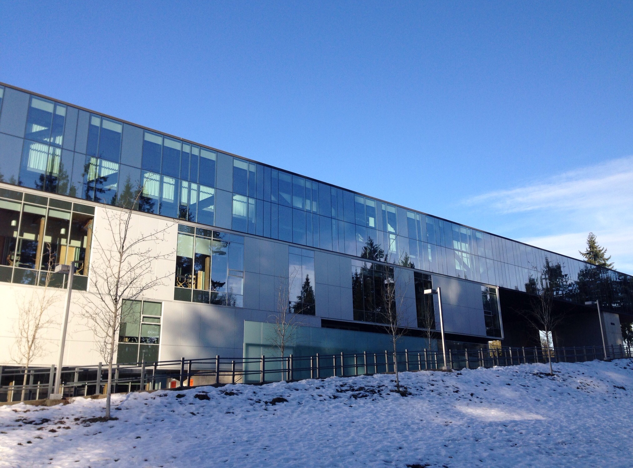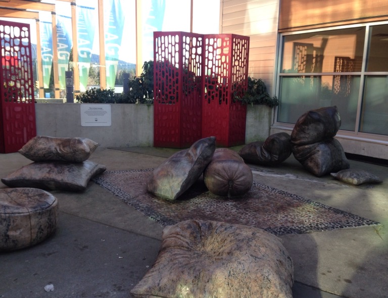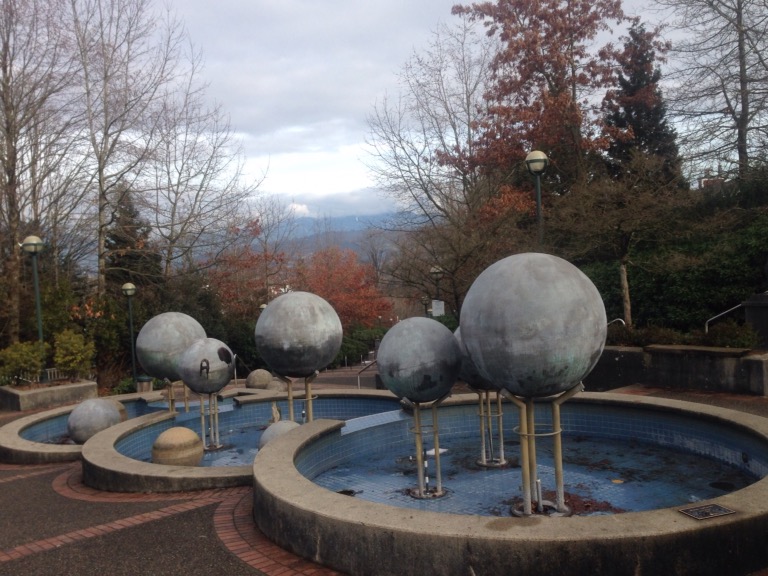 Knowing that we still had a long walk ahead of us (it took us about 2 hours to walk to Deep Cove), we pulled ourselves away from the view to walk out of Deep Cove and back through Seymour before heading slightly north to Capilano University. Per Wikipedia, this a teaching-focused university that currently has an enrollment of about 11,600. We were ther on a Sunday during winter break. We could have strolled around naked and not bothered anyone, as there was no one around. My apologies if you lost your lunch on that last statement.
