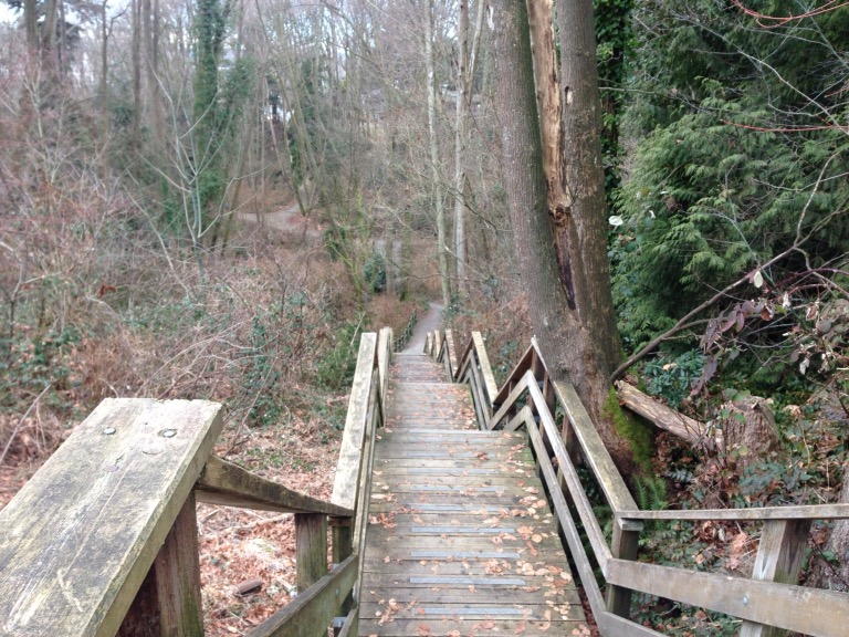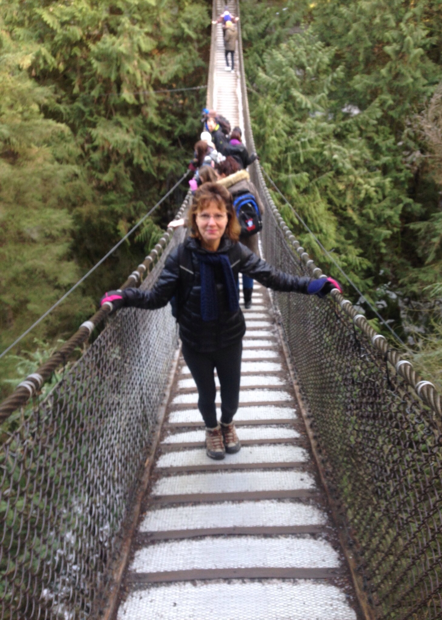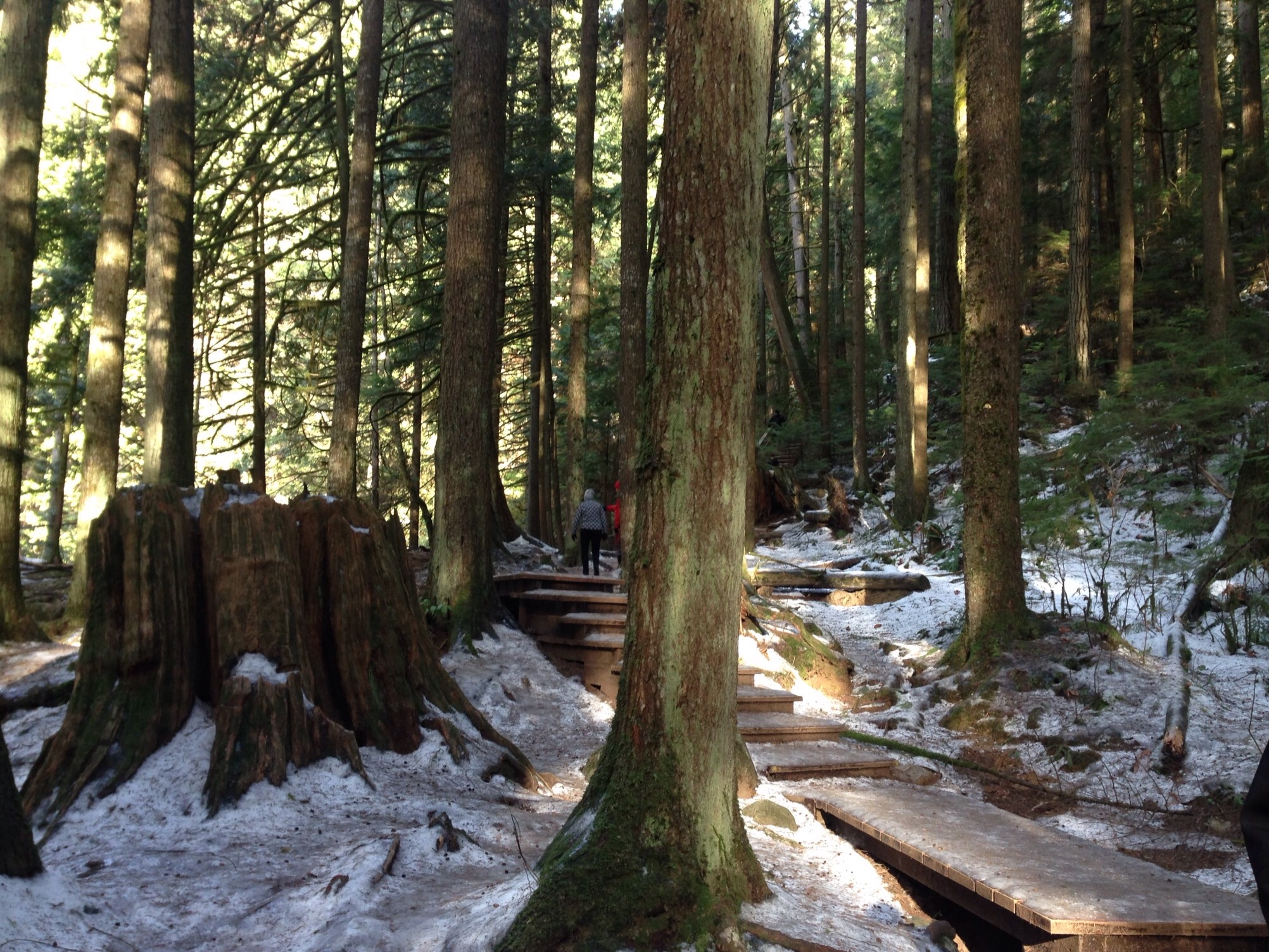 One attraction that I had wanted to explore was the Capilano Suspension Bridge. Bob had gone many moons ago when in Vancouver for work. The park now charges $39.95/person to enter which is a bit over our daily budget for this extended holiday. However, we found a local park less than an hour’s walk from the house with its own suspension bridge. The park was free to enter and was busy on Saturday when we headed out even though many of the paths were still iced over. We got to cross the bridge and get a bit of a hike in before taking in some of the public art in the Lynn Valley area.