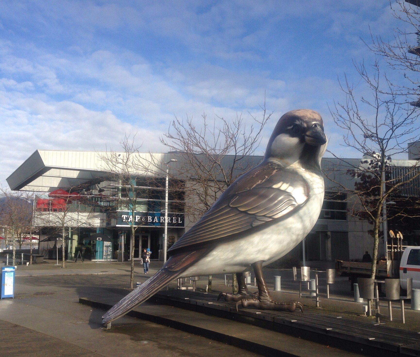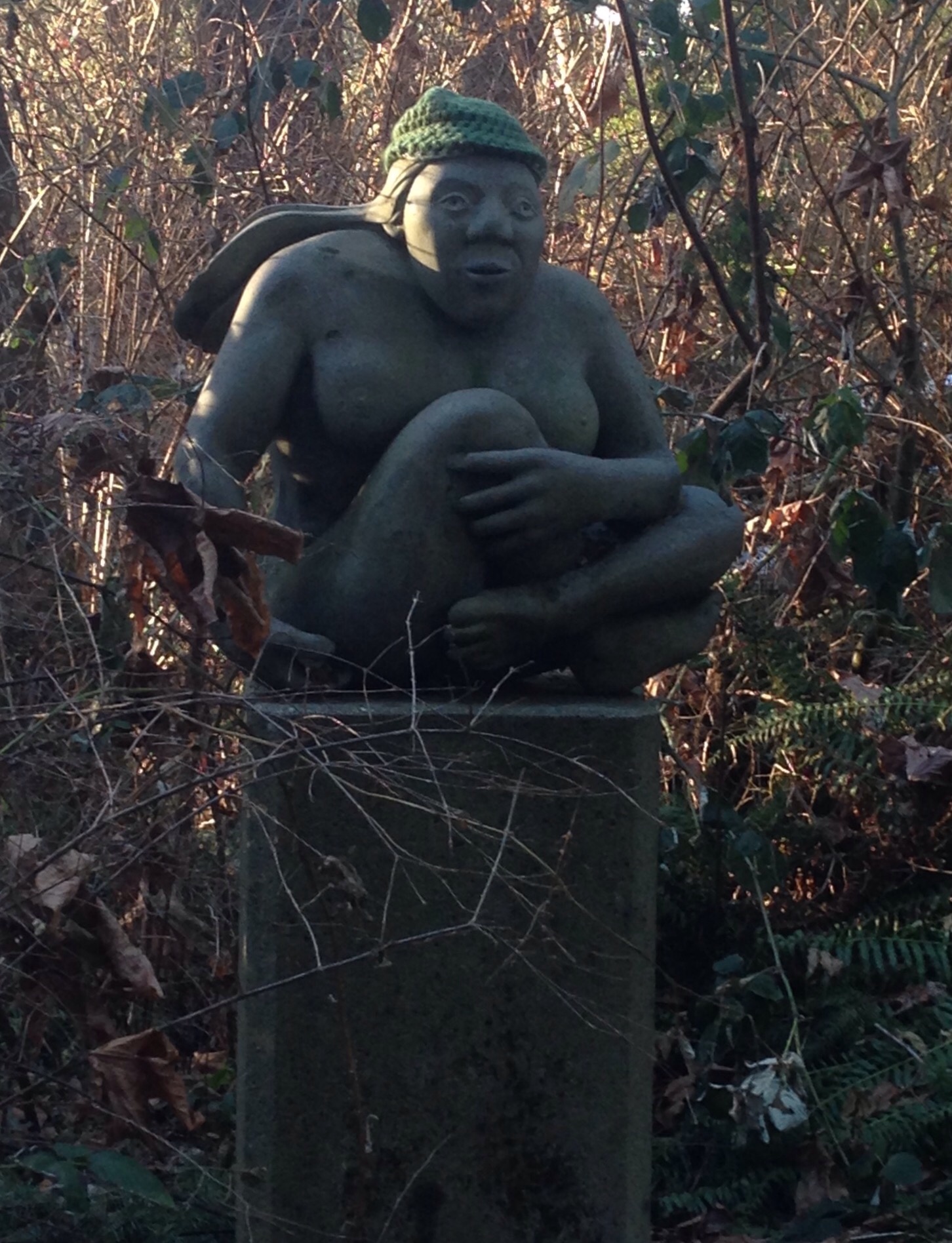 Our welcome to the small, and very forested, campusA statue along the path through the woods that connects the 2 ends of the campus. Apparently, her head appeared to be cold.What appears to be the relatively new film studies building