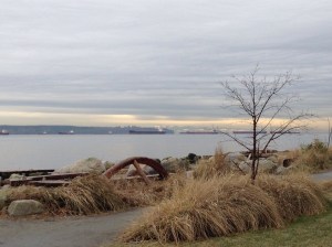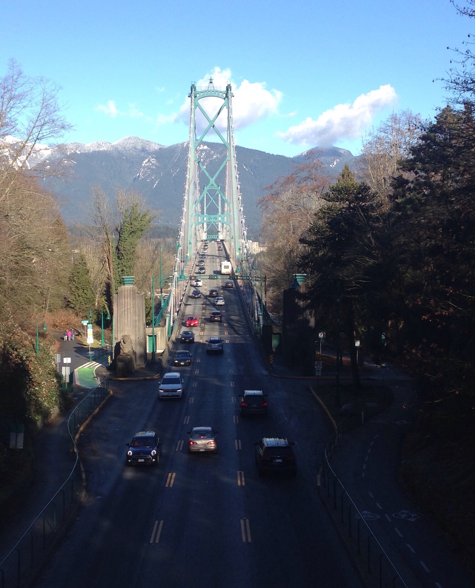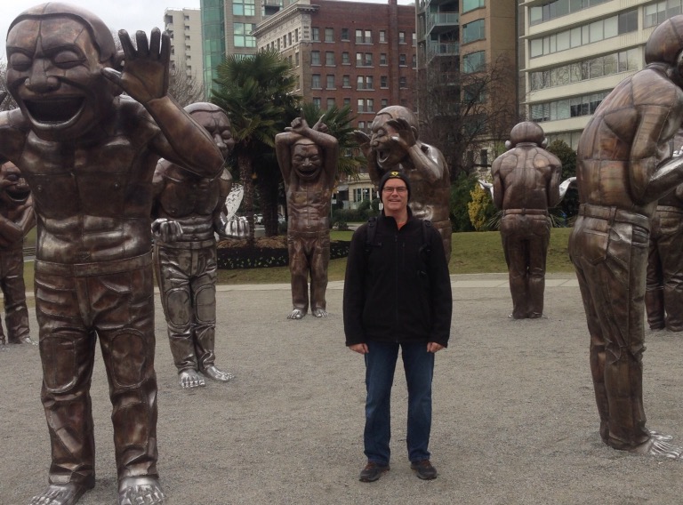 Entering the park on the way to West VancouverFun art in West VancouverCrossing a creekI love this photo. It feels like we are out of the city, but we aren’t. It also just seems like a beautiful winter day.Looking across Vancouver Harbor towards Stanley Park and the many cargo ships moored in the bay.A bench doin’ the wave by the waterAnother view of Stanley Park from across the harborA lot of Christmas/holiday lights still seem to be on here which always “brightens” a walkMural on the side of the City Market where we have done some of our grocery shoppingBob scores another big head photo!