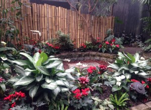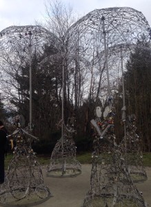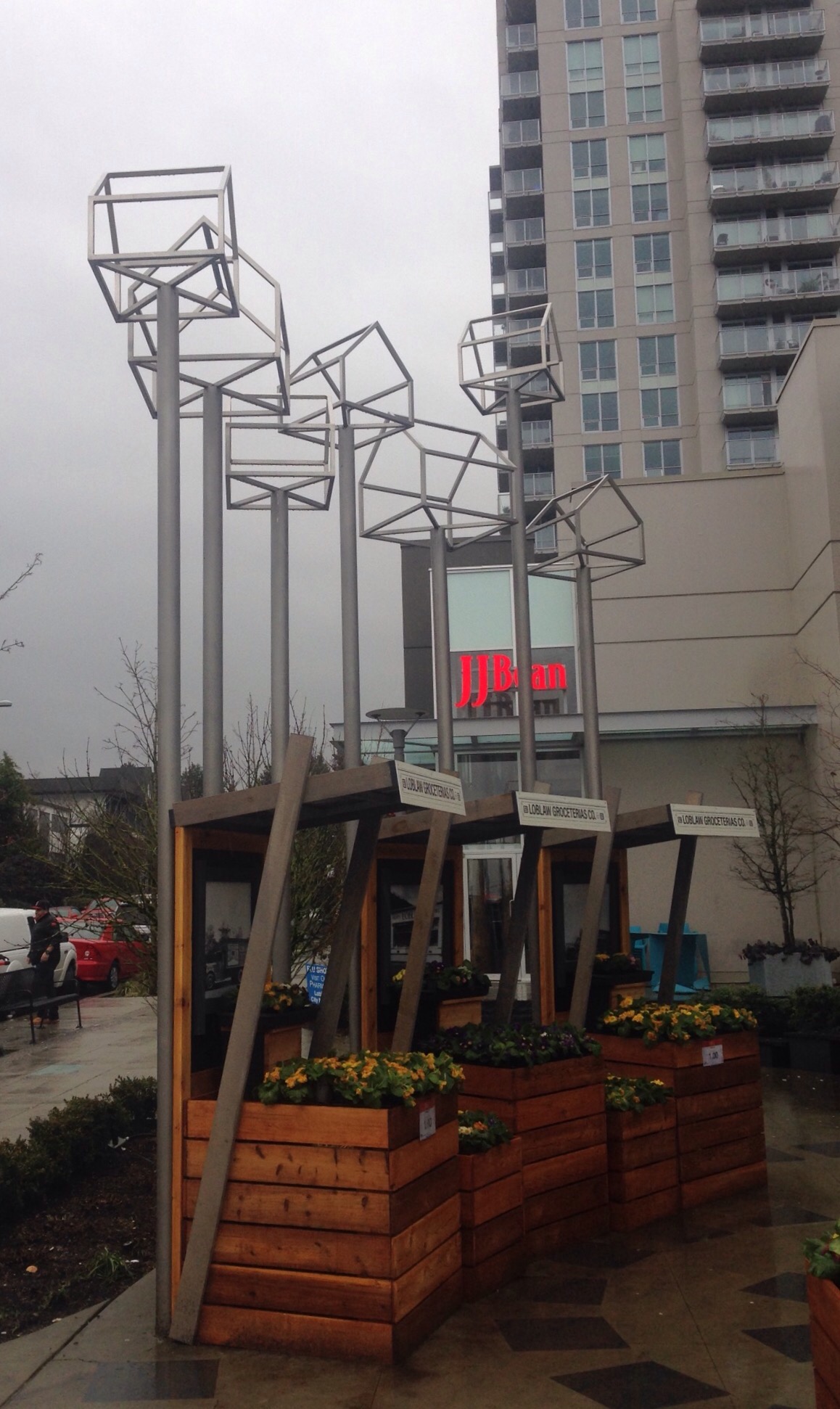 Either this installation or another one like it use to be near Stanley Park in Vancouver. We were glad to see it again and have since seen that it is no longer near Stanley Park.I call this Houses on Stilts. It was near the grocery where we usually shopped.There are three of these figures all involving flowers/plants.