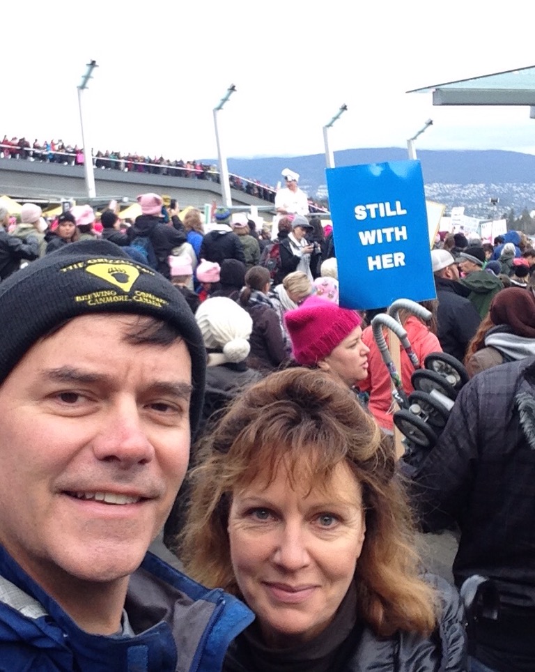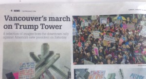 Awesome to hear from my friends and sister participating in events across the US. We were excited that Vancouver held their own March, so we could participate.Bob spotted us in the crowd photo in the Sunday paper. We are to the left of the woman holding the sign “A Woman’s Place is in the Revolution.”