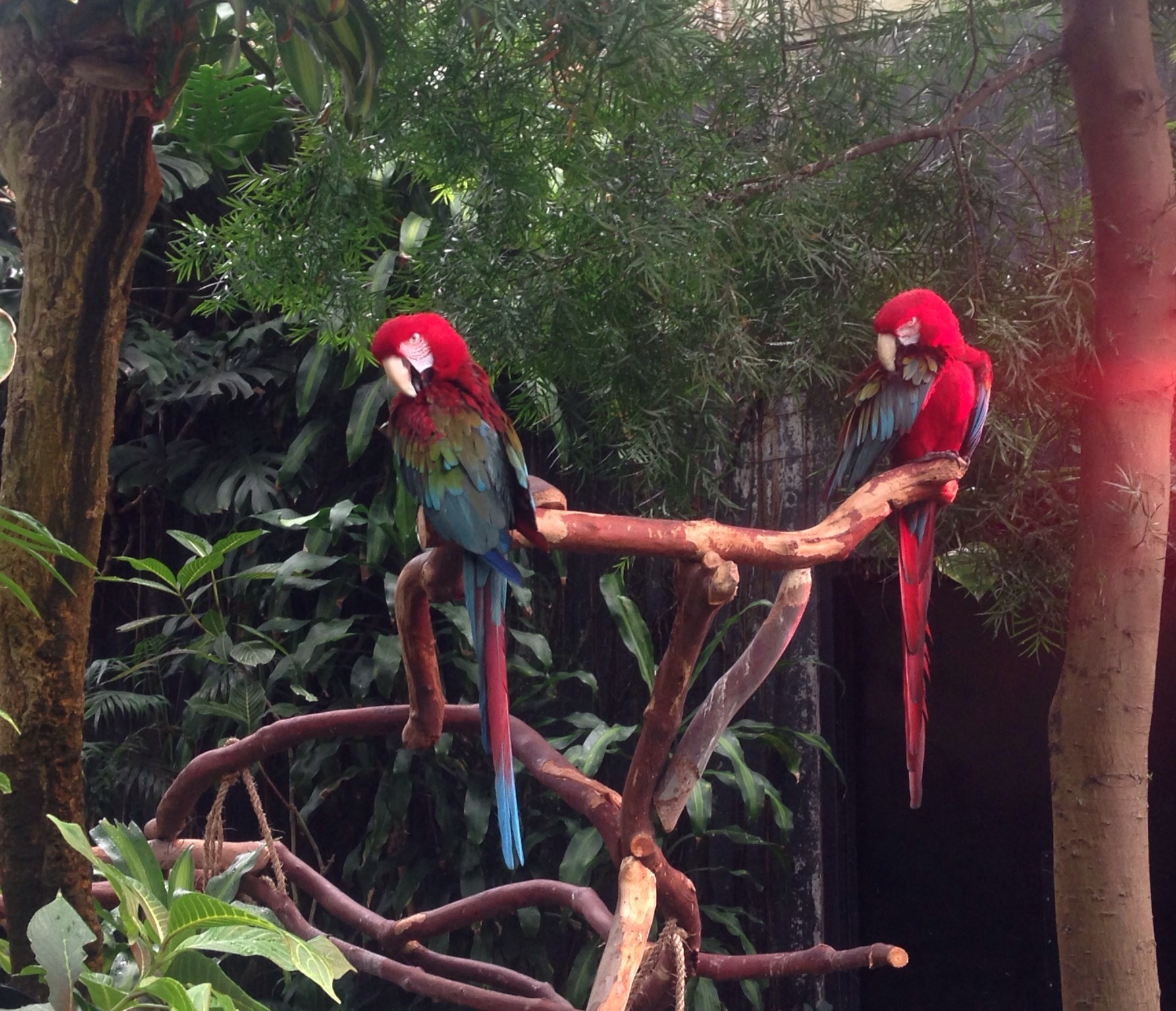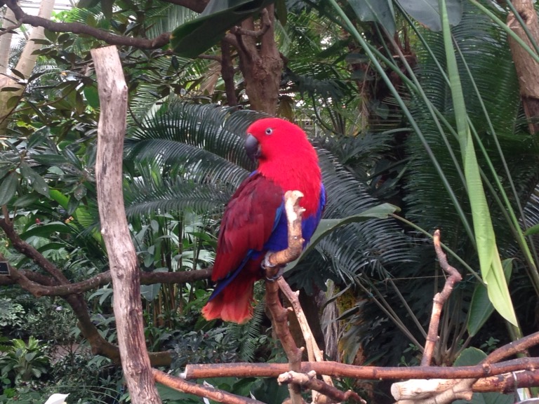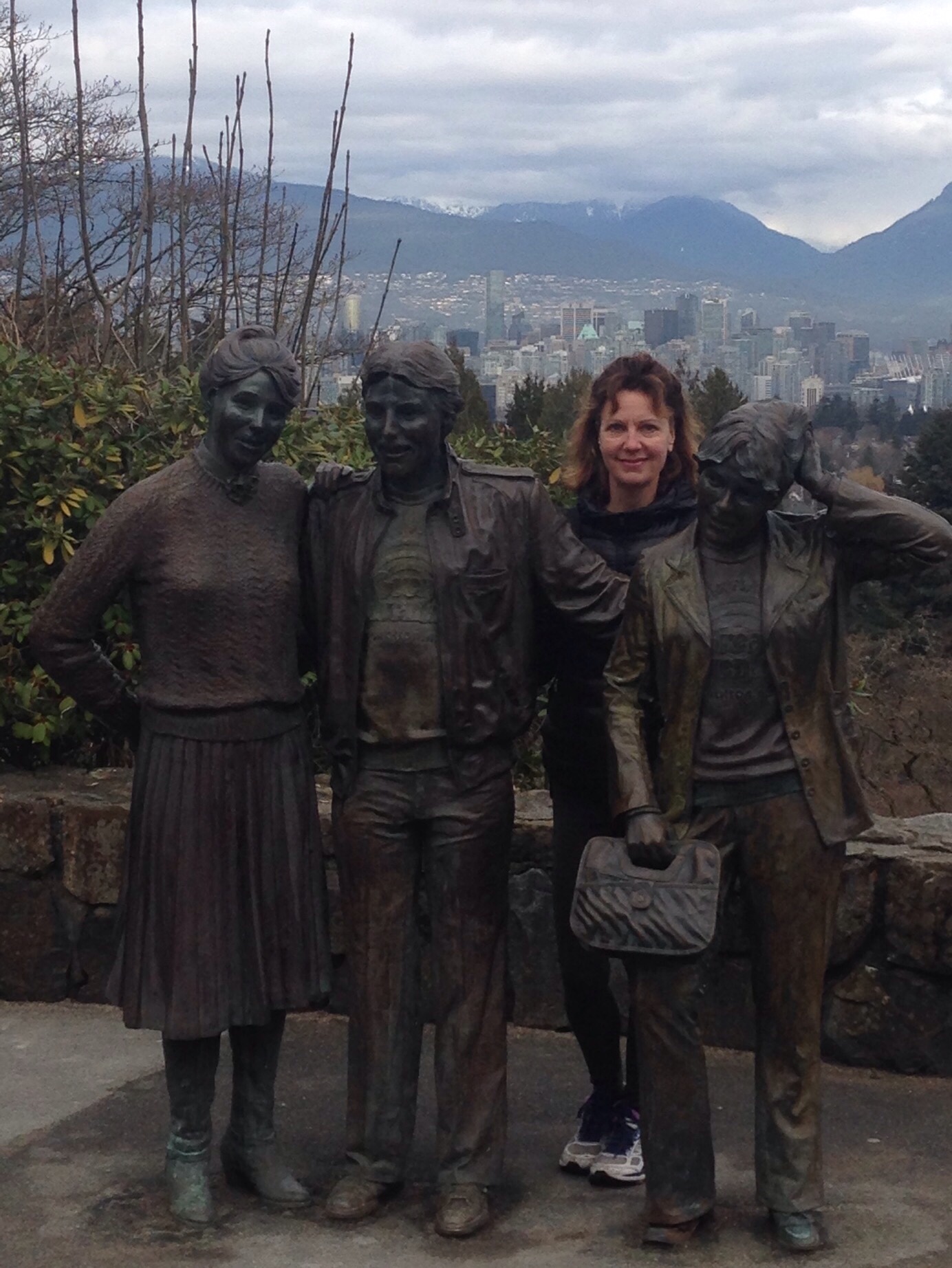 We took the sky train to the outlying city of Burnaby one day and then walked back into town. This is the top of a stairway that took us from the residential neighborhoods all the way down to Deer Lake and a lovely (though still snow covered) walking/running path.Looking across Deer LakeLooking back towards the City of Burnaby from Deer LakeFrom Deer Lake, we walked across Hwy 1 to Burnaby Lake, a larger lake, but which is more sheltered by trees. Also has a good walking/running path around it.Part of the path around Burnaby LakeOn Friday we walked south across the bay to visit the Bloedel Conservatory in Queen Elizabeth Park. I joined some “locals” for a photo.Another view of Vancouver from Bloedel ConservatoryMaria and Carmen, the Conservatory’s red parrotsSome of the flora in the ConservatoryBob and I thought Ruby was the prettiest bird in the place.Part of Queen Elizabeth ParkBob and I have seen lovers locks on bridges all over the world, but we really like this way of incorporating this trend into public art.Vancouver City Hall which is located on the top of a hill in a neighborhood south of the downtown areaVancouver’s famous steam clock in the Gastown area (where we have been staying). It announces the quarter hours with a whistle chime.