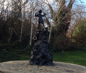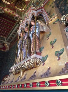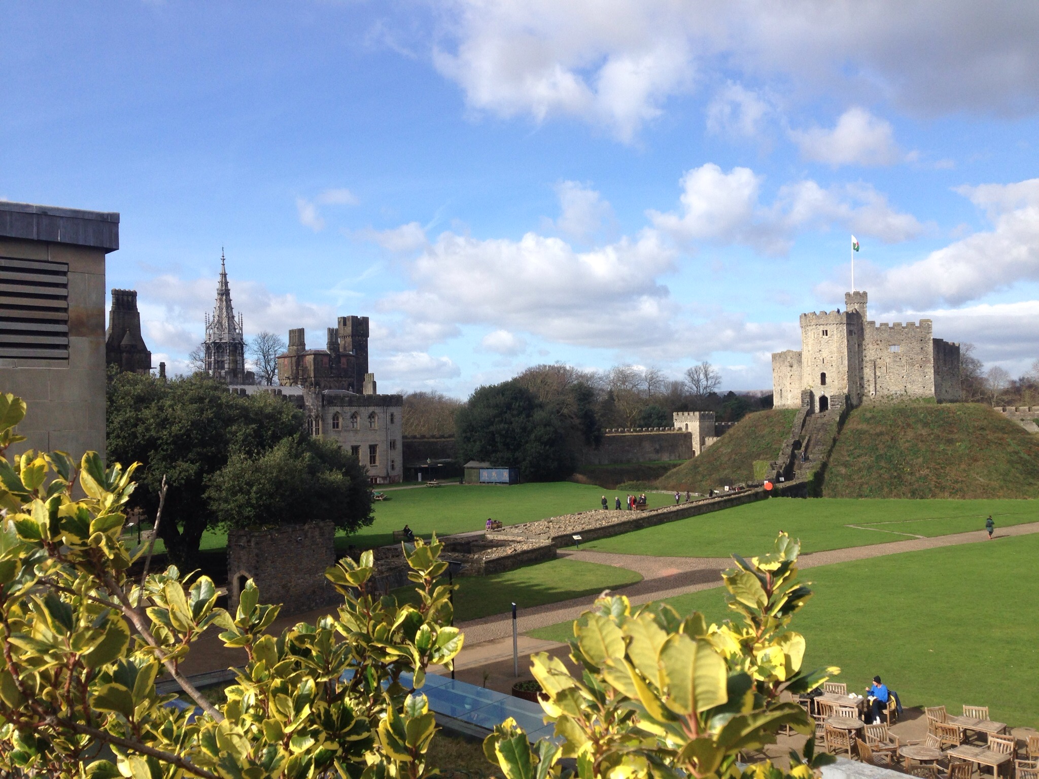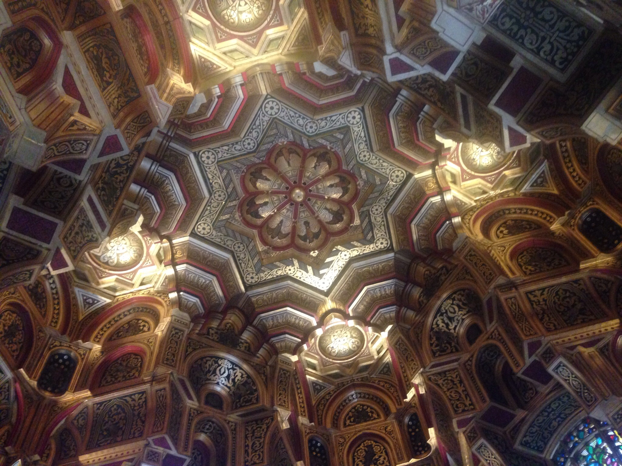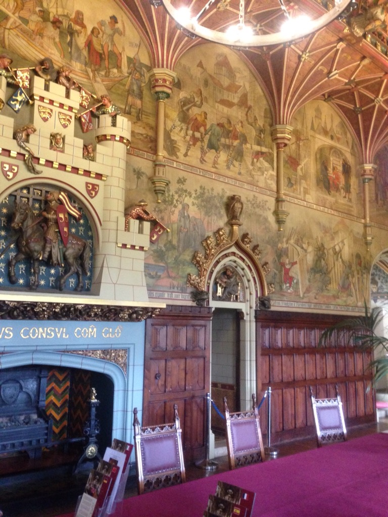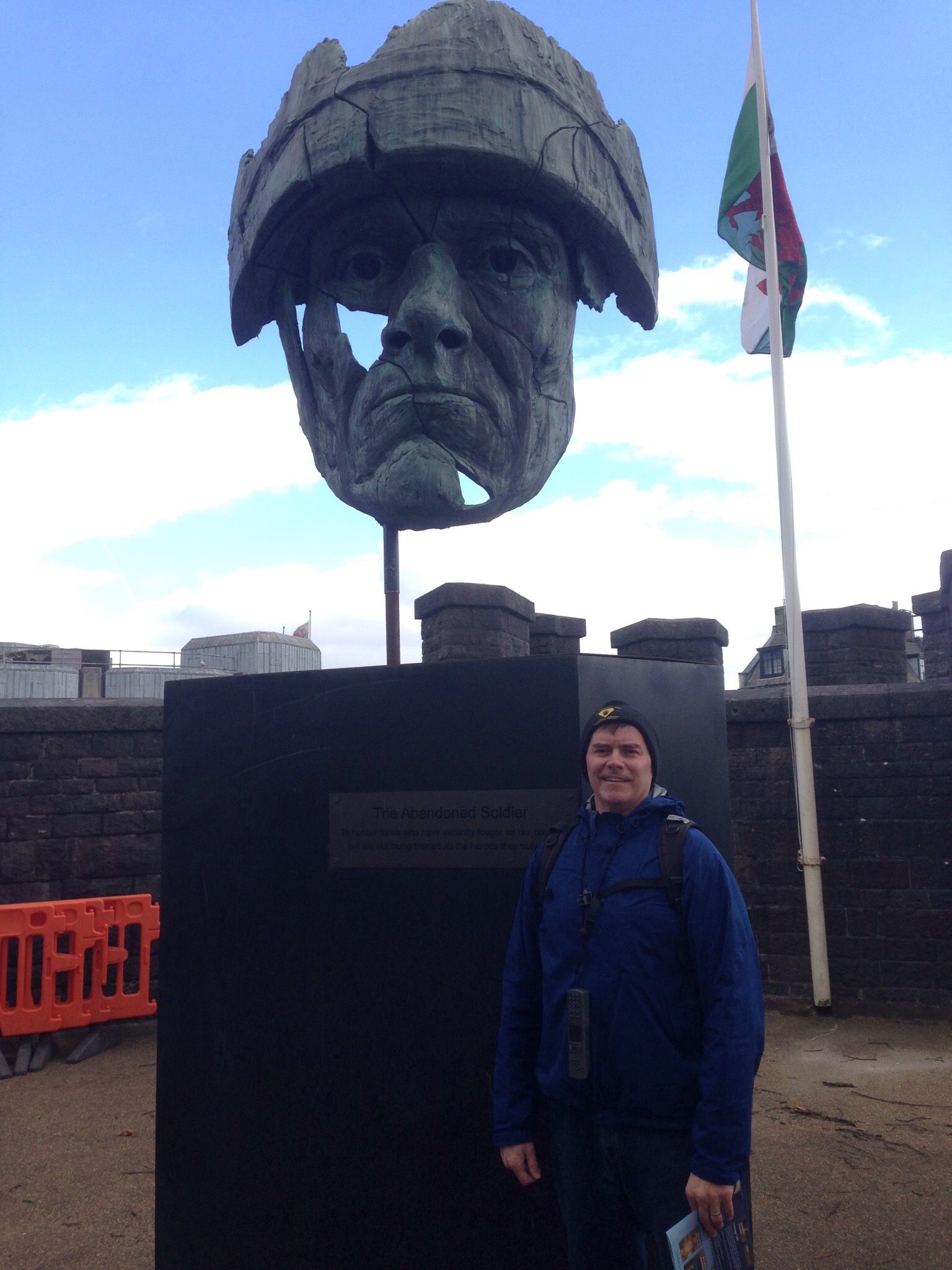 This is Welsh Rarebit, basically toast with a savory cheese sauce (has a bit of Worcestershire sauce in it) and some bacon bitsSausage and MashLaverbread, basically boiled seaweed. I ate it plain or mixed in some Wheatabix with it. Despite its appearance, I liked it. Apparently, it is typically rolled in oatmeal and then fried as part of a Welsh breakfast that would also include bacon and cockles.We spent much of our last full day in Cardiff touring Cardiff Castle in central Cardiff. We had stopped here on our last visit but hadn’t toured the grounds. This time we toured the grounds as well as the house. The grounds were originally the site of a Roman fort built around 50 AD. Some of the Roman walls still remain. It was later used by the Normans as a fort as well. The property passed through the hands of many noble families before being inherited by the 2nd Marquess of Bute, a Scott, who renovated much of the facilities, including turning the home into his view of a Medieval Castle. He and his family lived here only 6 weeks per year, but he is fondly regarded in Cardiff as he turned the city into one of the world’s leading coal exporters. Bob and I kept thinking that the name sounded familiar and through the power of Google we were able to confirm that he is the same gentleman who also had the castle in Thornhill, Scotland that we toured last year!The “house” that we touredThe banquet room that is still used today. You can rent this for the small sum of 600 pounds — per hour!Figures over the fireplace in one of the roomsThe beautiful ornamental ceiling in the Arab roomA broader view of the grounds with the house on the left and the moat-surrounded keep (fort) on the hillLooking into the center of the keep from the towerThe inside of the walls that run along the perimeter of the grounds. These were opened to the public as shelter during WWII.Another Big Head moment for Bob — a sculpture in support of soldiers who were not always treated well upon their return from war.