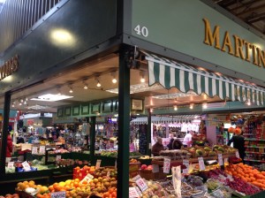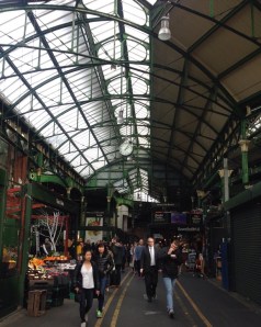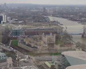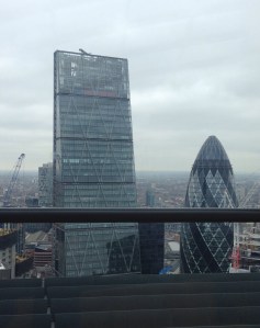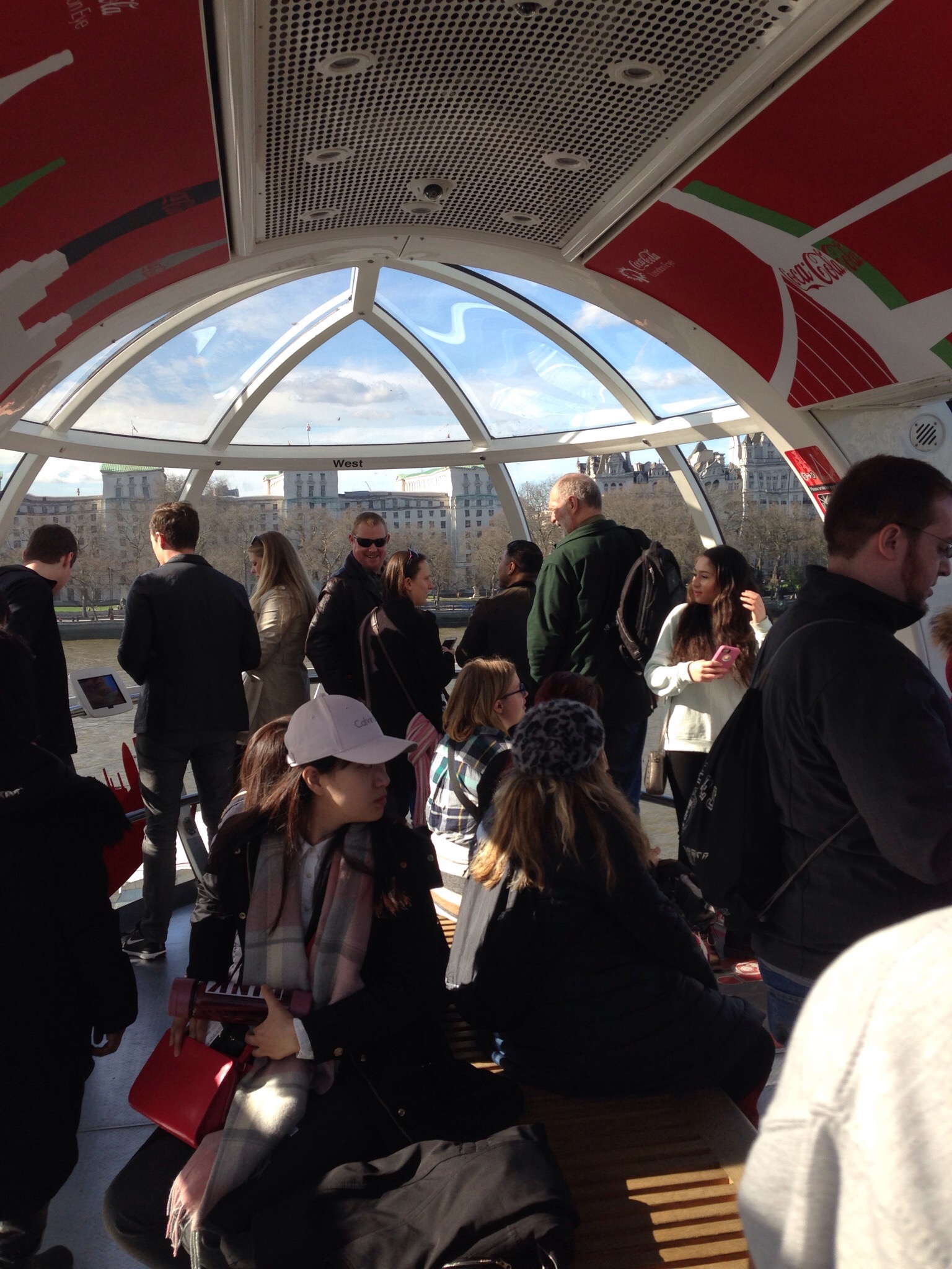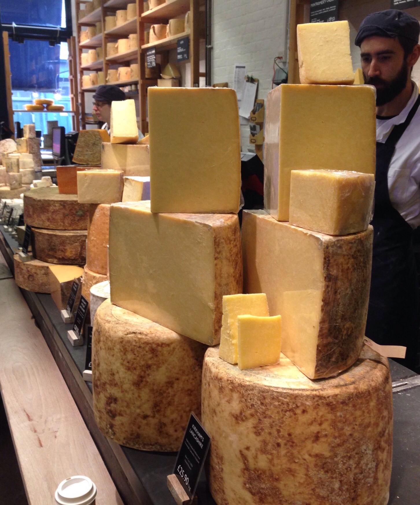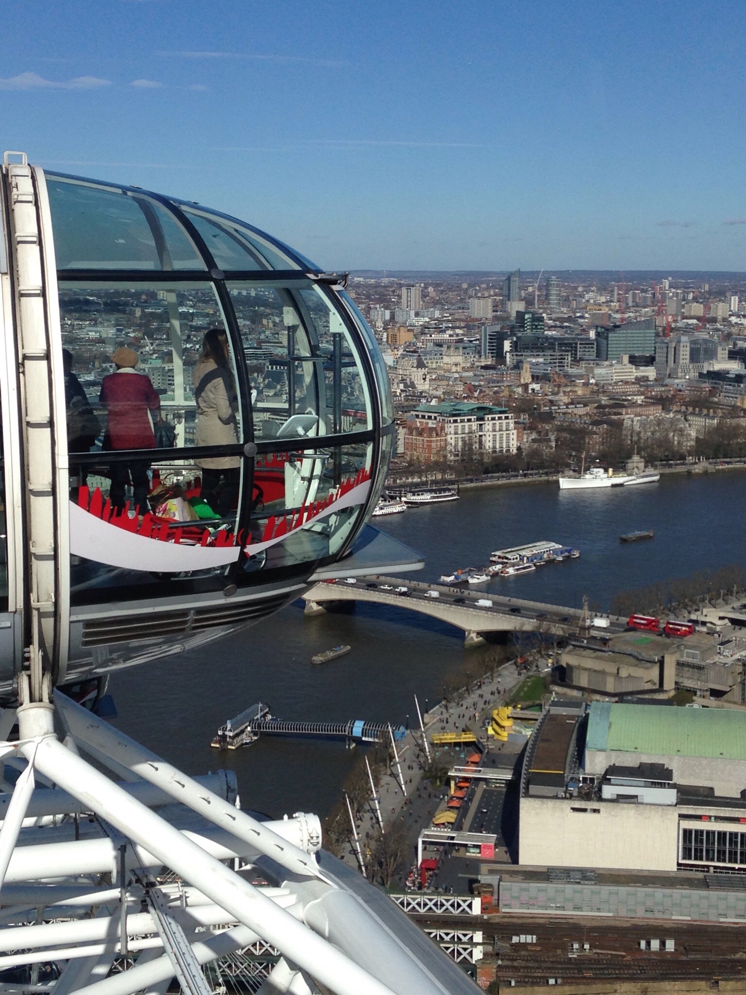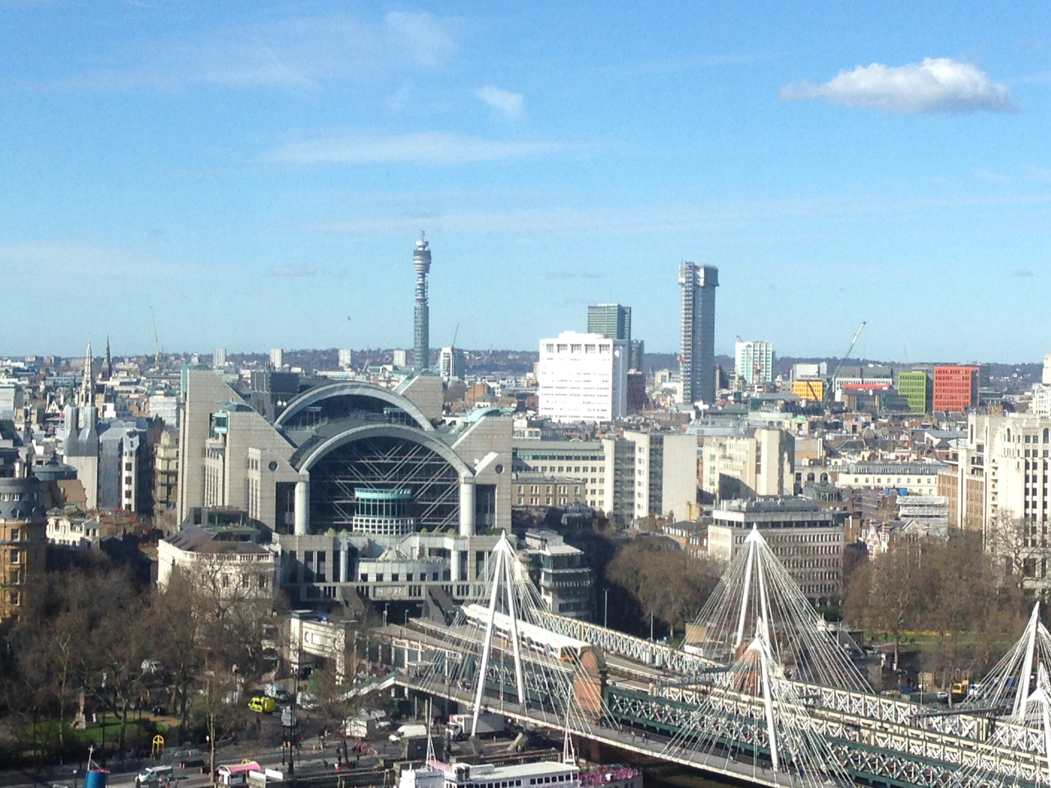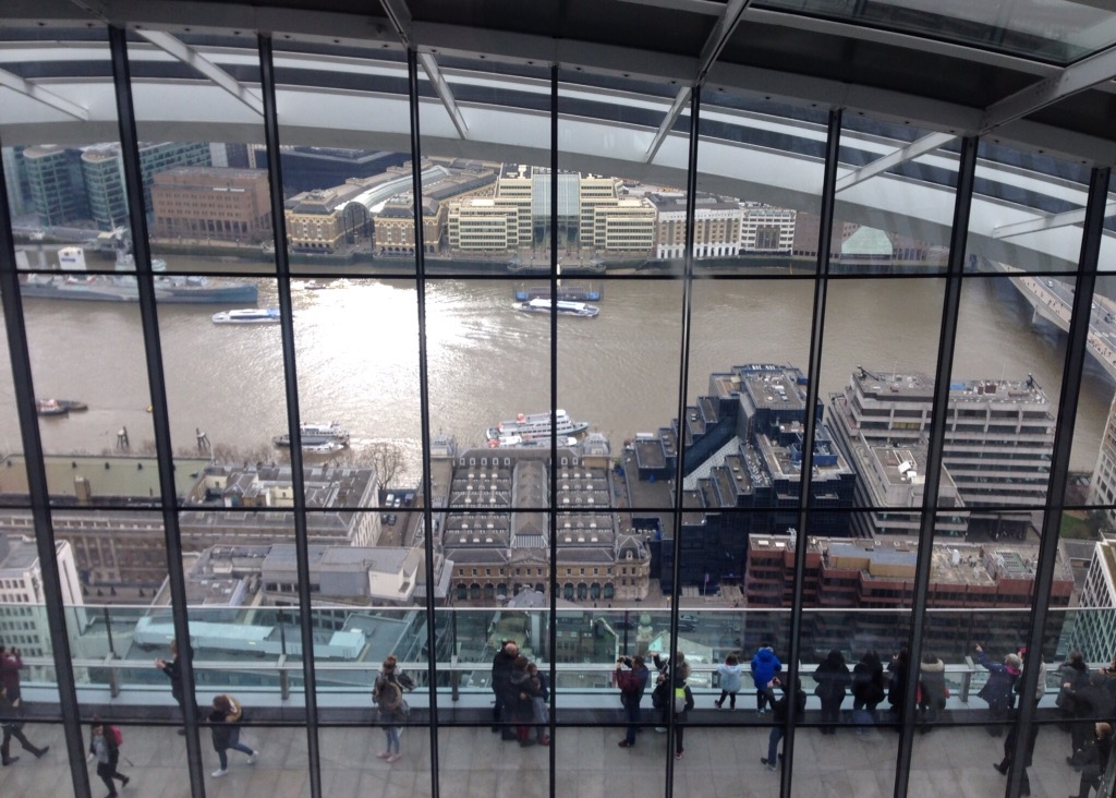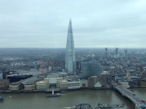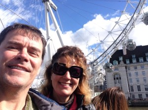 Getting started on our boat cruise on the Thames in the midst of a group of school children. The tour was narrated, but the nice man and his microphone were no match for the kids’ banter!An eye for an eye — our view from the boat before our ride later that day.Some modern buildings along the Thames. Note the one in the center-right of the photo. This is known as the “walkie-talkie” building which houses the Skygarden discussed later in the post.A newer bridge for trains with the red posts from the former bridge retained as it was determined to be too dangerous and expensive to destroy them.Tower Bridge (but then you knew that)Bob and I queuing for the Eye, as you doI spy with the help of an Eye — BT Tower, etc.In the Eye pod with 20 or so of our closest friendsOur fellow travelers in the next podLooking down on the Thames and the HMS Belfast from the top section of the Skygarden, the 36th floor of the “walkie-talkie” building.Looking in the opposite direction, the building on the right is apparently known as the “gherkin”Looking out over part of the garden and cafe areas of the SkygardenMore of the gardenThe Tower of London from the SkygardenThe Shard, a 95 story building, the tallest building in the UK and the fourth tallest in EuropeLamps on London Bridge with the Millenium Bridge in the backgroundA different view of the Tower BridgePart of the Borough MarketA famous store for cheese-o-philes, per BobPart of their cheesy selection