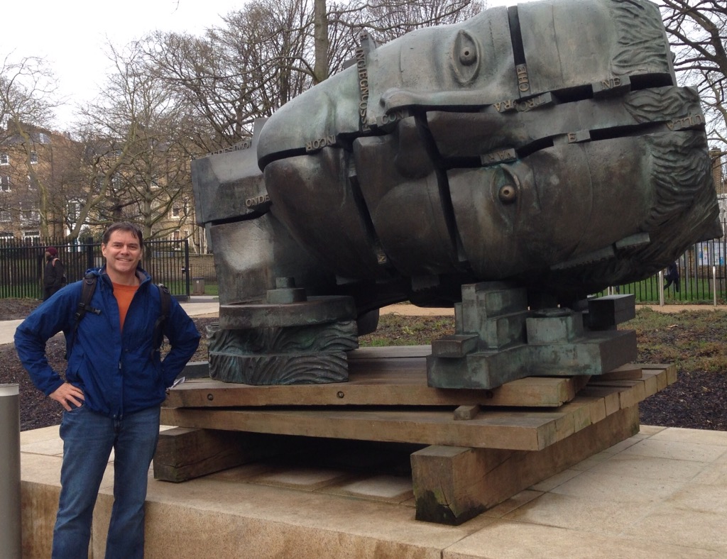 We have made it into London a few times as well. We have the best of both worlds. We are living in a lovely residential area but close enough to pop into the big city. Our first trip into London was to the Kensington area to find a big head sculpture that we had seen in a brochure. All we knew was that it was suppose to be near the High Street Kensington tube stop. We checked in the station, outside of the station, in a couple of nearby parks, and at City Hall and the library without luck. We even asked a few passers by, but they didn’t know either. Bob finally asked in the library, and they suggested we check the School of Design a few blocks away. So you can thank a London librarian for the photo below.