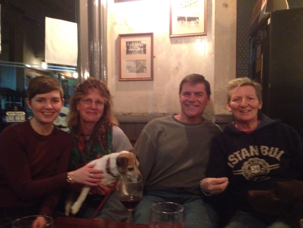 Bob and I with Rae and Bev (and Zoe and Charlie) in the Red Lion Pub across the street from where we housesit