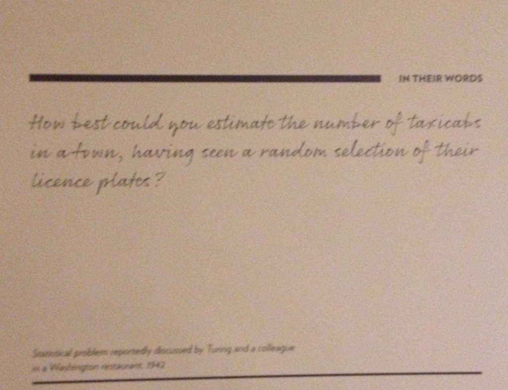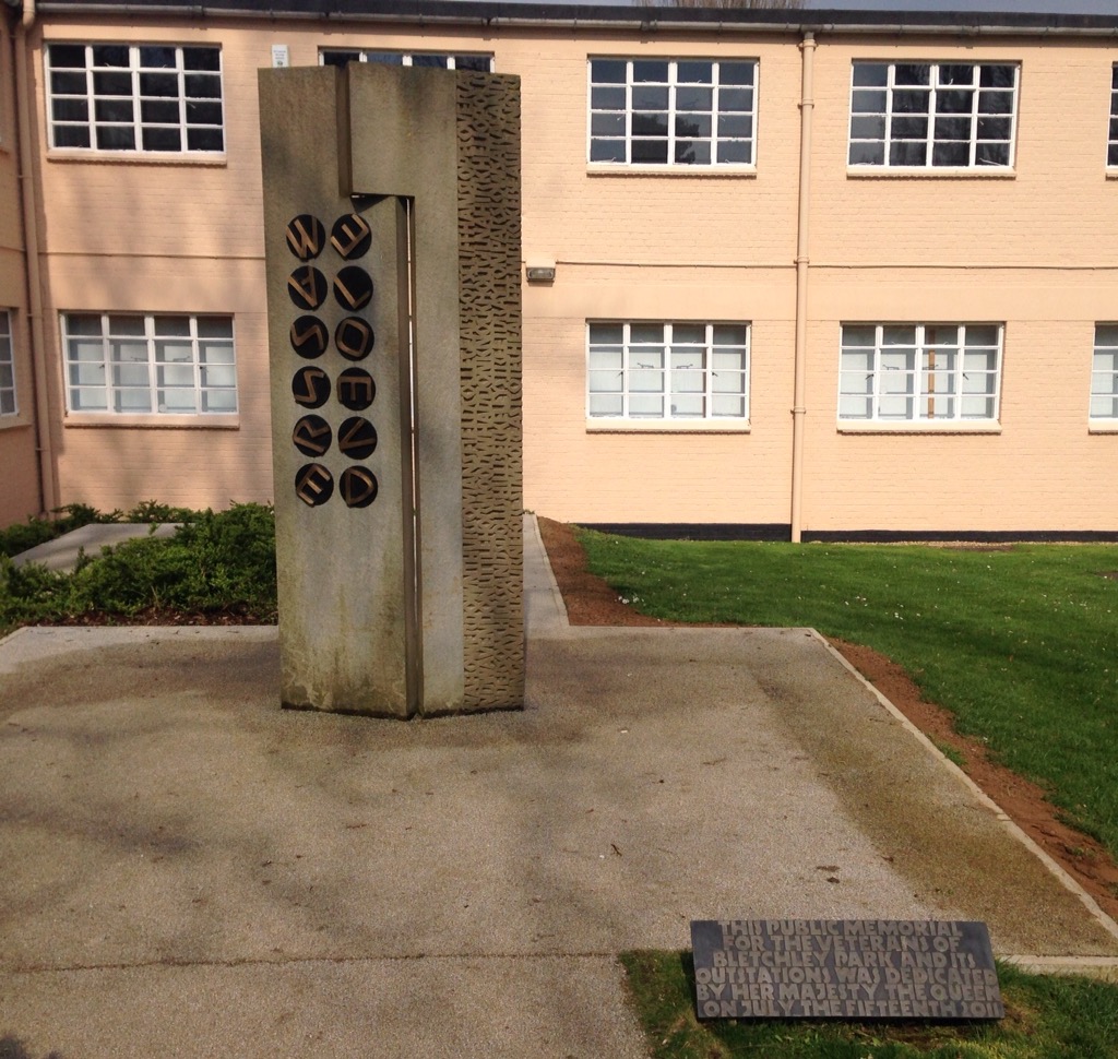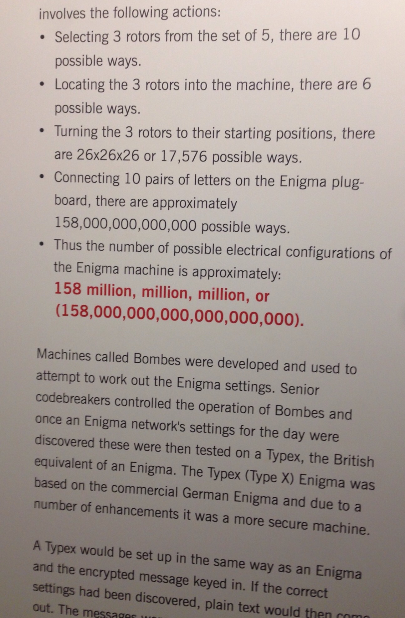 The welcome sign with the code logo that is repeated throughout the tour.Cool sculpture to the code breakers to recognize the fact that they also served during the war.The focus of the code-breaking efforts was to intercept messages from the Germans being encoded and sent over teletype and try to decipher the code, translate the message into English, and then get the information to the right people in the field. This board shows the difficulty of just the decoding part of the operation!One of the huts in which the code breakers worked. People working on various efforts were kept segregated so that no one would have the complete range of information.Bob and I don’t like to brag on ourselves, but this is the type of question we like to ponder in the evenings.One of the cottages that the workers lived inEveryone loves a good secretThe Bletchley Mansion that provided space for the administrative offices during the warA fountain and pond on the property of Bletchley Park