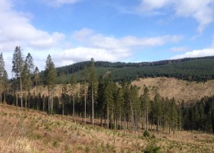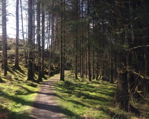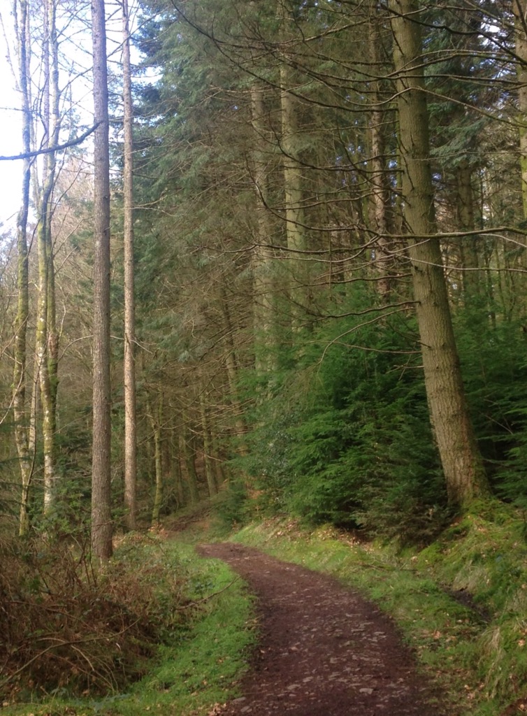 Heading into the woodsA creek runs through itA view of Drumlainrig CastleThe view just keeps getting better!The castle from below at the end of the hikeToday (Tuesday) we did another forest hike. This time we headed towards the little village of Ae (yep, just the 2 letters) to hike a little over 5 miles in the Ae Forest. Bruce accompanied us on a lovely, sunny day out. We saw a number of people — mostly families enjoying the mountain bike trails — but no other hikers or dogs.