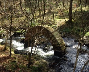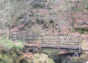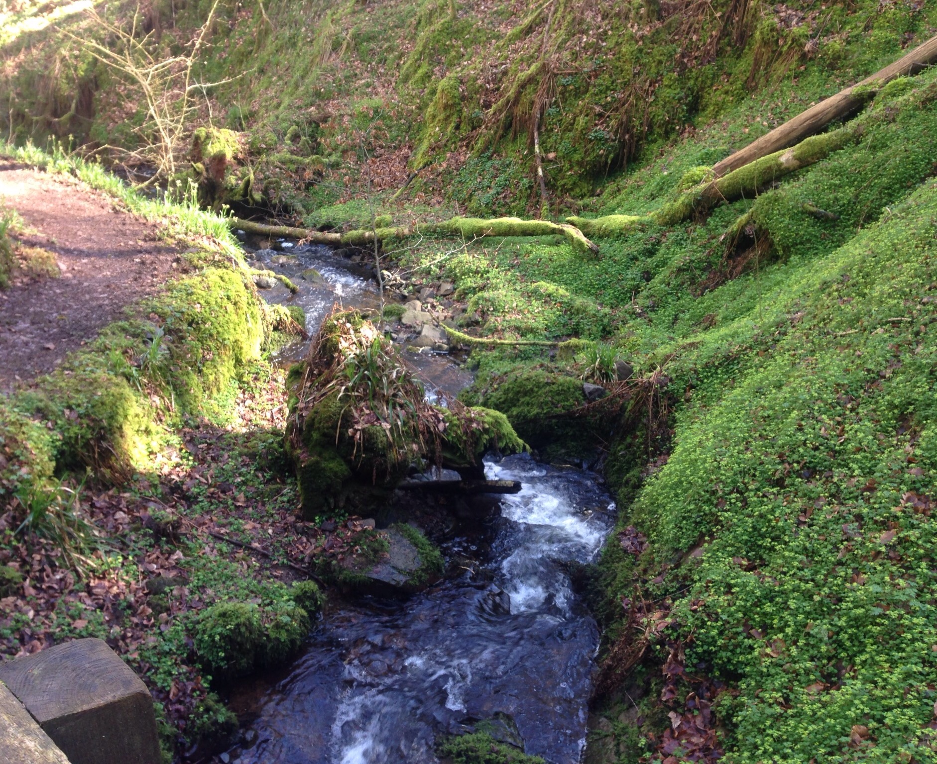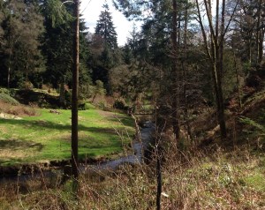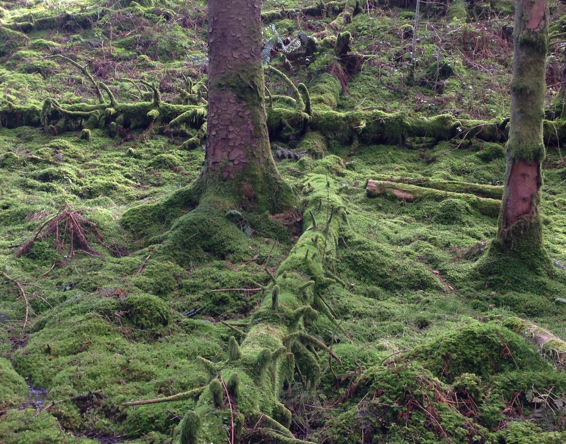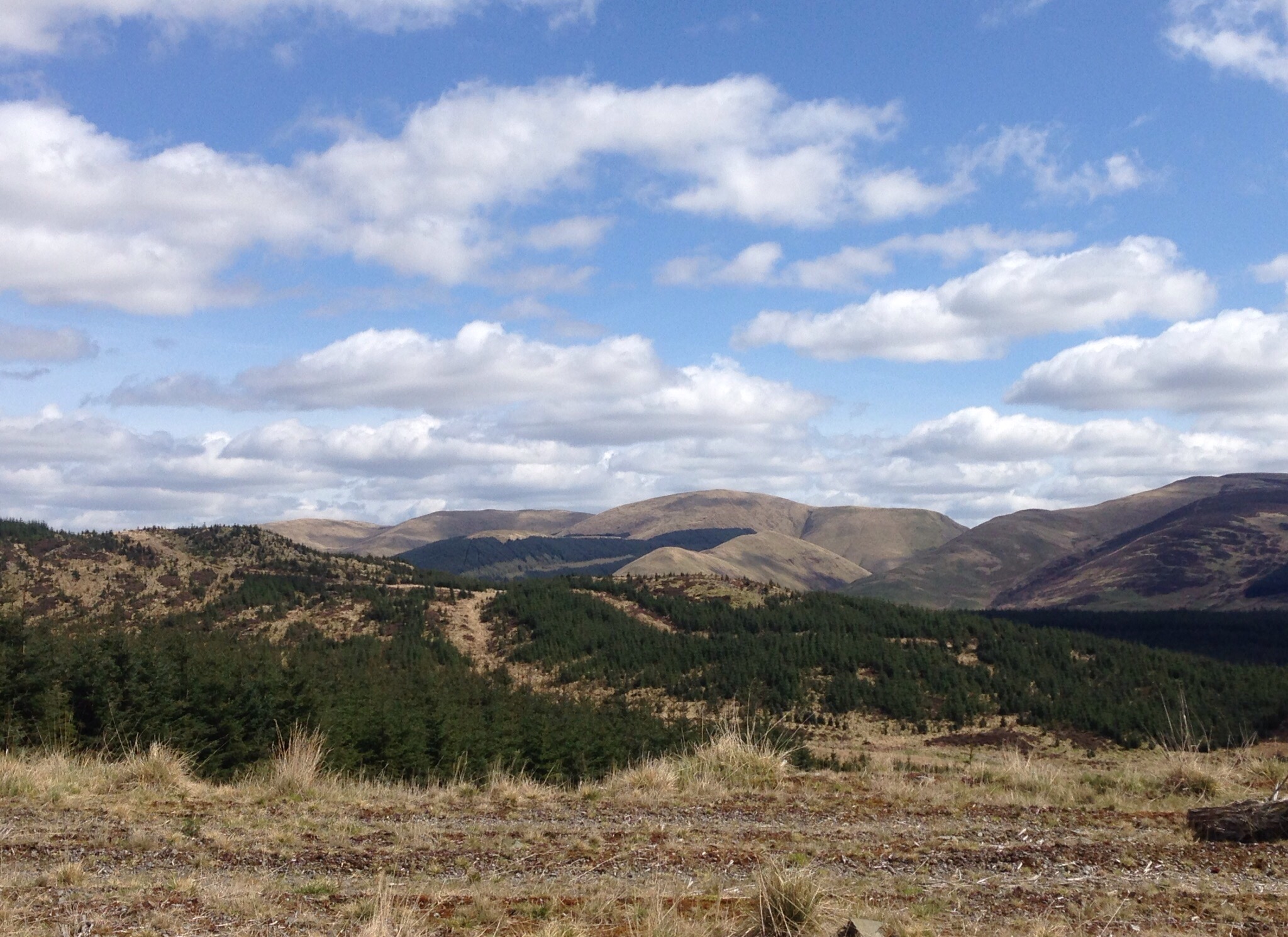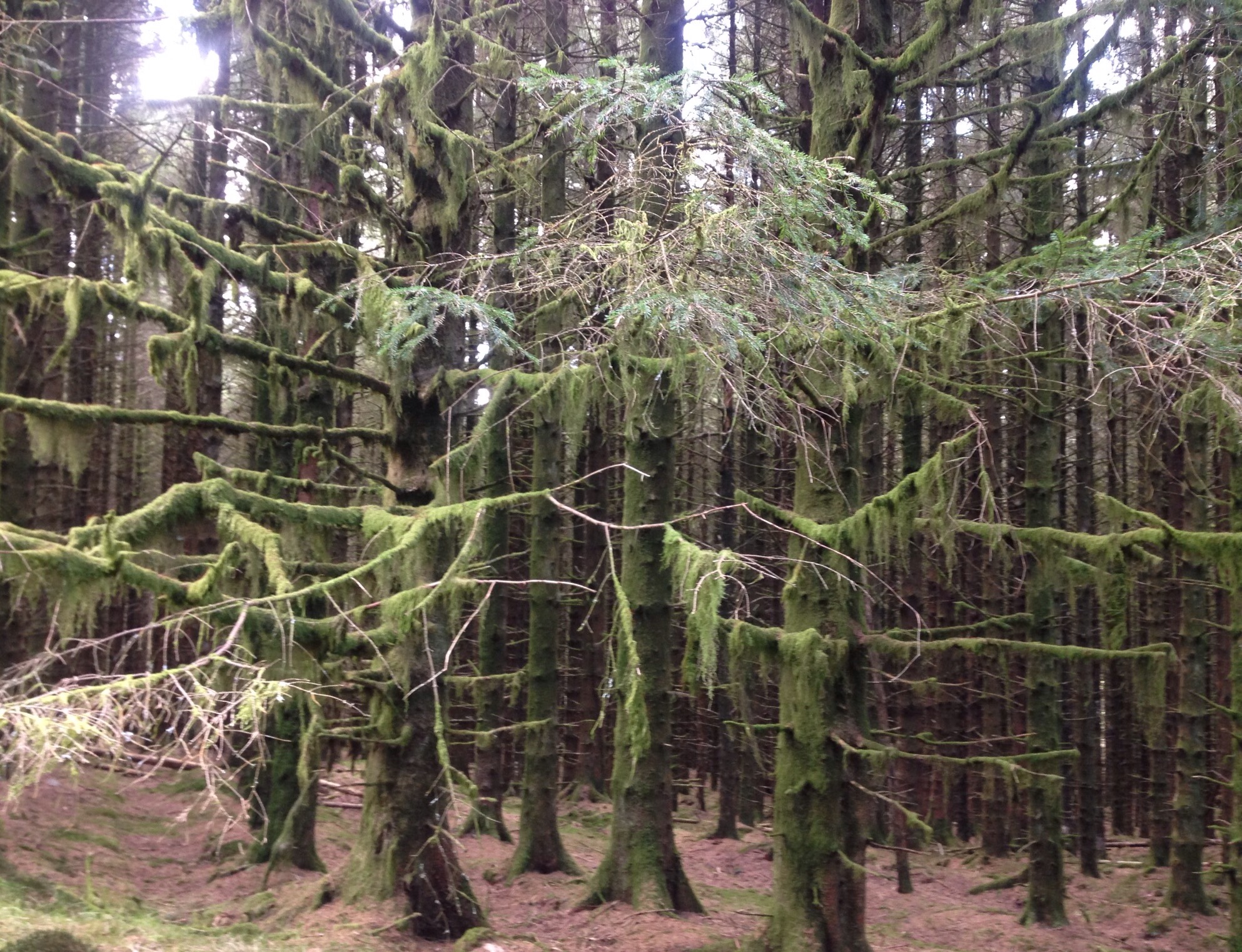 Crossing a creek on our way out of townLooking at the forest to which we were headingA marker by the stile heading into the forestThe forest path — so far so goodMossy trees that appear to danceThe view from the top of the hill where we lost the trail and finally decided to head back the way we cameWalking back into Moffat