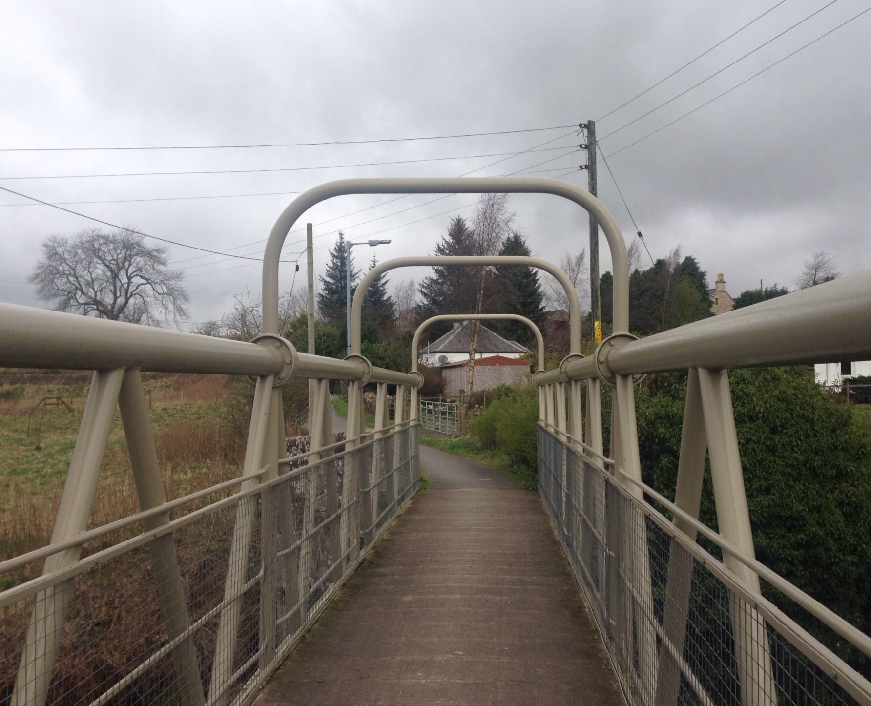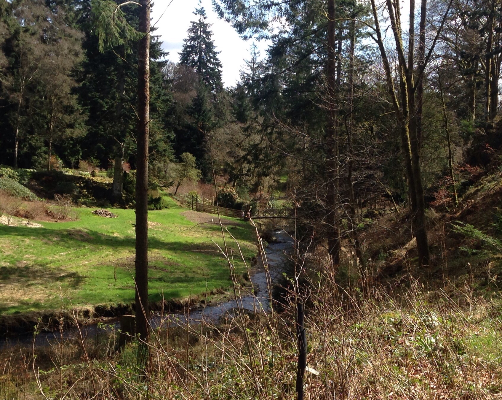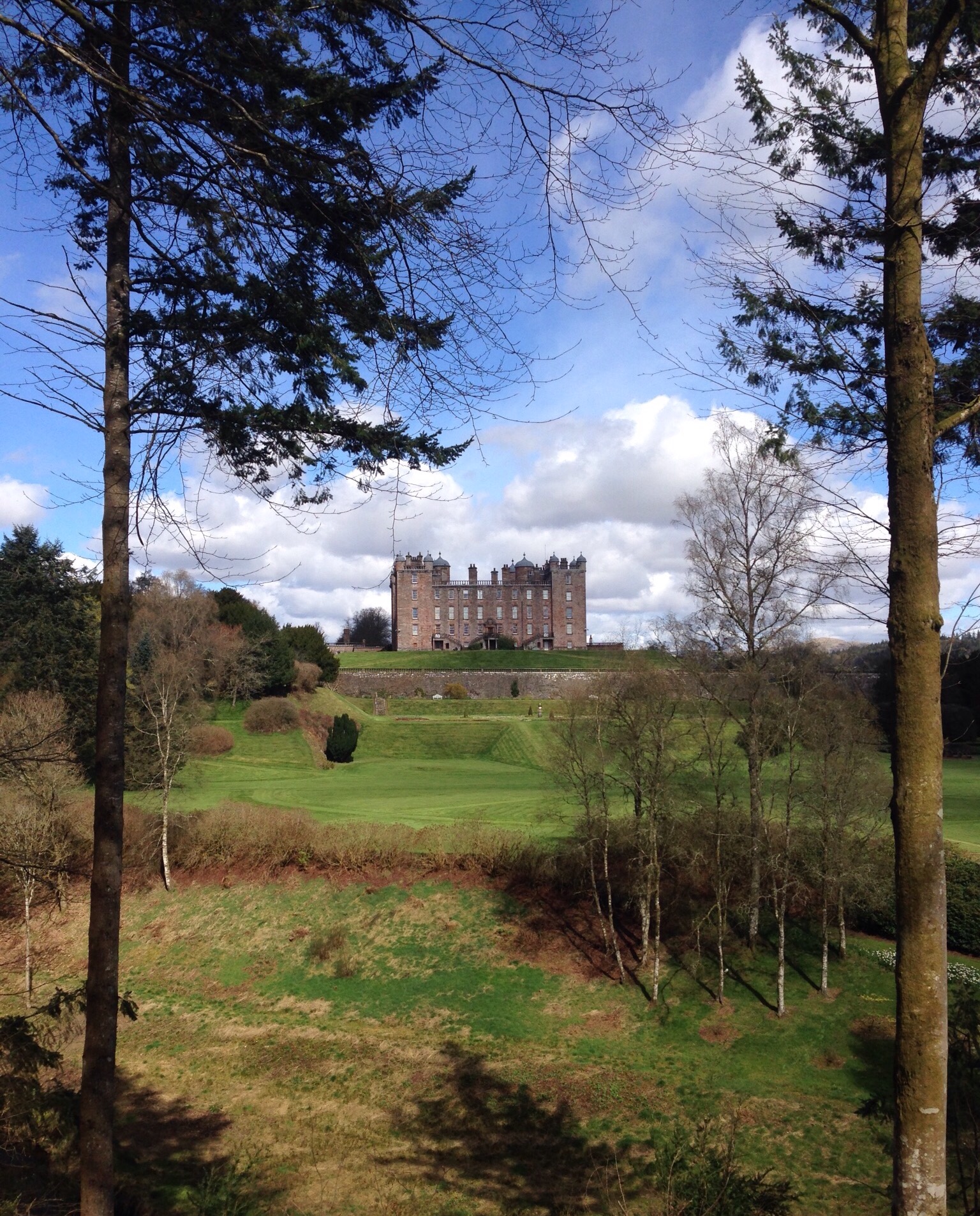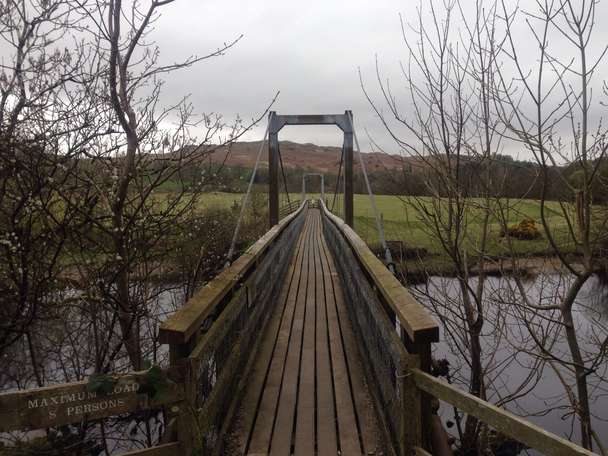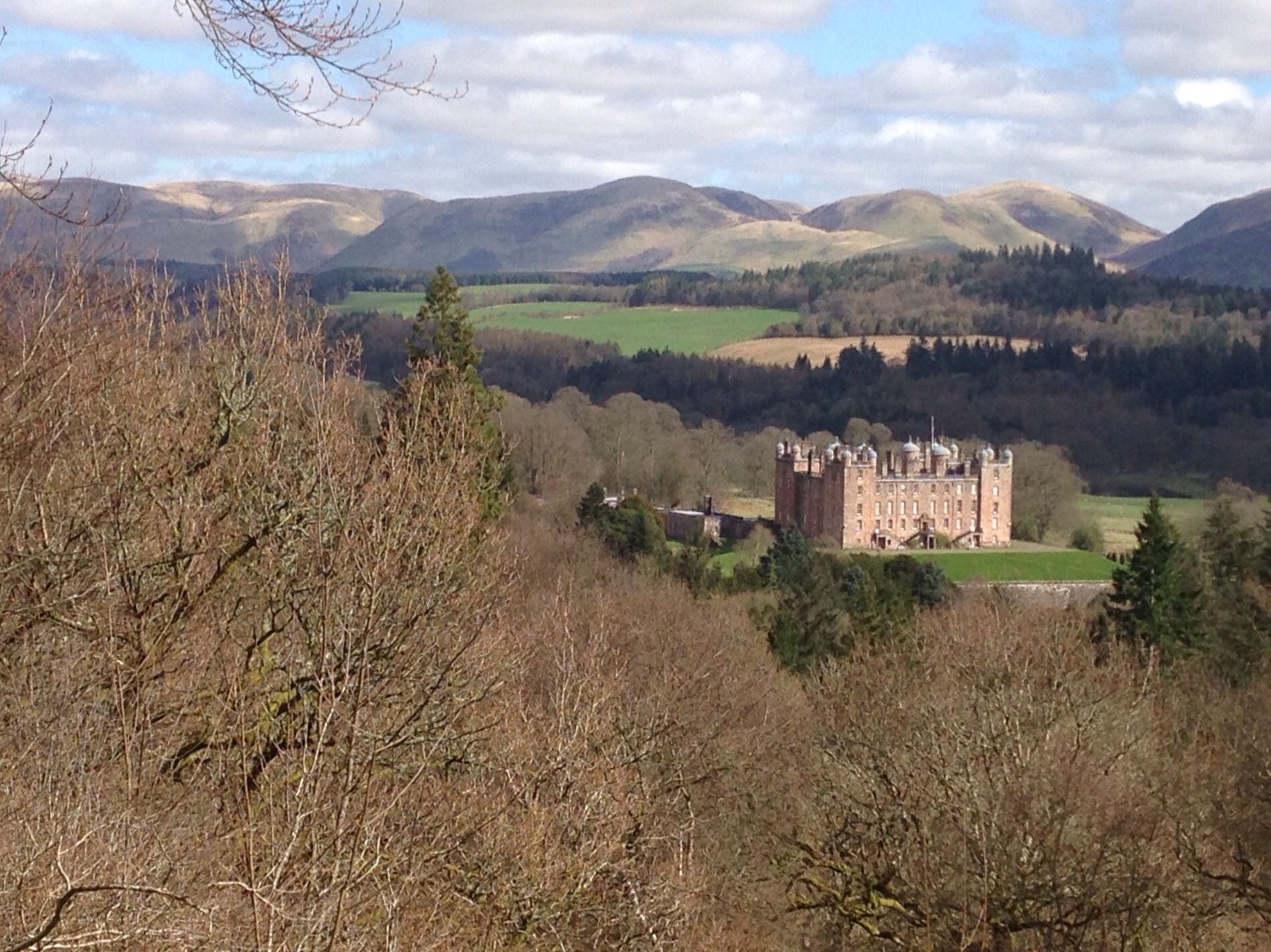 Walking out of Thornhill on the path to Drumlainrig Castle along the River NithContinuing on to the castleWe love the Scottish landscape!Bob and Bruce leading the wayThe Leaping Arch along the Marr Burn TrailBob and Bruce crossing a bridge along the trailNearing the end of the trail on the castle estateGardens on the castle estateDrumlainrig Castle once again