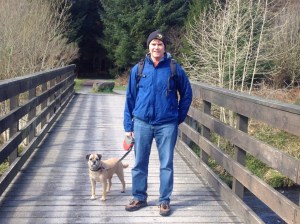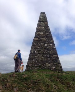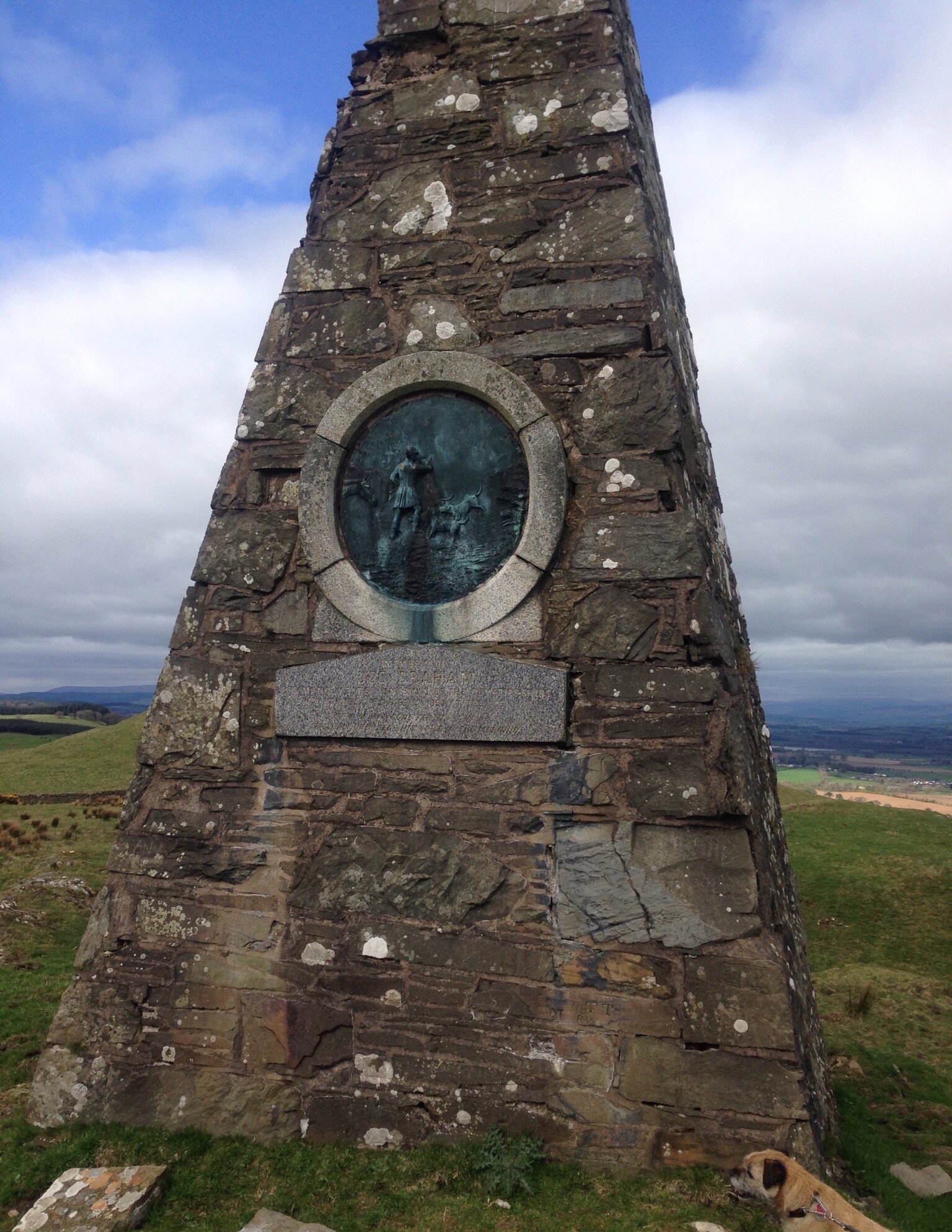 Many of our recent meanderings have seen us returning to places that we have already visited — either this year or last year — but doing different things. Last Thursday, on Bruce’s 6th birthday, we headed out to Lochmaben where we had done a local walk with Bruce last year. Last year’s Castle Walk took us around the Loch to see ruins of a castle and fun sculptures carved from the trees along the walk. This year we opted for a longer out-and-back hike along a portion of the Annandale Way that took us from the loch to Joe Graham’s monument outside of the community of Hightae. (We had also walked a bit of the 55 mile Annandale Way out of the town of Annan a week ago.) It was a great walk that was well-marked, and Bruce showed off how well he is aging!