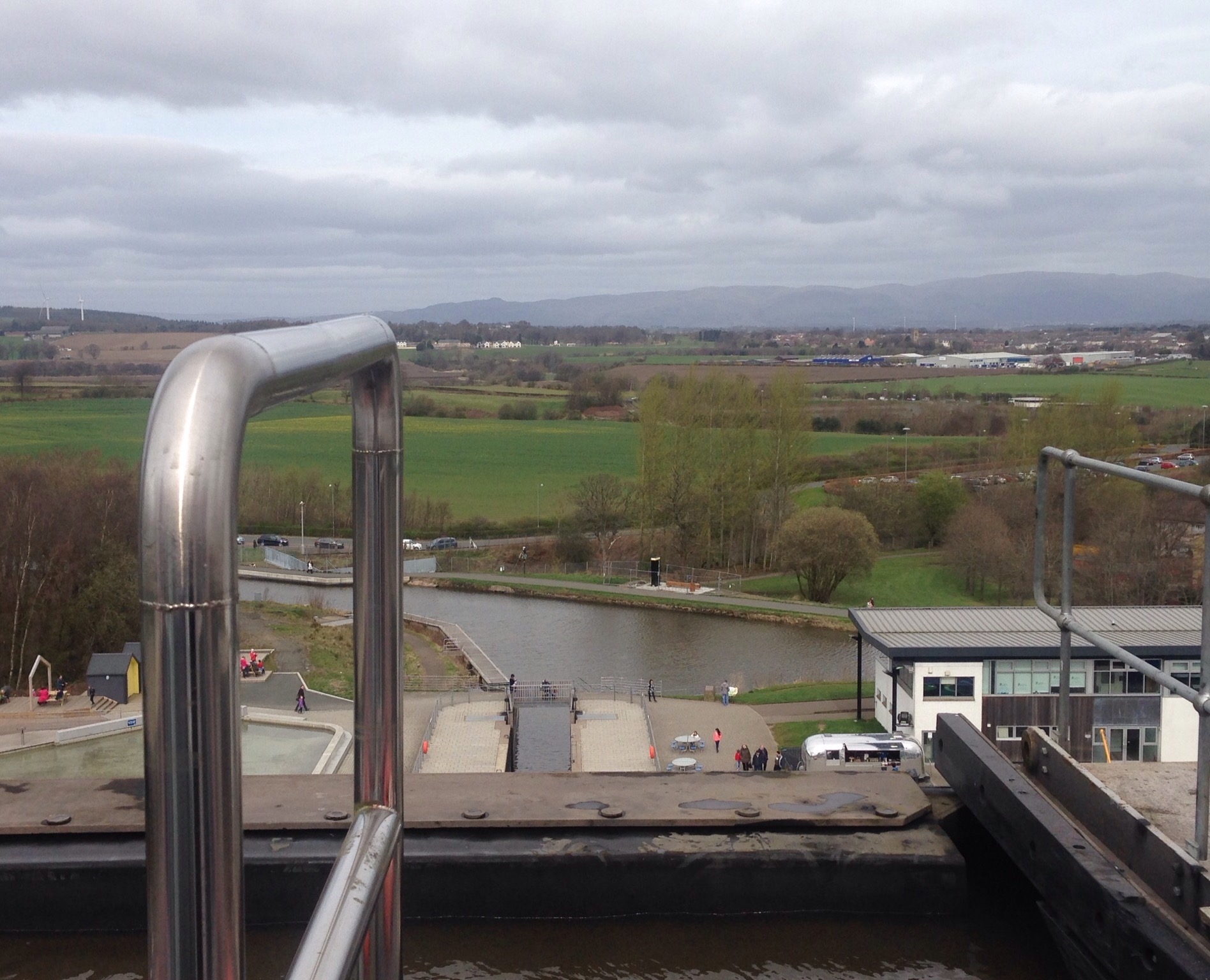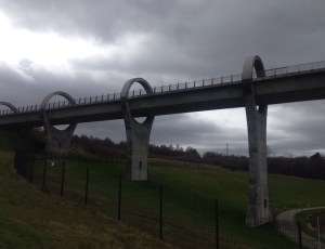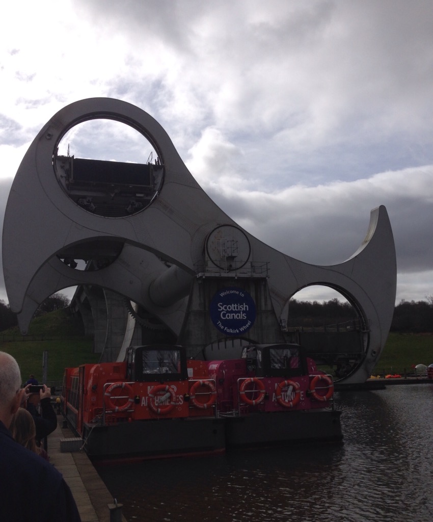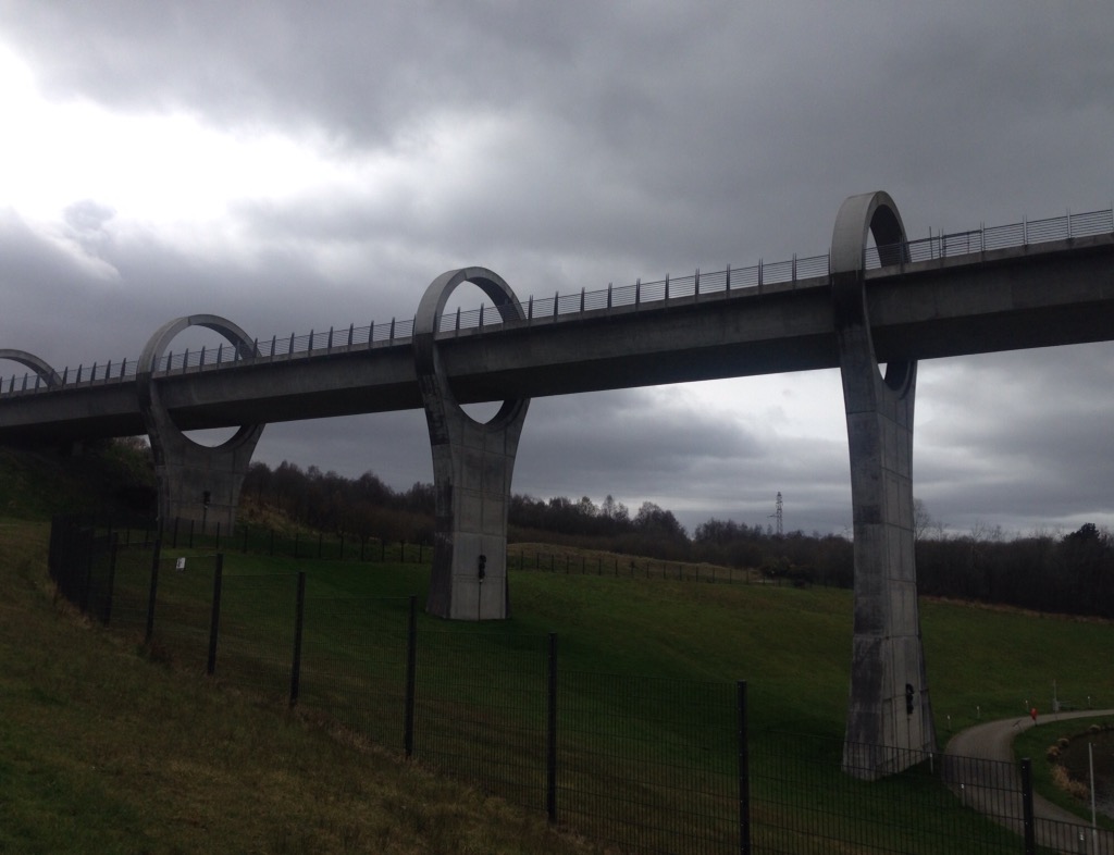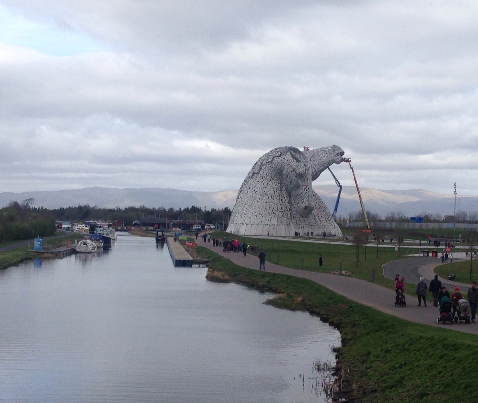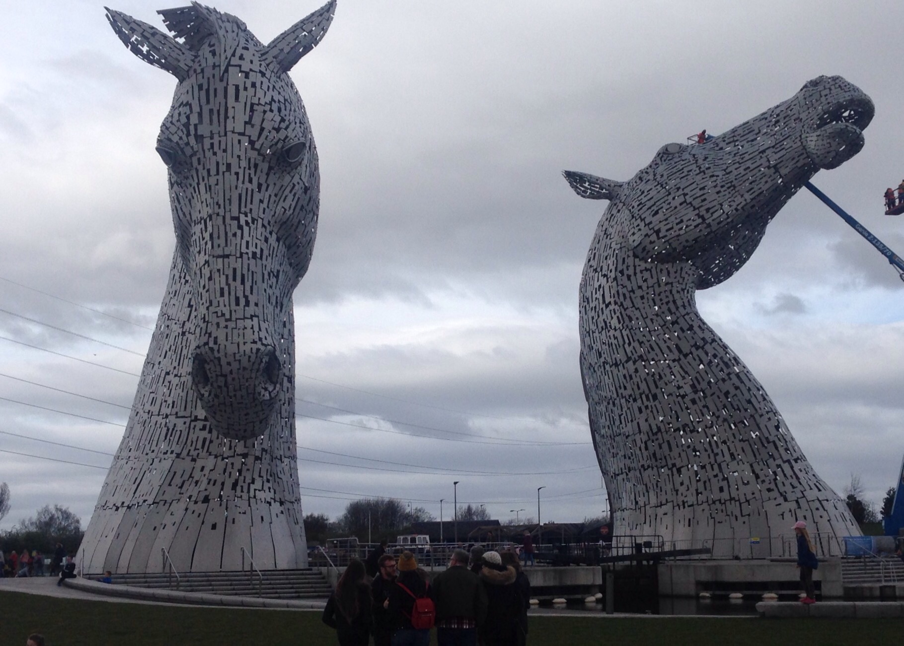On Wednesday we headed out of Thornhill for an hour and a half drive to the town of Falkirk. It is almost halfway between (though a bit north of) Glasgow and Edinburgh. To help capture some of the tourists visiting the two larger cities, Falkirk has created some of its own attractions. One attraction also helps to reconnect Glasgow and Edinburgh for boat travelers. The other attraction is a pair of large horse-head sculptures, called the Kelpies, as part of the Helix project to create a local green space for the community. They are located about 15 minutes apart by car.