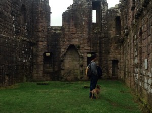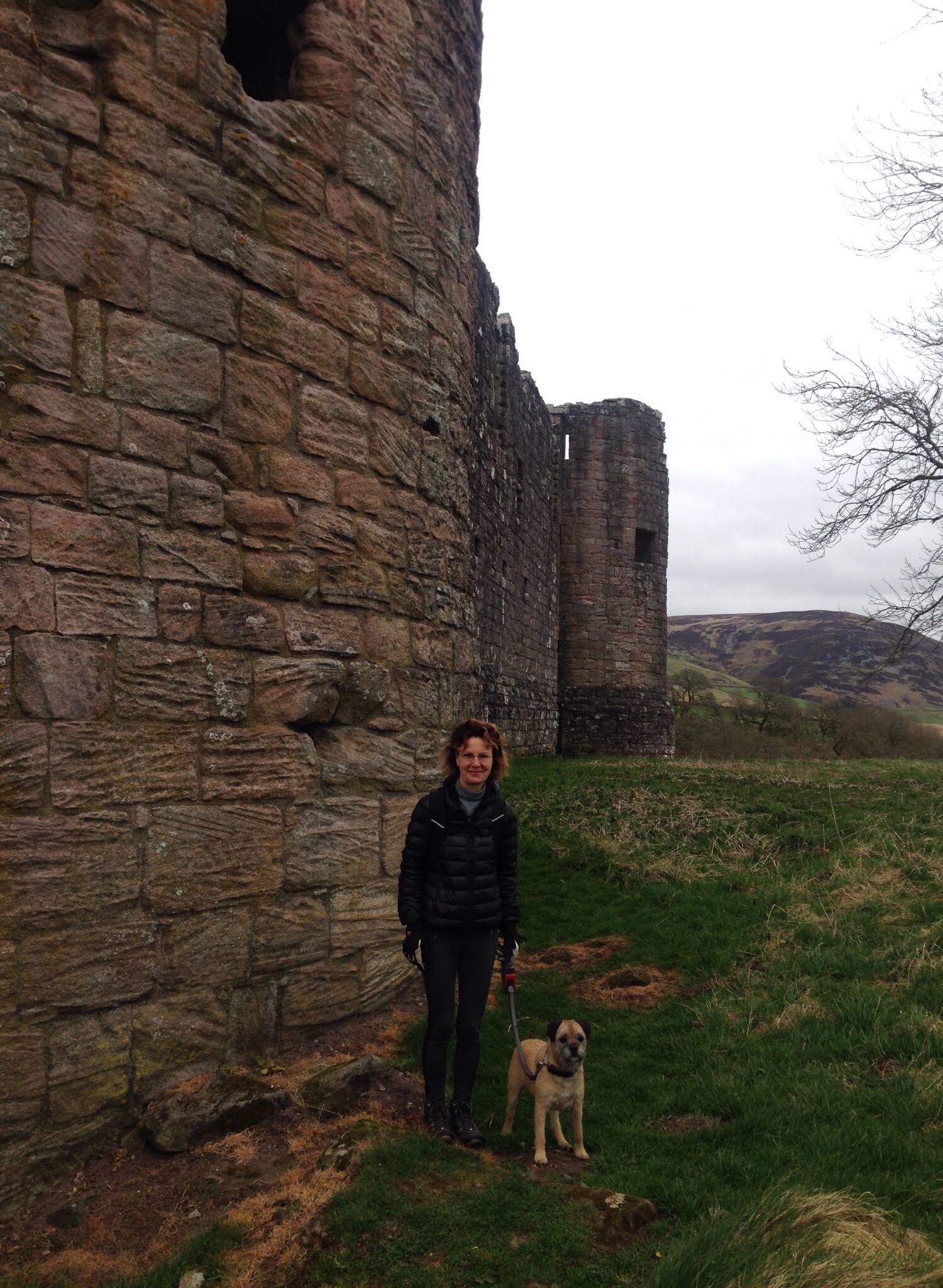 Last Friday, after Bob and I took Bruce to the vet for his allergy shot (no flinching or yelping — such a good boy!), the three of us had a good walkabout to the ruins of Morton Castle. This castle is located about 2.5 miles from Thornhill. It was built sometime between 1270 and 1307 on land belonging to Thomas Randolph, the first Earl of Moray.