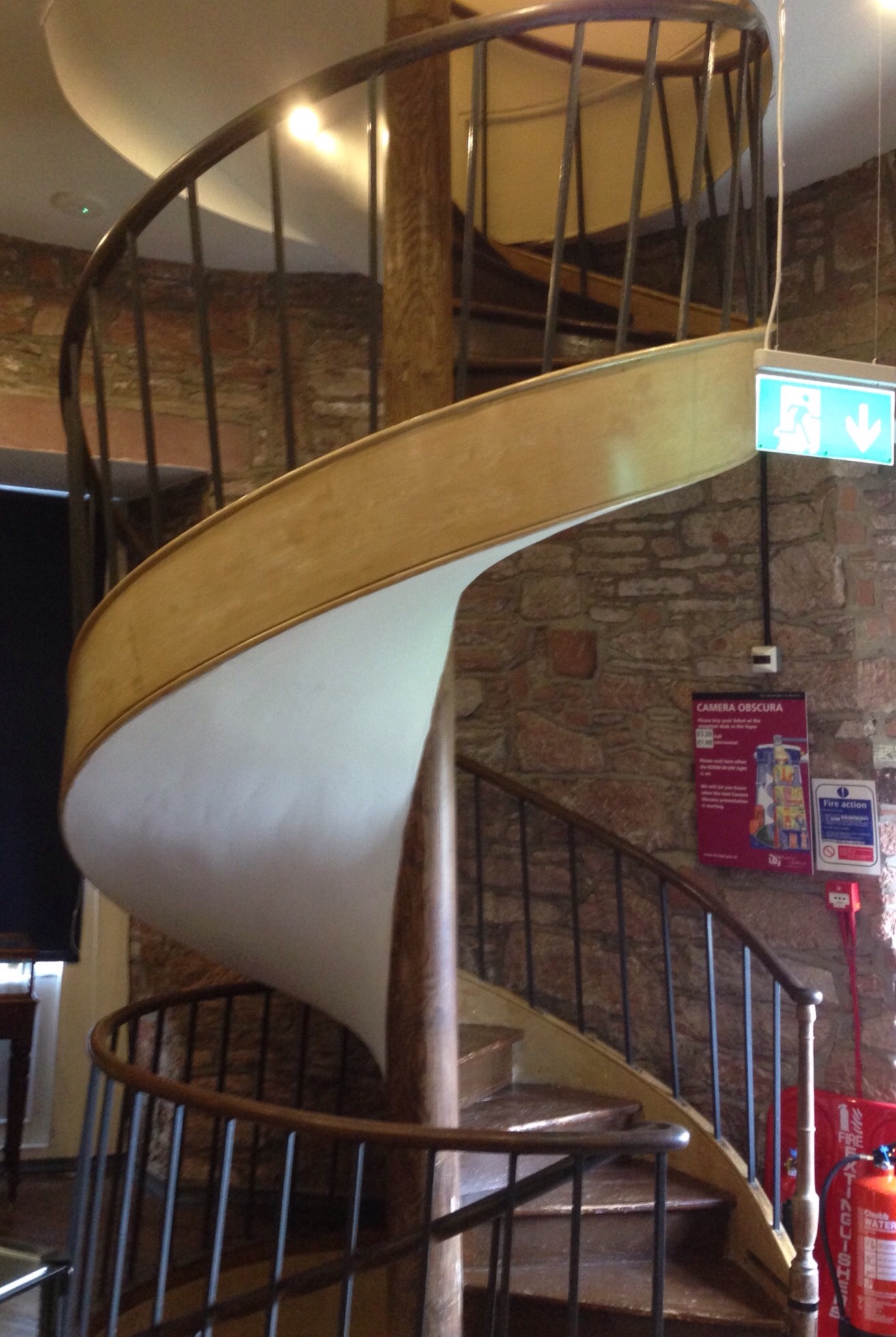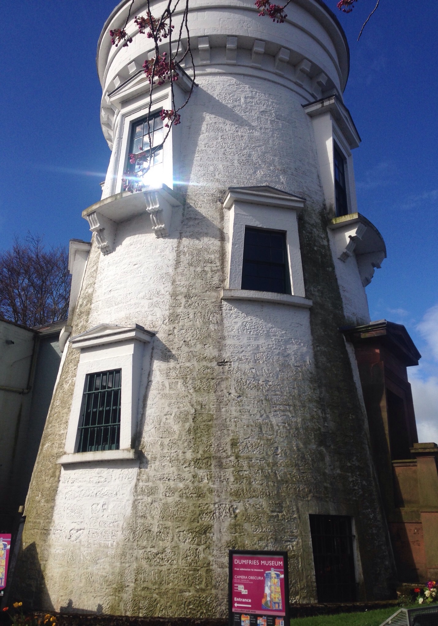 View of Dumfries across the River Nith on our way to the museumThe old windmill portion of the Dumfries Museum which contains the Camera ObscuraBob and I paid the 3.5 pounds to see a 360 degree view of Dumfries via the camera obscura. This may be the oldest camera obscura still working anywhere. It was installed and has been in continuous operation since 1836! Neither Bob nor I could imagine what the individuals in that time must have thought of such a thing. While some neighbors worried about being spied on, a current day visitor (not really getting what he was looking at apparently) wondered how it could be in color and not black and white.The stairs up to the camera — the center pole is not straight so the stairs up get progressively narrower as you ascendOne of the exhibits at the museum and something we had also learned about during our visit to Sanquhar — traditional 2-color patternsGreyfriars Kirk on our walk to the Arts CentreThe first exhibit inside the Arts Centre — who is that attractive woman looking back at me?Lawn art