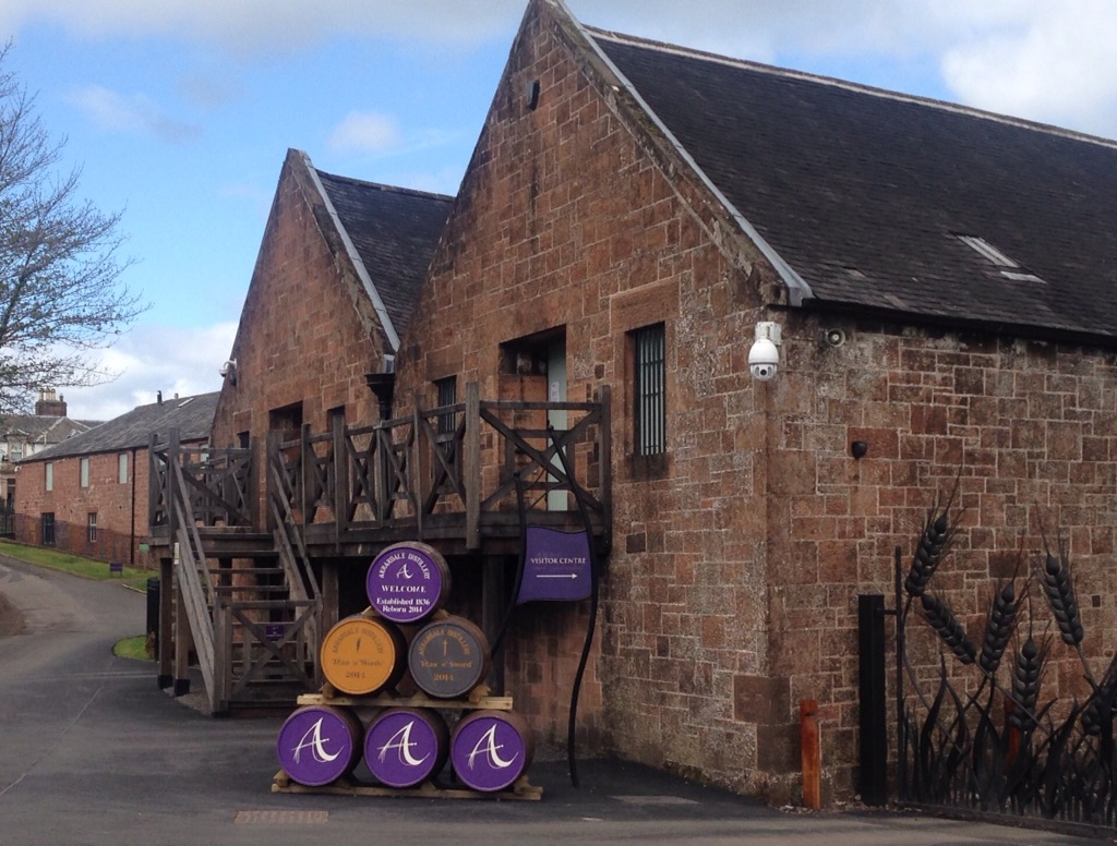 The Annandale Distillery marks the rebirth of a distillery on a site that had been dormant for almost a century. The historic distillery has been through 3 whiskey making eras and a period when it was used for farming. It was formerly a Johnnie Walker distillery which closed in 1918. After a 10.5 million pound restoration (beautiful — especially the woodwork!), it reopened in November of 2014. Since Scotch Whisky must be aged for 3 years, the distillery will release its first whisky this November — one smoky (peated) and one smooth (unpeated). In the meantime, they are giving tours, operating a beautiful tea room, and selling liqueur that doesn’t have to be aged as well as other gift items.The end of the distillery nearest the parking lotThe renovated distillery (tea room and shop on left)The process in actionParts of the original distillery uncovered by archeology students