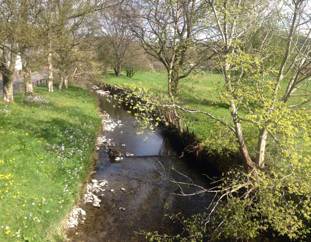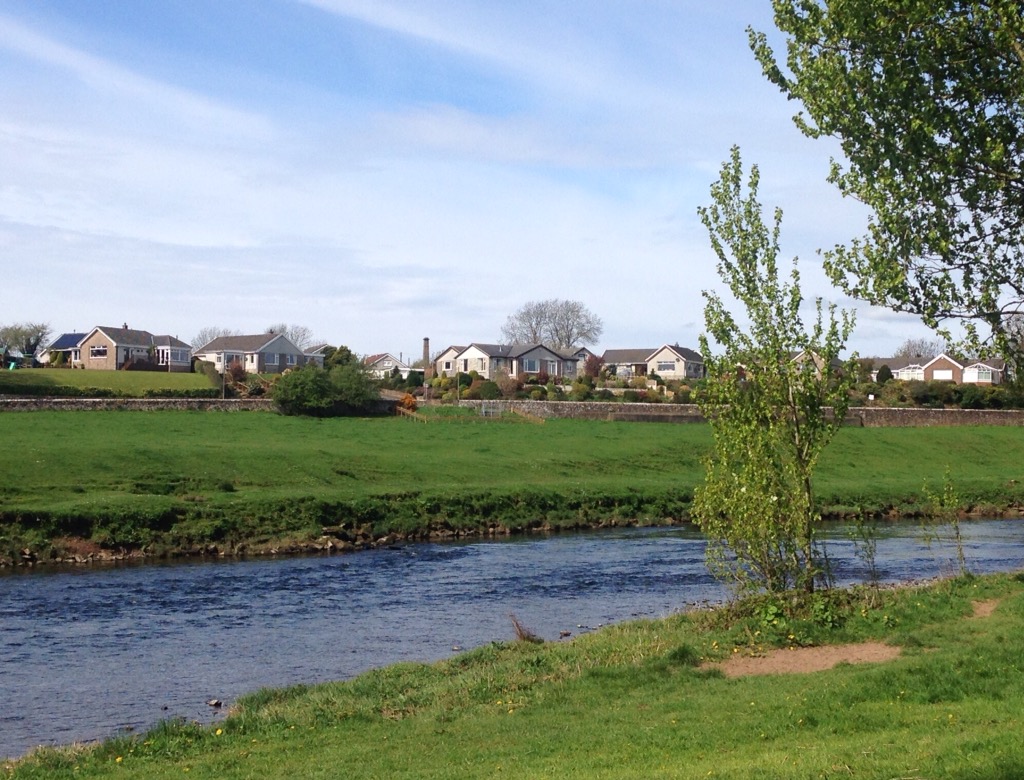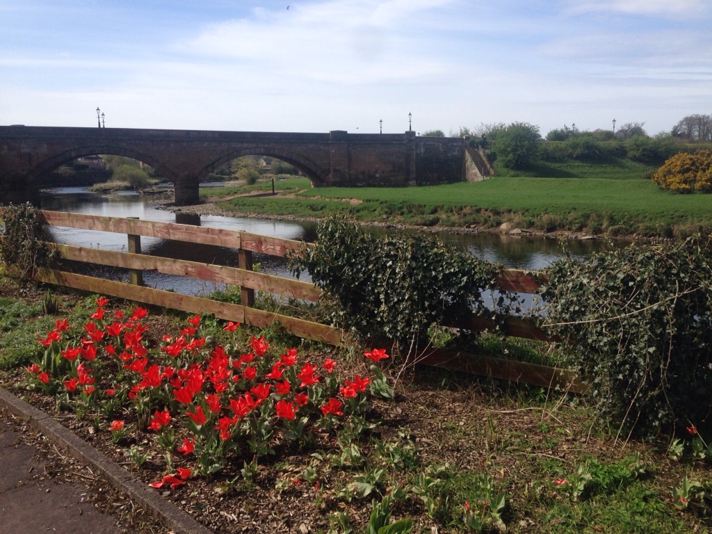 Houses along the riverThe start of our walk near the bridge in AnnanTrees in bloom along the pathA small dam along the riverA creek and trees along the walkAnnan’s Town Hall with a Robert the Bruce statueHigh Street of AnnanOnly in Scotland — a mash-up of Robert Burns and Che GuevaraA boat near the Annan HarborNot a Texas bluebell