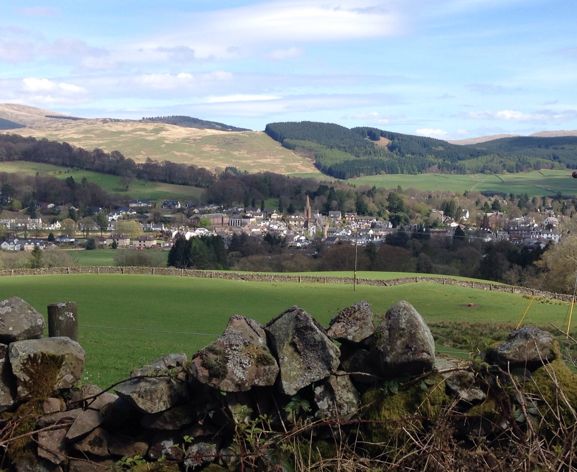 Last week as Bob and I left the Grey Mare (waterfall) to drive to Locherbie, we passed the town of Moffat. We went back yesterday for a visit. We were charmed! It is apparently a tourist town that is also a Dark Sky Community (promotes stargazing) and the first Walkers are Welcome town (walker-friendly) in Scotland. It has a number of walking trails, hotels, a lovely park, and a nice retail area. We loved it despite having an up and down weather day that included a bit of hail during our hike!