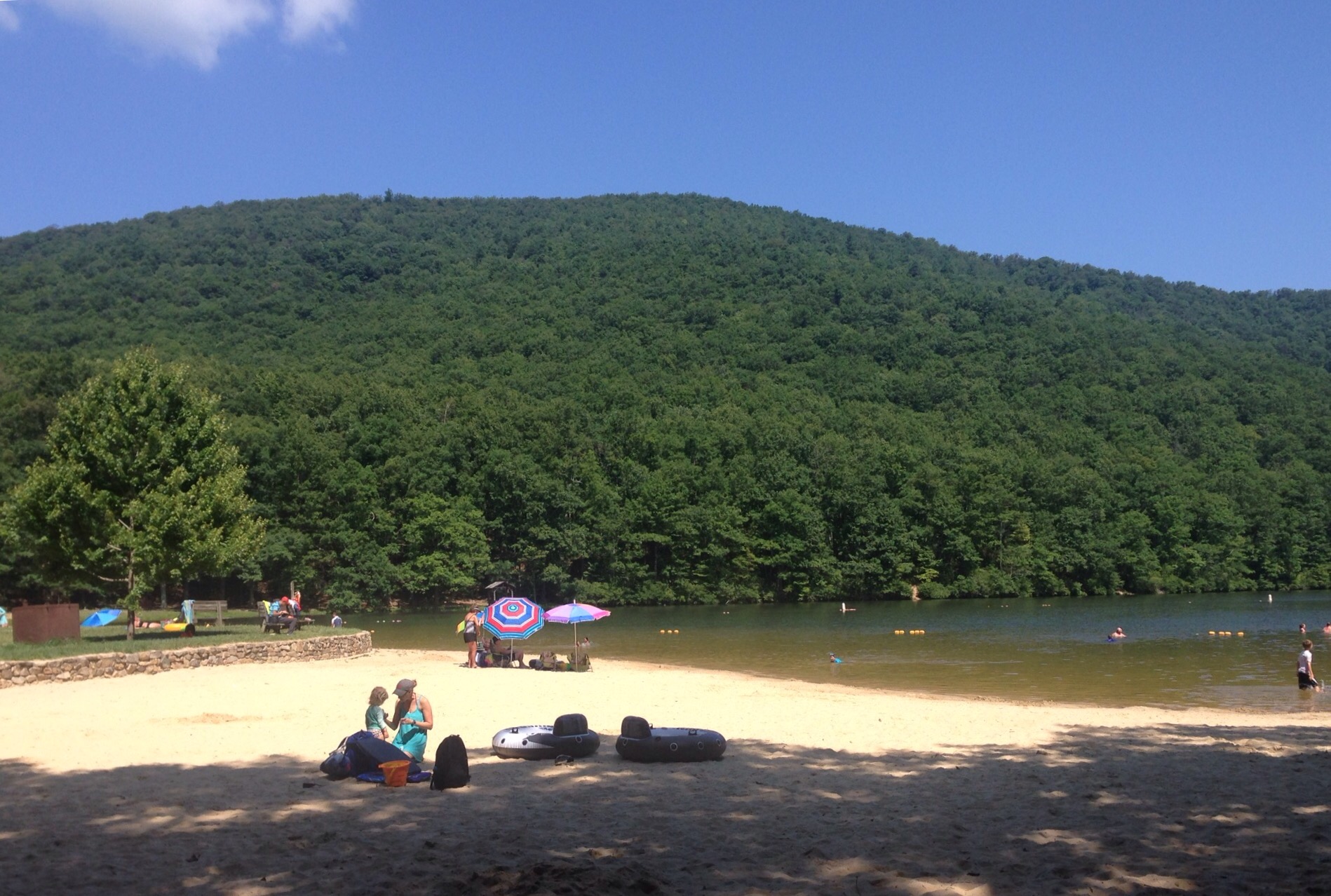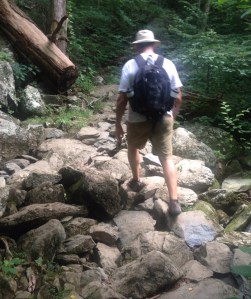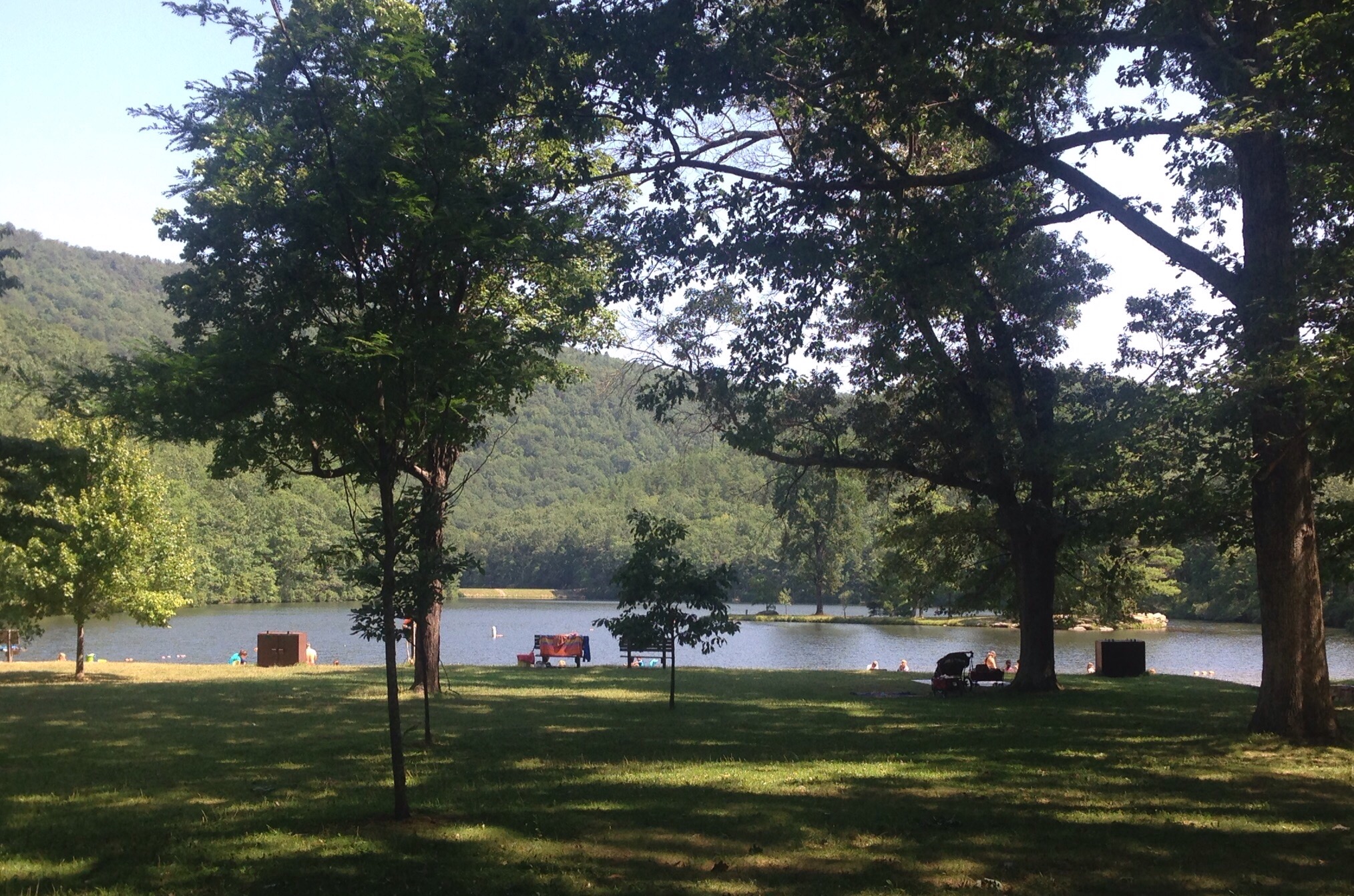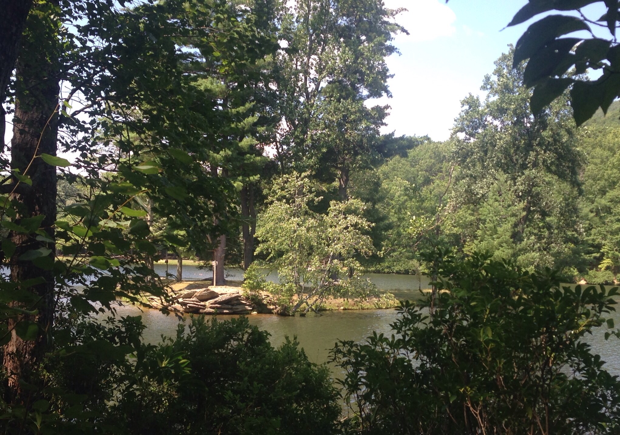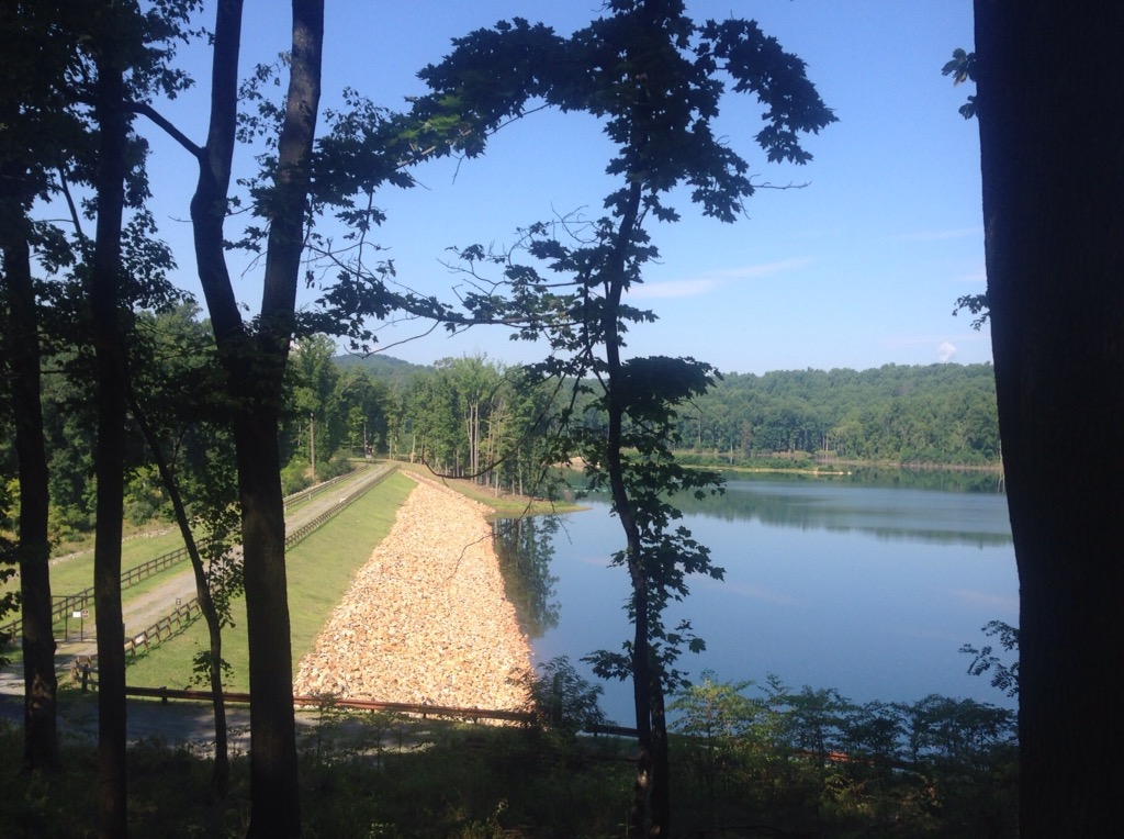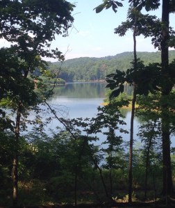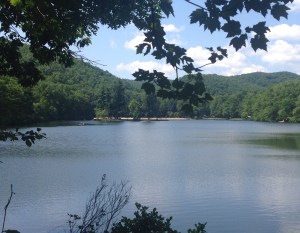 On Monday, we traveled about 45 minutes southwest out of Charlottesville to the Sherando Lake Recreation Area. This is a beautiful park in the Blue Ridge Mountains where you can swim, hike, picnic, and/or camp. There were a number of families enjoying the lake, but Bob and I had a great 3+ hour hike by combining a number of trails. It was $8 per car to enter. We have had lovely hiking conditions — temps in high 80s or low 90s with LOTS of shade.