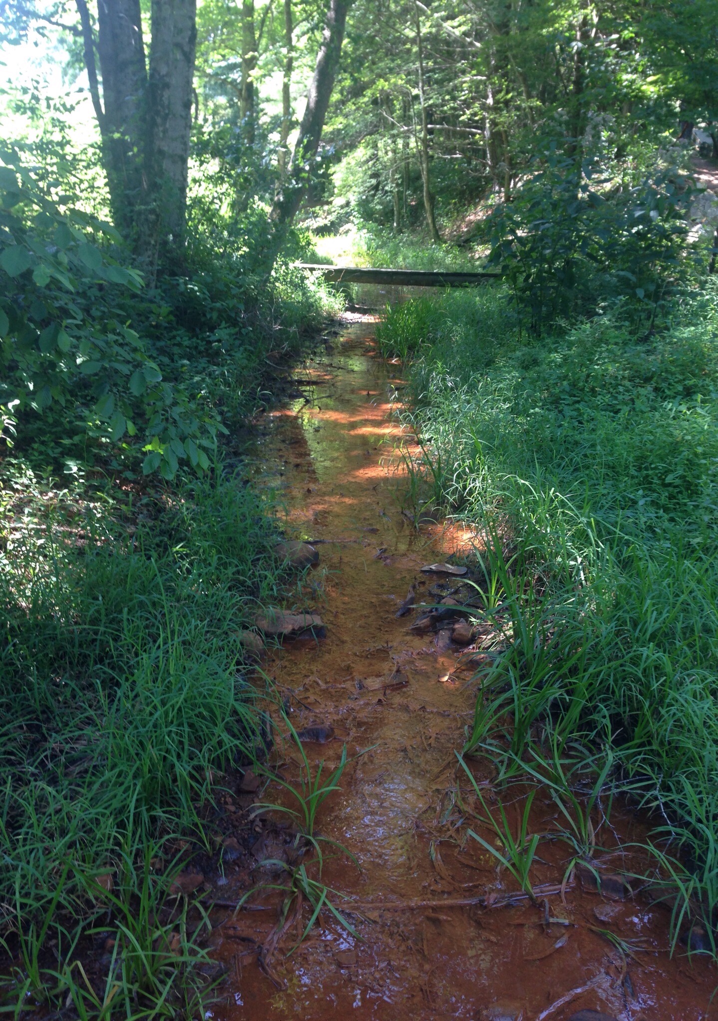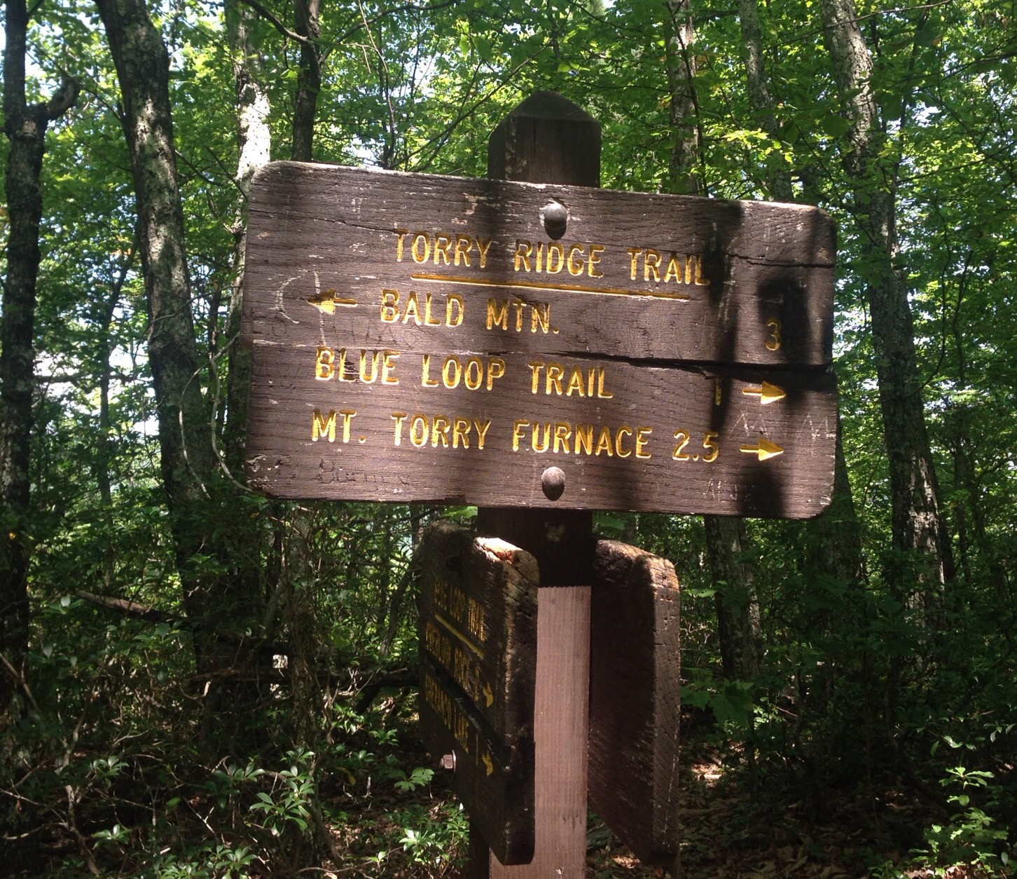 The Bath House near the lakeOur first view of the lakeThe beach and lakeAn island in the lakeRounding the lake and heading into the woods — and hillsCrossing a clear stream that shows this region’s red soilGetting a view of the surrounding mountains through the treesLook at these tree-covered mountains!Connecting with the Torrey Ridge Trail from the Blue Loop TrailWe saw this at the end of our walk — good to know